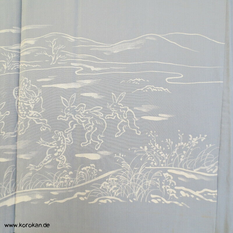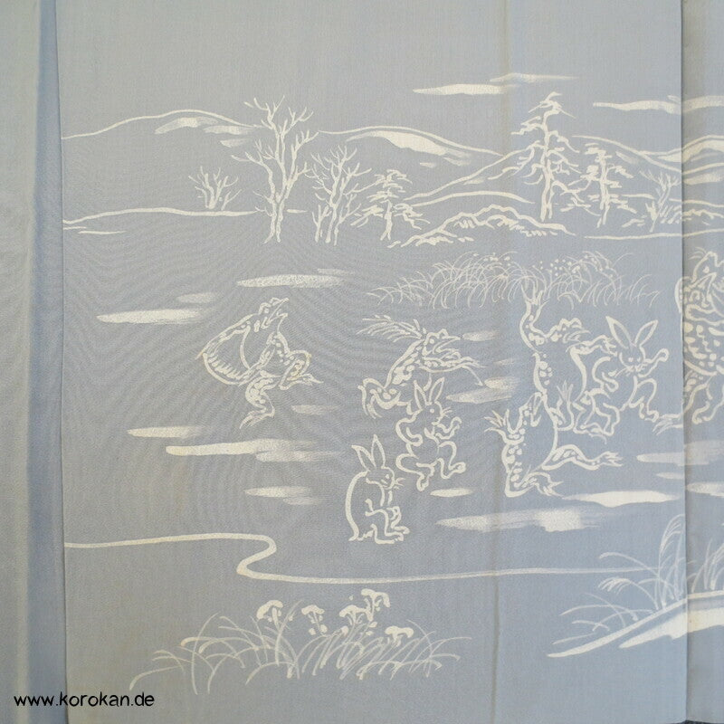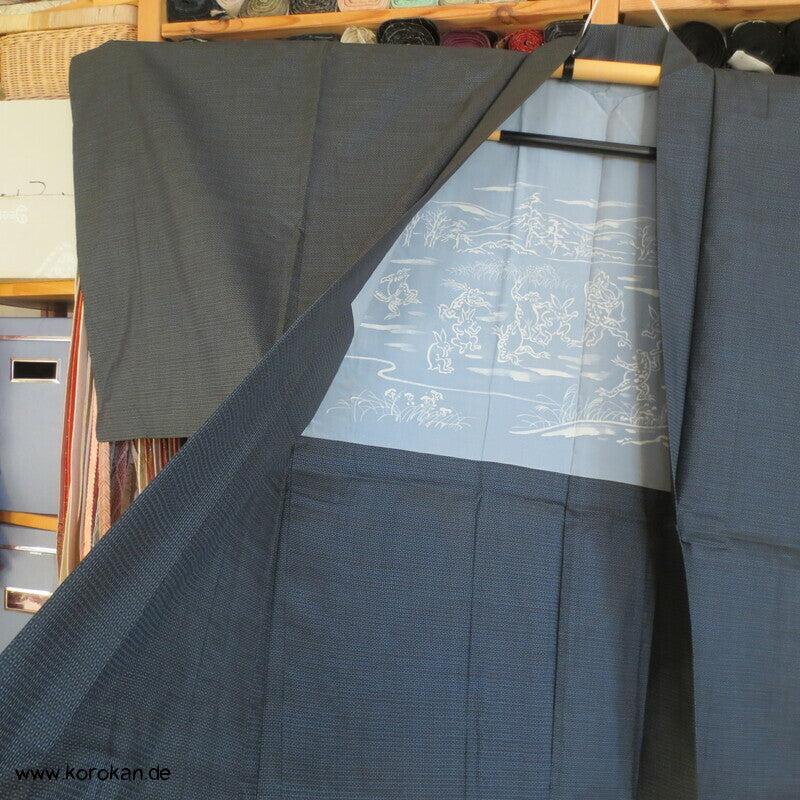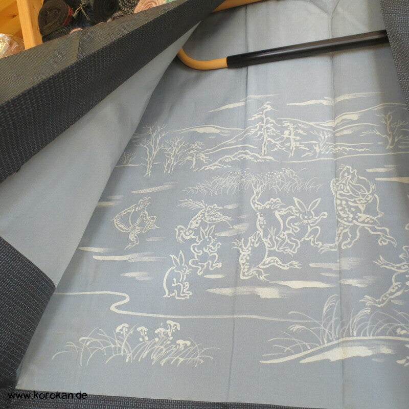 Vintage japanische Männer Haori aus blau - dunkelblauer feiner Kasuri garngefärbter Kikko Tsumugi Seide mit Bildfutter, Chuga Giga Druck in hell auf blaugrau - der älteste Comic weltweit