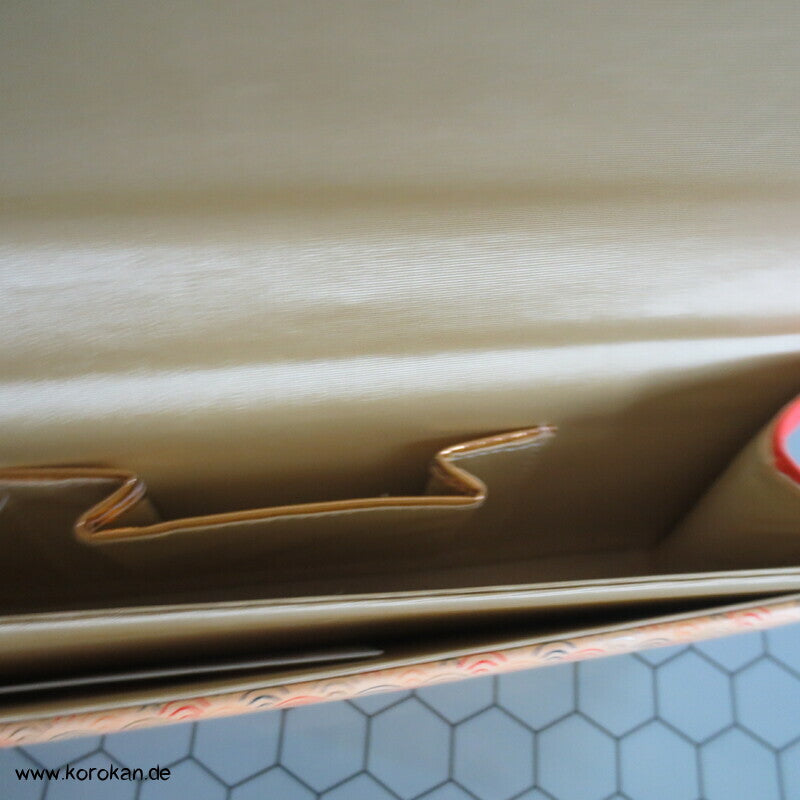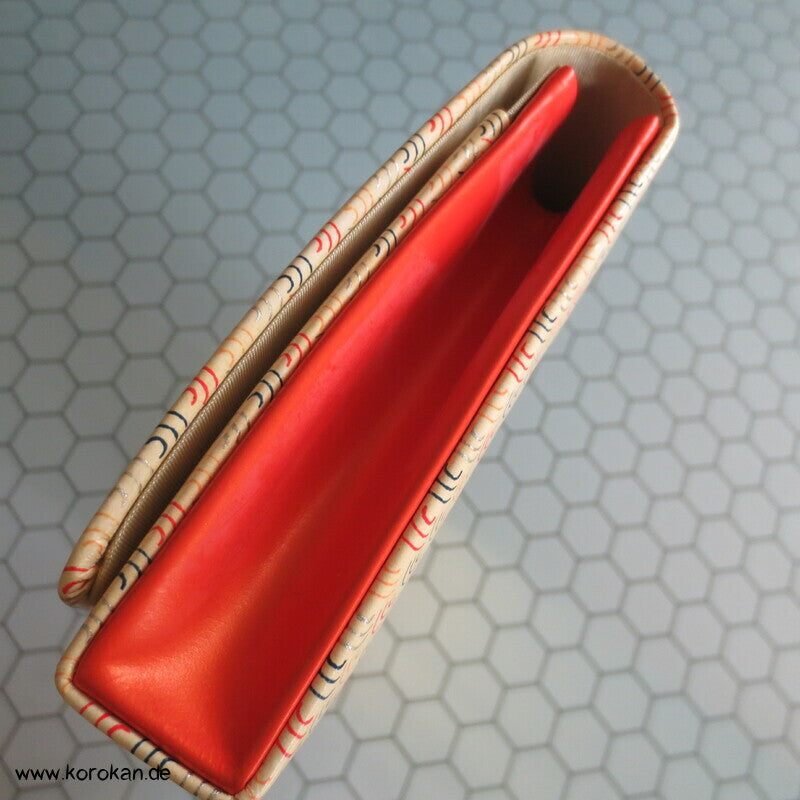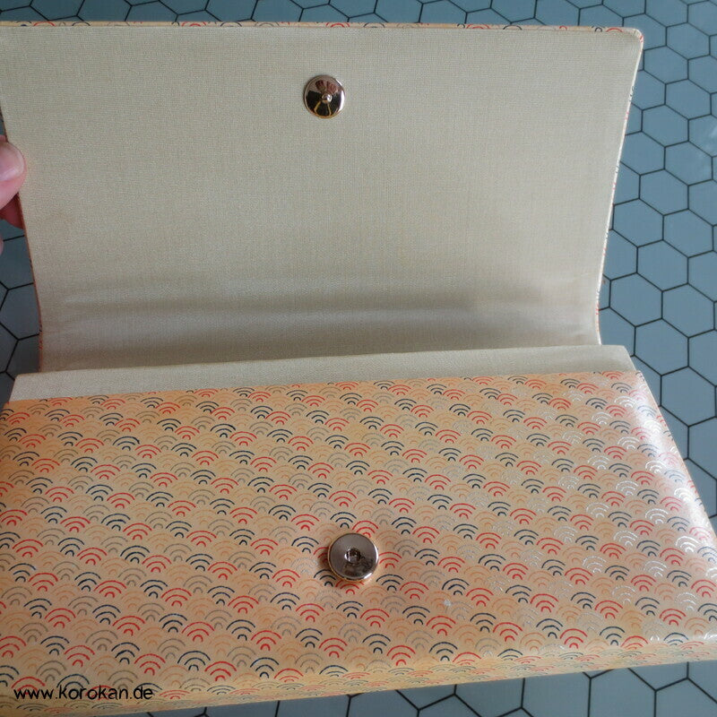 Vintage Clutch Handtasche aus aus glatten Lackleder bedruckt mit bunten Segaiha Wellen mit Druckknopfverschluss und starker Fächerung als Kimono Accessoire, natürlich auch zu allem anderen zu tragen.