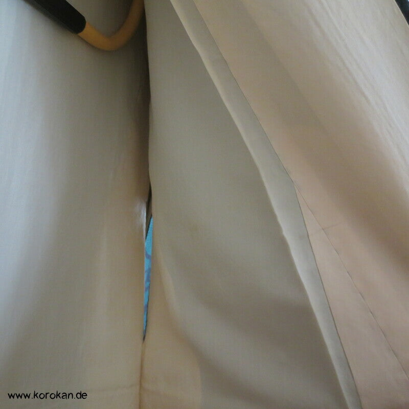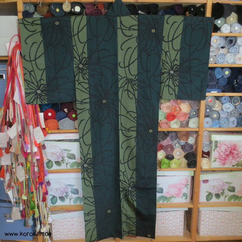 Vintage, eher antiker Komon Kimono Seidenjacquard Crazy Chrysanthemen über grünen Streifen, sehr 1960'er, eventuell früher, oberen hellen Seiden Futter und unterem Hakkake Futter in persimmon Seidencrepe.