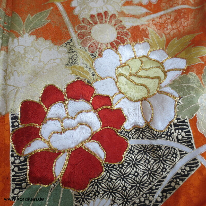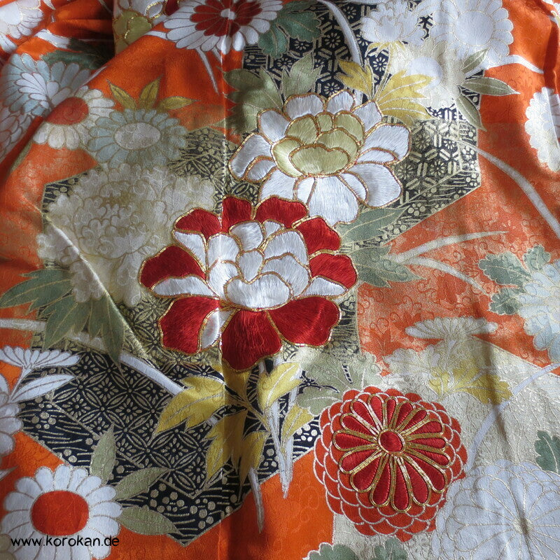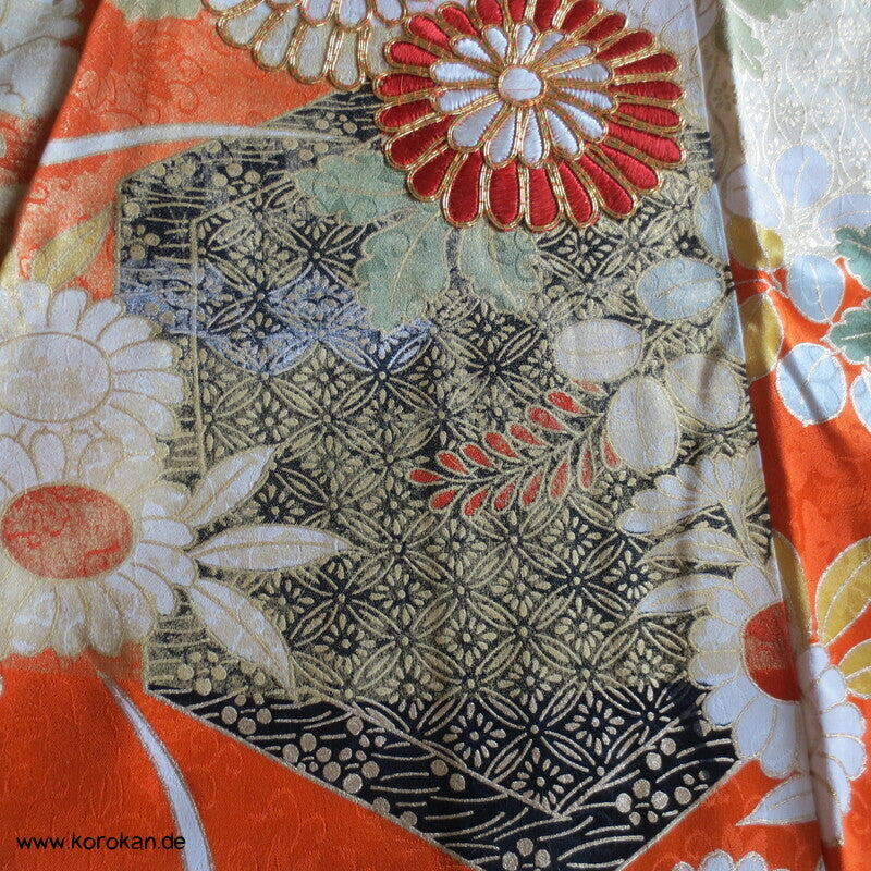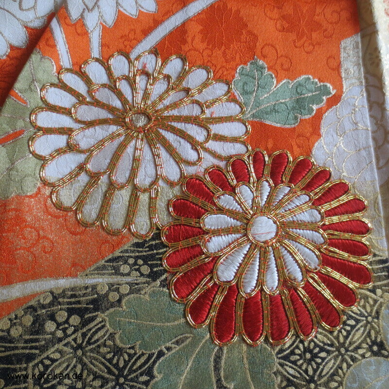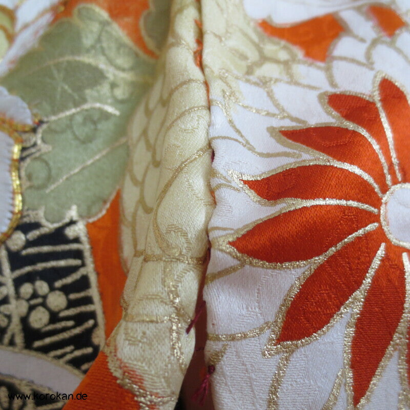 Vintage Furisode Blütendiamantrauten Seidendamast Kimono mit Blütenwolken, gold- /bestickt, oberes Futter helle Seide, unteres Hakkake Seidenfutter Obermaterial Seidendamast.