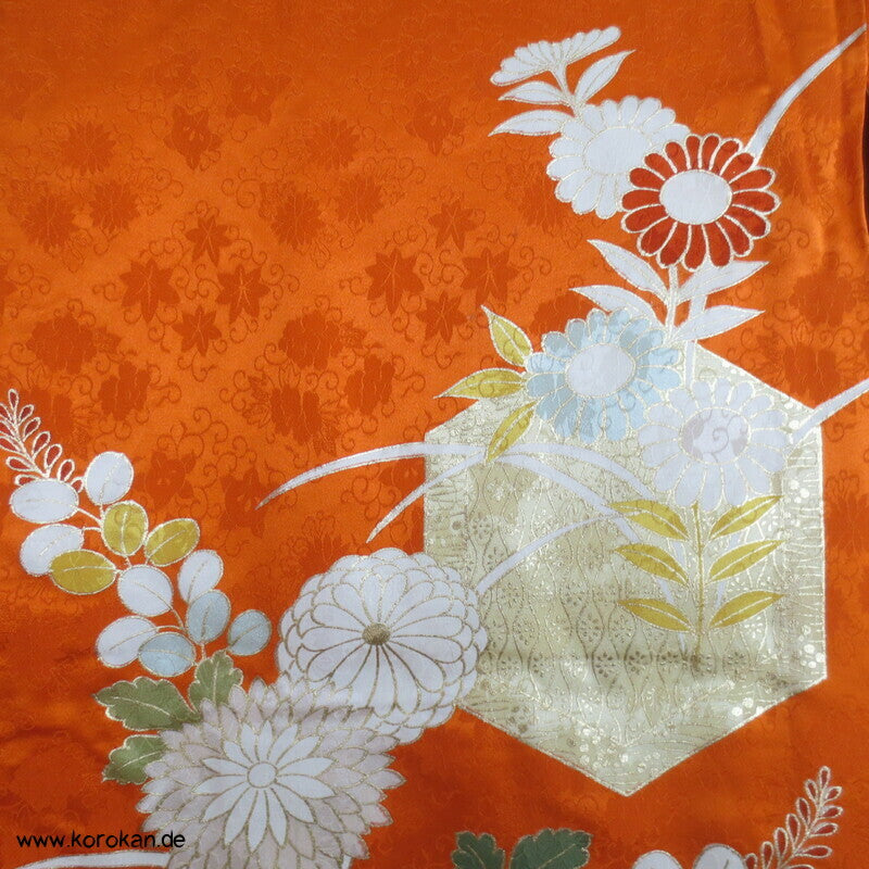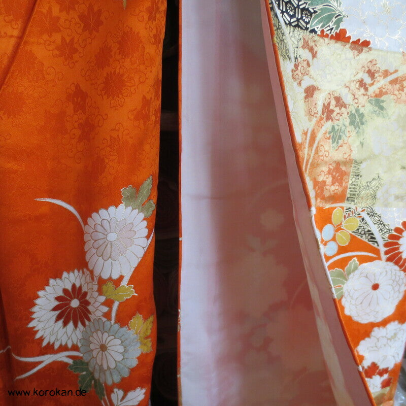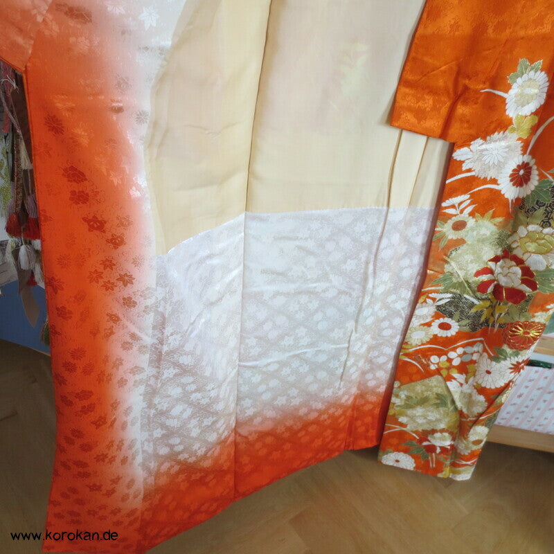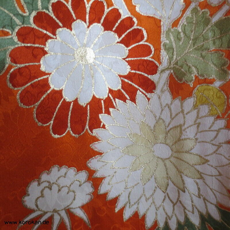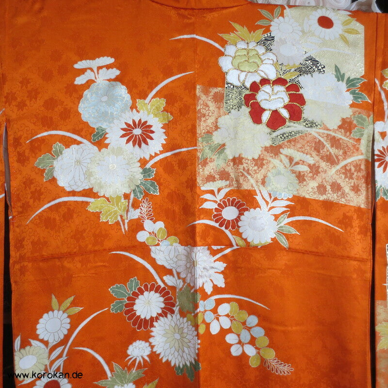 Vintage Furisode Blütendiamantrauten Seidendamast Kimono mit Blütenwolken, gold- /bestickt, oberes Futter helle Seide, unteres Hakkake Seidenfutter Obermaterial Seidendamast.