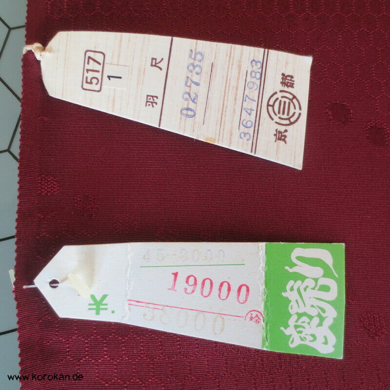 japanischer Vintage unbenutzter Kimono Seidendamast gewebte diagonal angelegte Kikko Tatewaku Nebelstreifen in rot