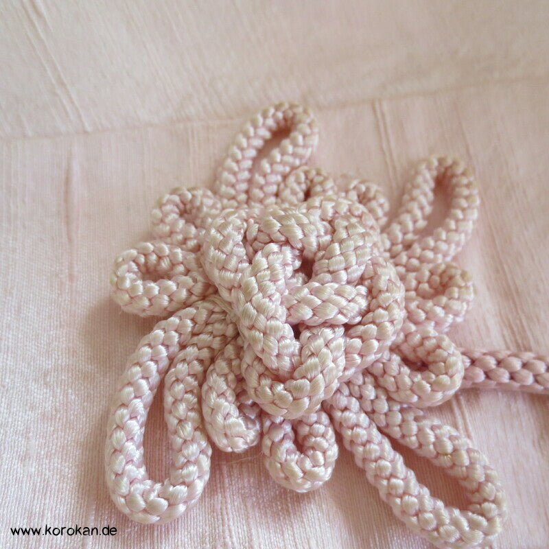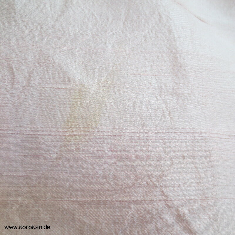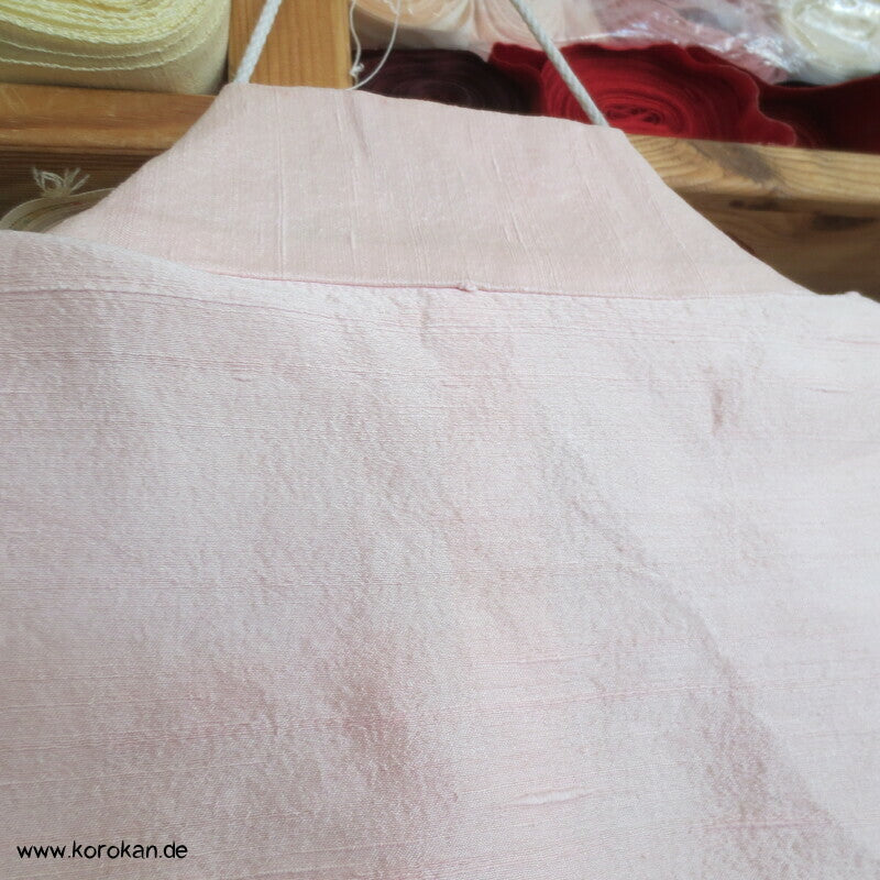 japanische Vintage Dochugi Kimono Jacke / Mantel aus dicker grob gewebter blass sakura rosa Wildseide, schlicht rosa gefüttert. mit Flechbandverschluss und zwei Druckknöpfen (da müsste man mal nachnähen): ungewöhnlich: Schulternäht mit leichter Schräge und keine Rückenmittelnaht.