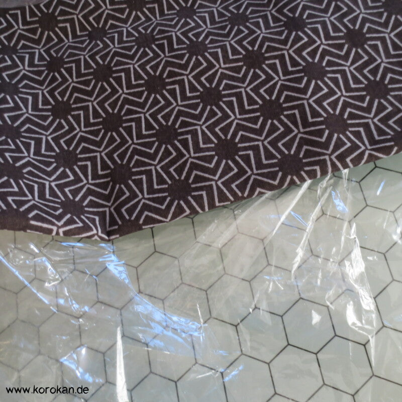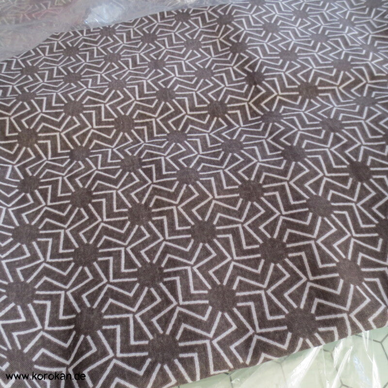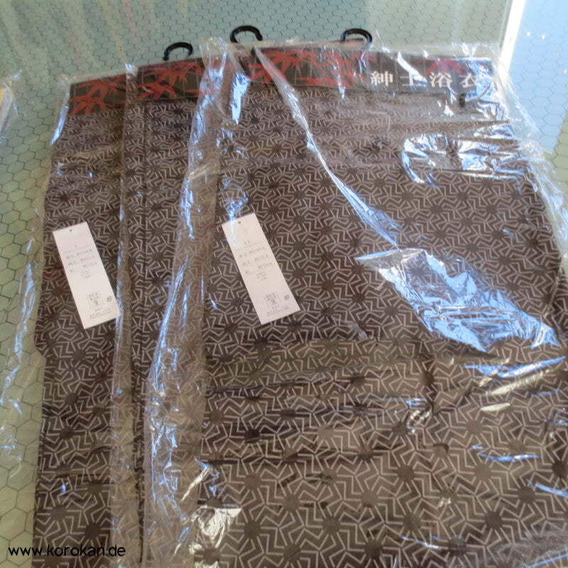 Vintage unbenutzter Originalverpackter Männer Baumwoll Yukata Kimono mit doppelter Triskele auf schwarz