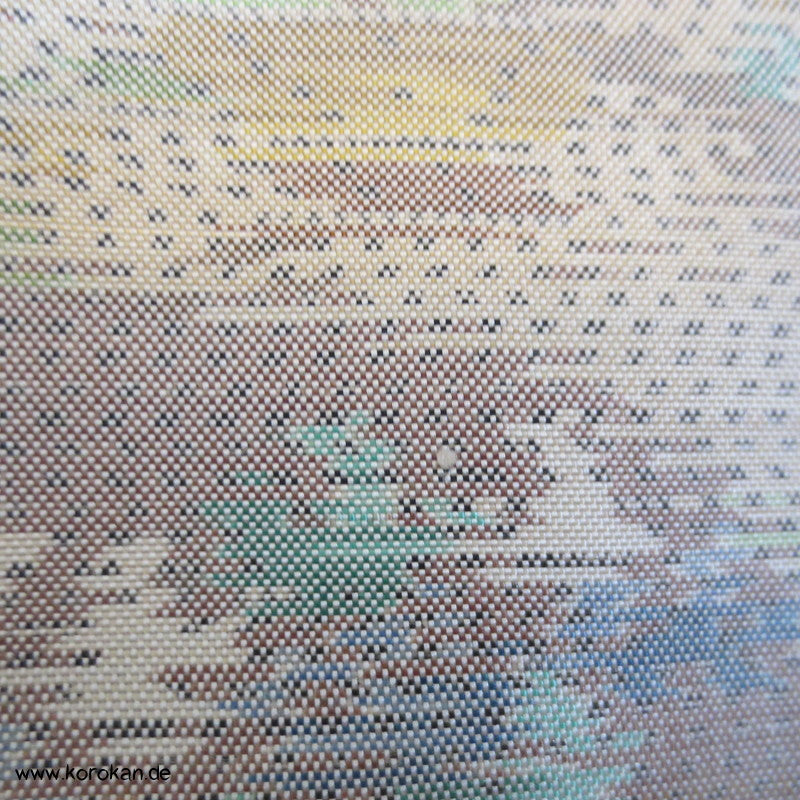 Vintage Tsumugi Seiden Komon Kimono Kasuri Dünenmuster in vielen Farben, oberes Futter hell, unteres Hakkake Futter in lilamauve Seide