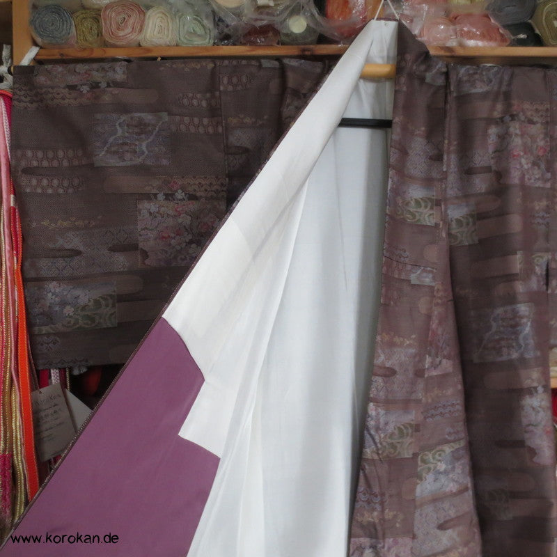 Vintage Tsumugi Seiden Komon Kimono Kasuri Egasumi und Shikishi in vielen Farben, oberes Futter hell, unteres Hakkake Futter in plaumenmauve Seide
