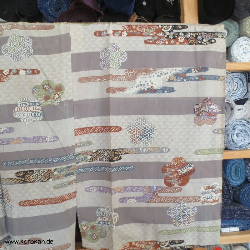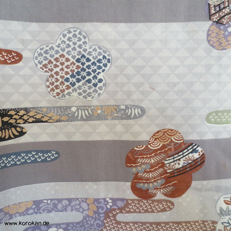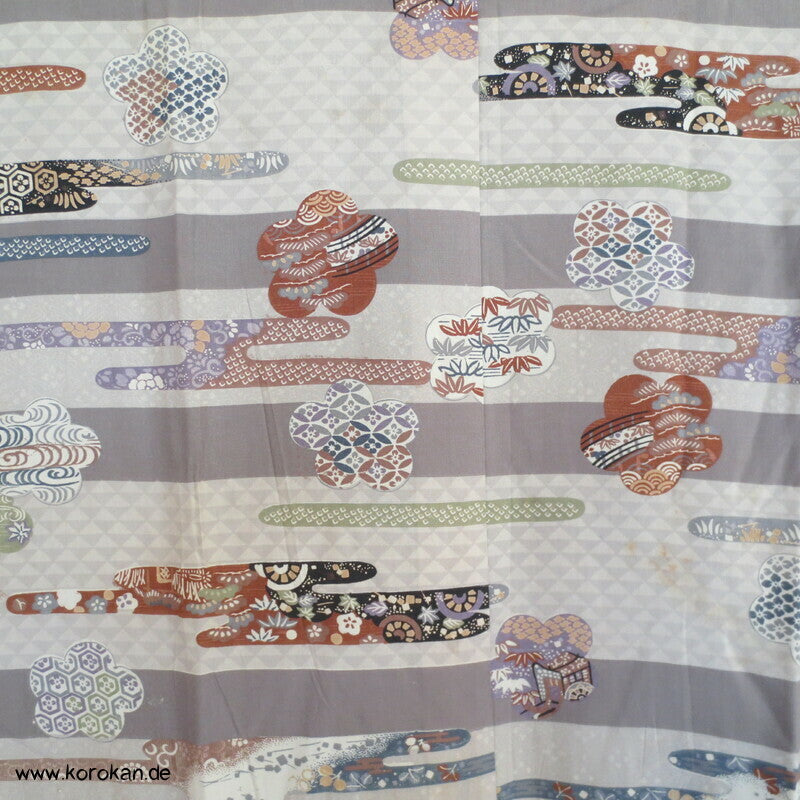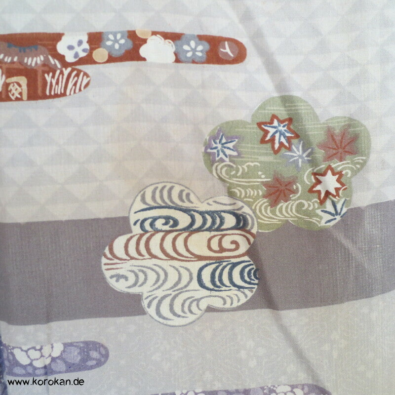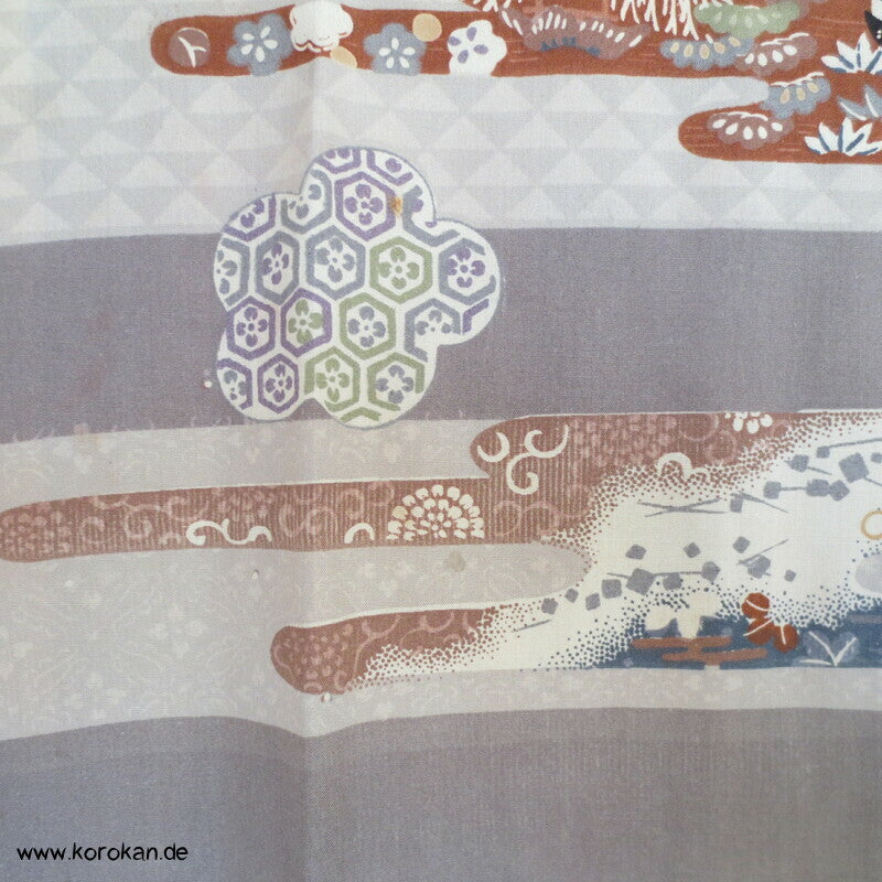 Vintage Männer Juban Unterkimono aus feinem weichen Woll Musselin bedruckt mit Egasumi Nebeln mit verschiedenen japanischen Motiven