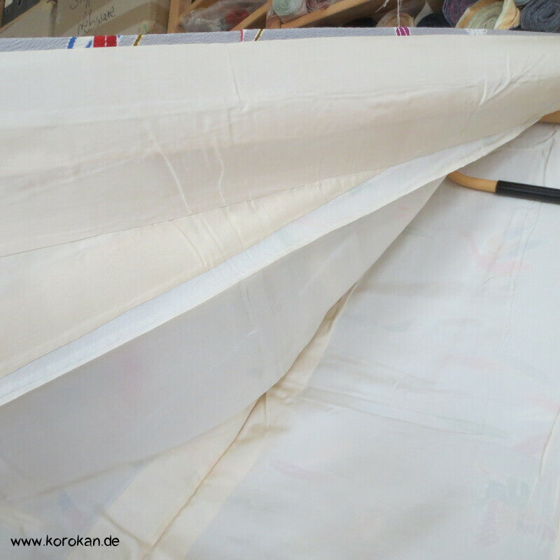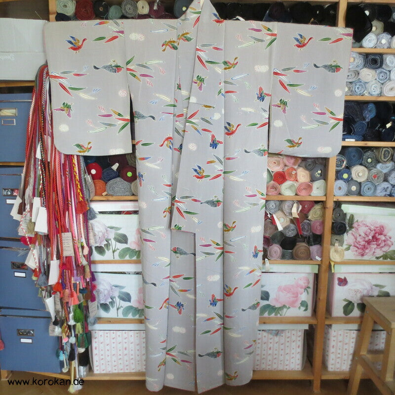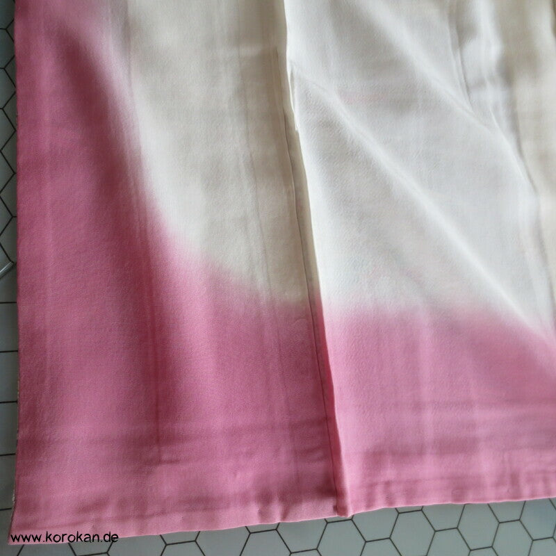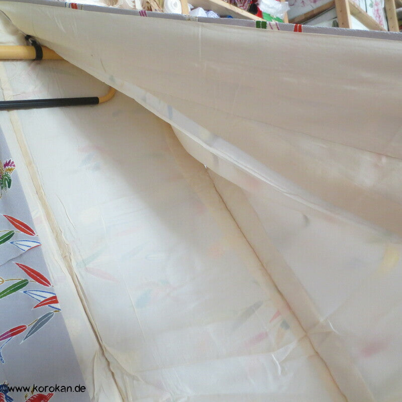 Vintage Kimono Komon lauter Enten auf hellgrauem Chirimen Seidencrepe, oberen hellen Seiden Futter und unterem Hakkake Futter Seidencrepe mit Bokashi Farbverlaufsrand in rosa