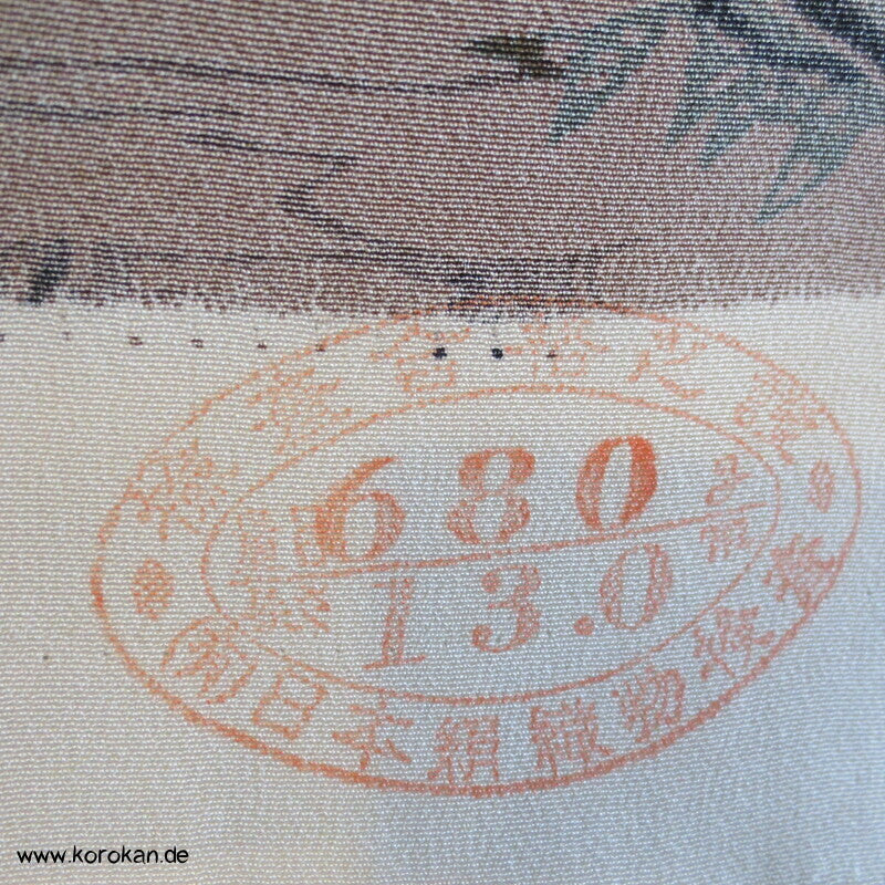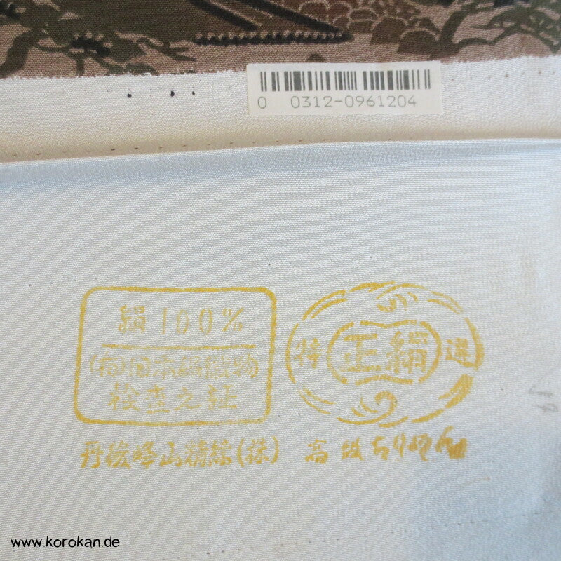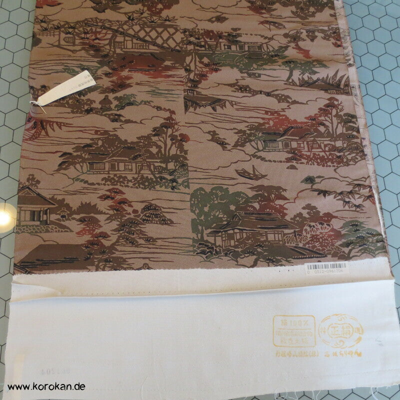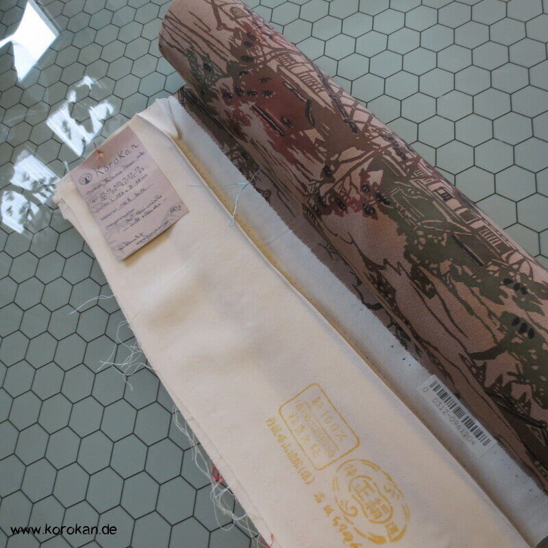 Vintage unbenutzte Tanmono Stoffrolle Seidencrepe Bingata artiger Landschaftsdruck, bereits eingeteilt für einen Kimono, mit halben Breiten etc..., Stoff noch ganz, aber Muster geteilt