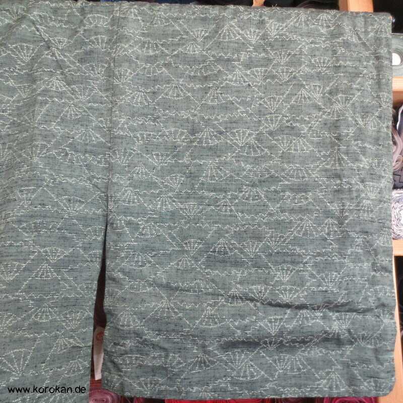 Vintage Kasuri garngefärbtes Fächermuster Tsumugi Seide Komon, oberes Futter helle Baumwolle, unteres Hakkake Futter grüne Honan Seide