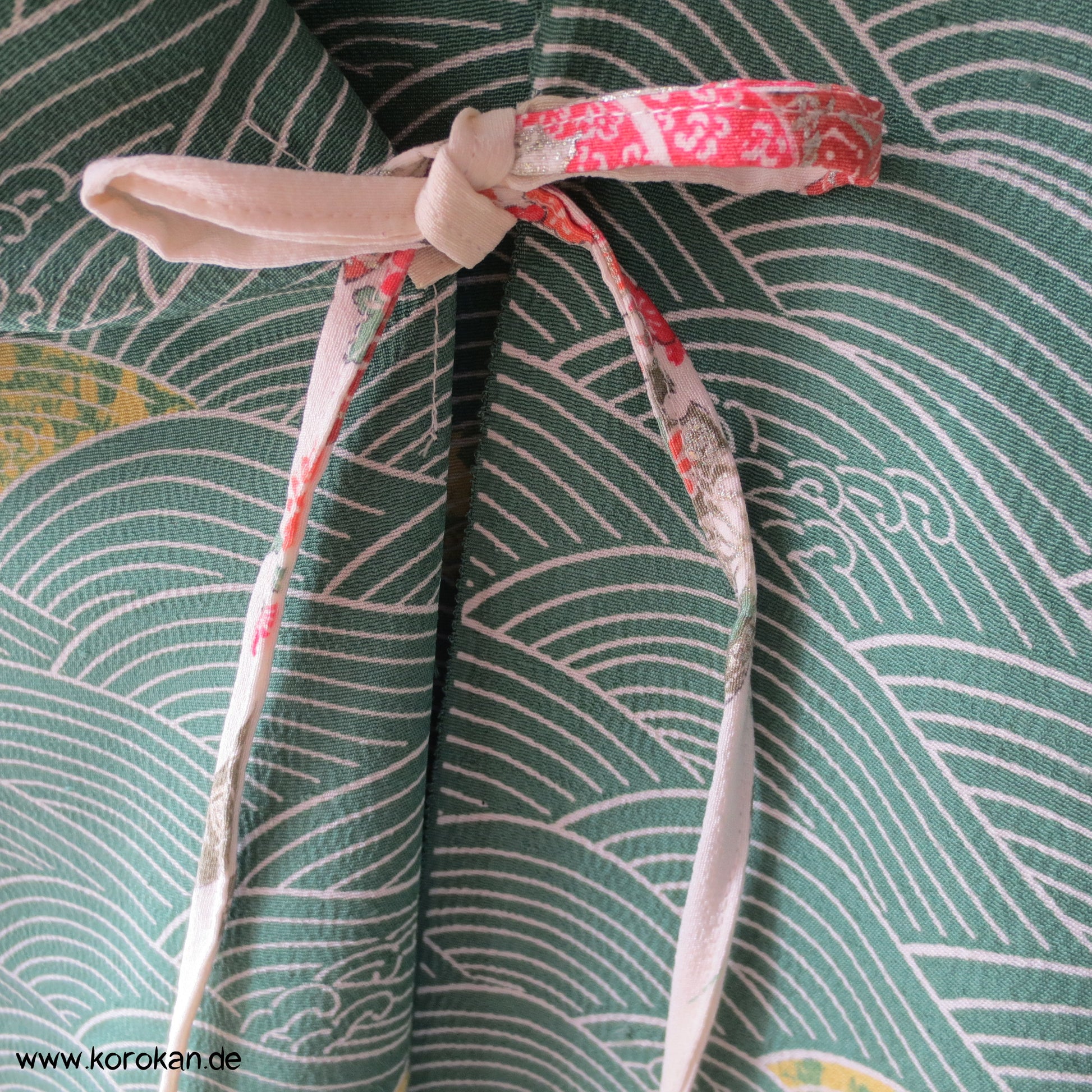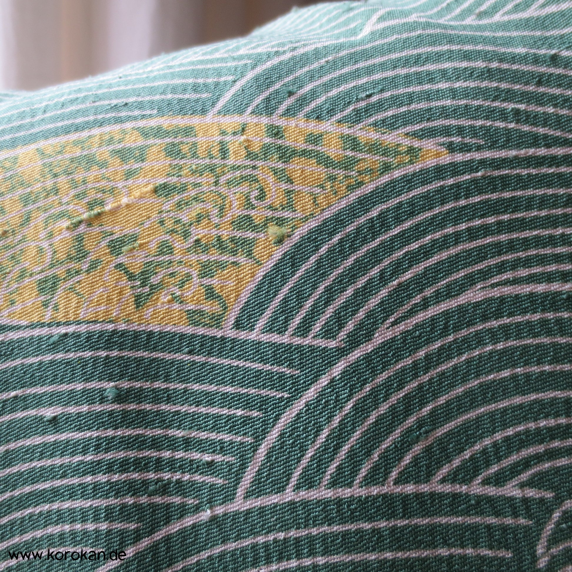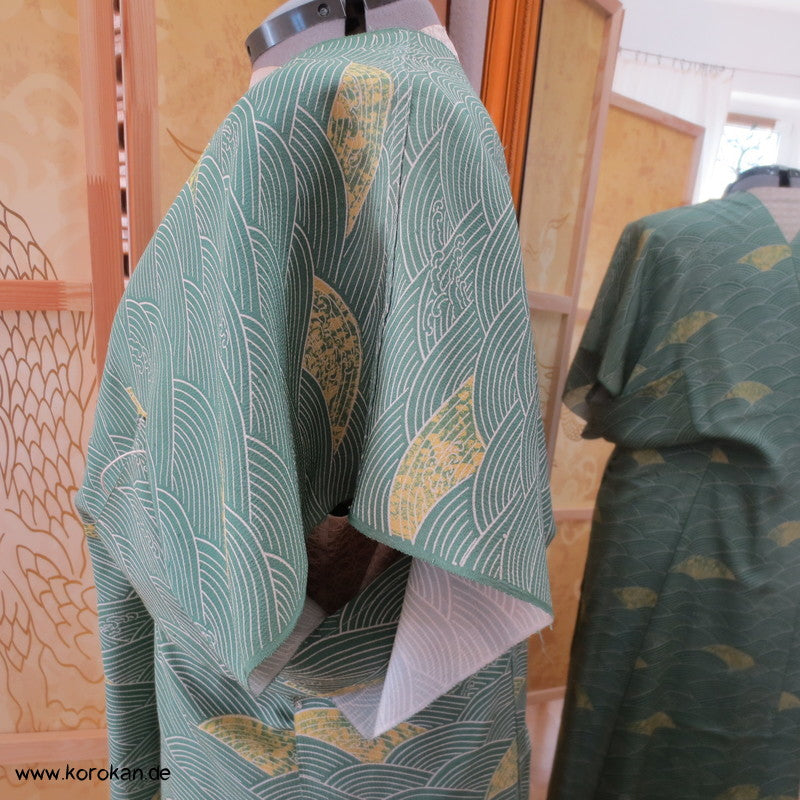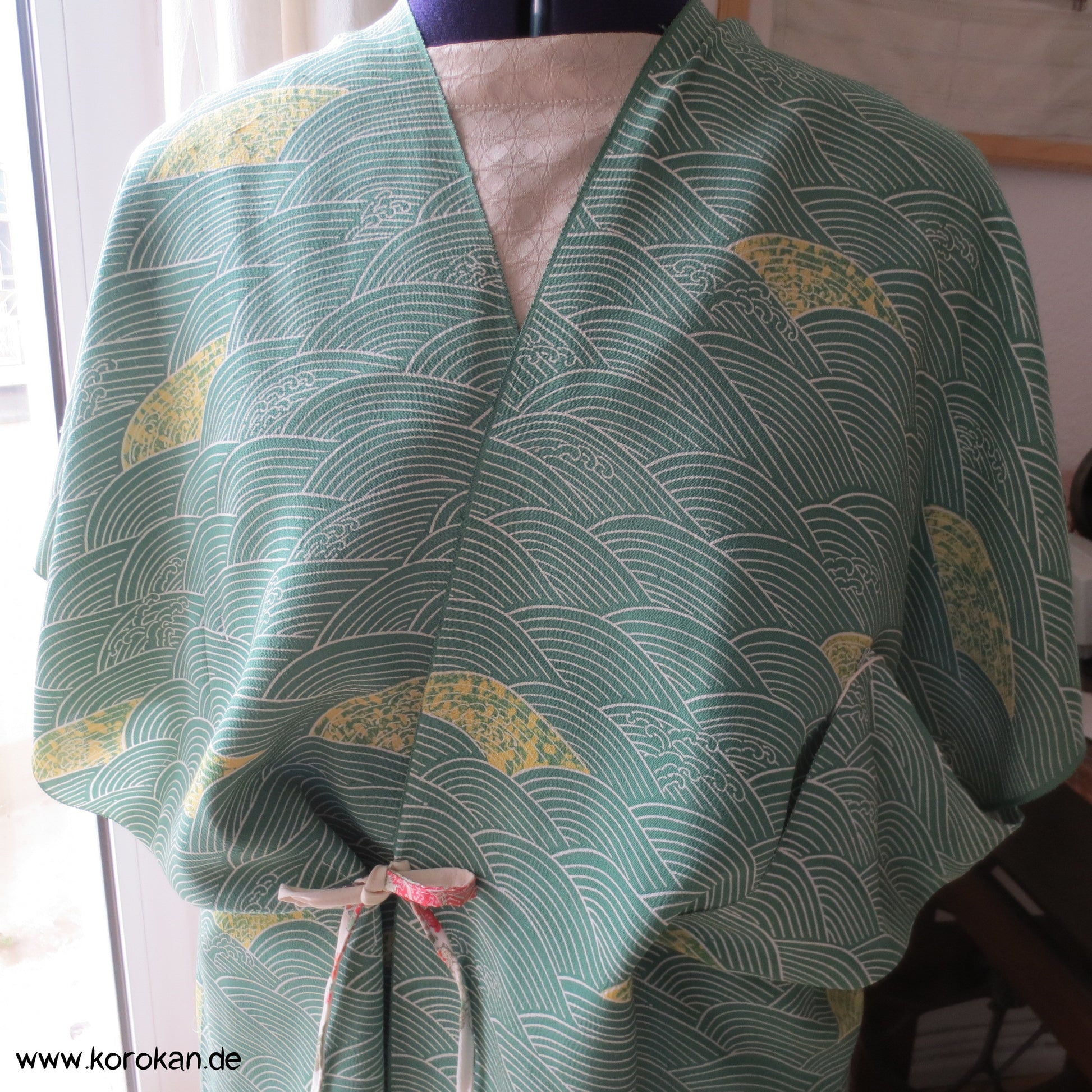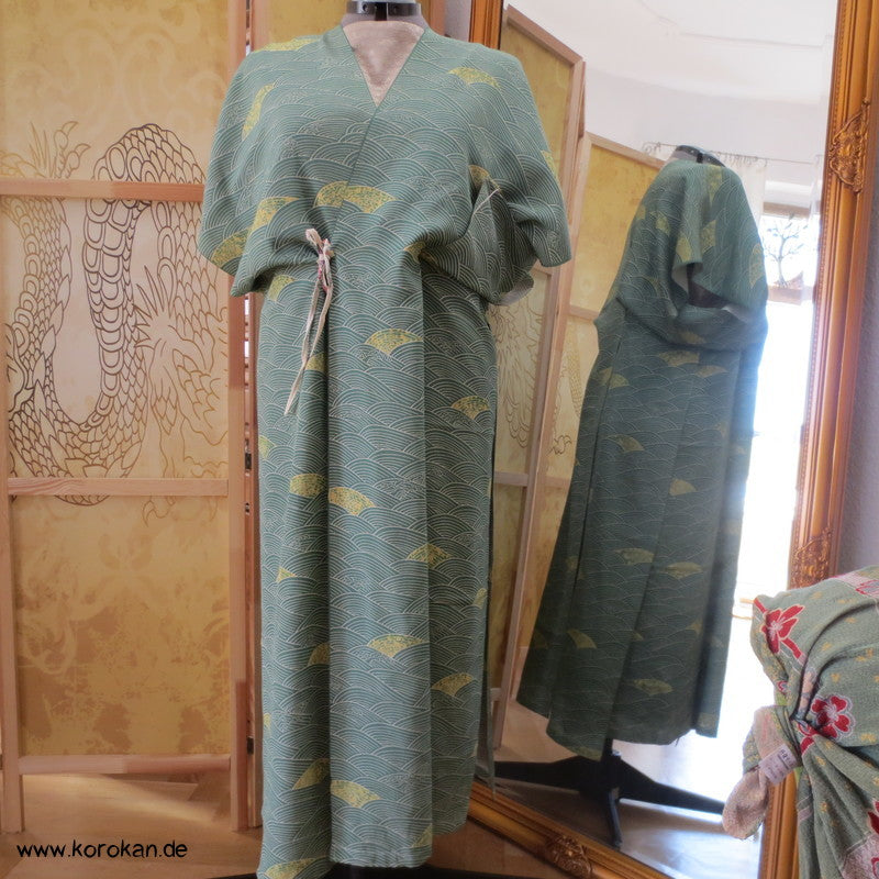 Japan Kimono Seiden Abendkleid aus lose nur punktuell zusammengenähten Stoffbahnen aus Vintage unbenutztem Seiden Chirimen Crepe mit Segaiha Wellenmustern. Geschlossen auf Bänder aus anderer Kimonoseide. Unikat. Braucht sinnvollerweise ein Unterkleid