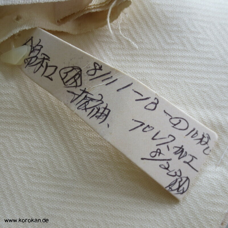 Vintage unbenutzter Karieba Furisode Kimono Stoff stilisierte Sayagata Seidendamast, Fächer mit lauter Mustern Goldauflage und bestickt, zugeschnitten, nicht genäht. Neuer Stoff