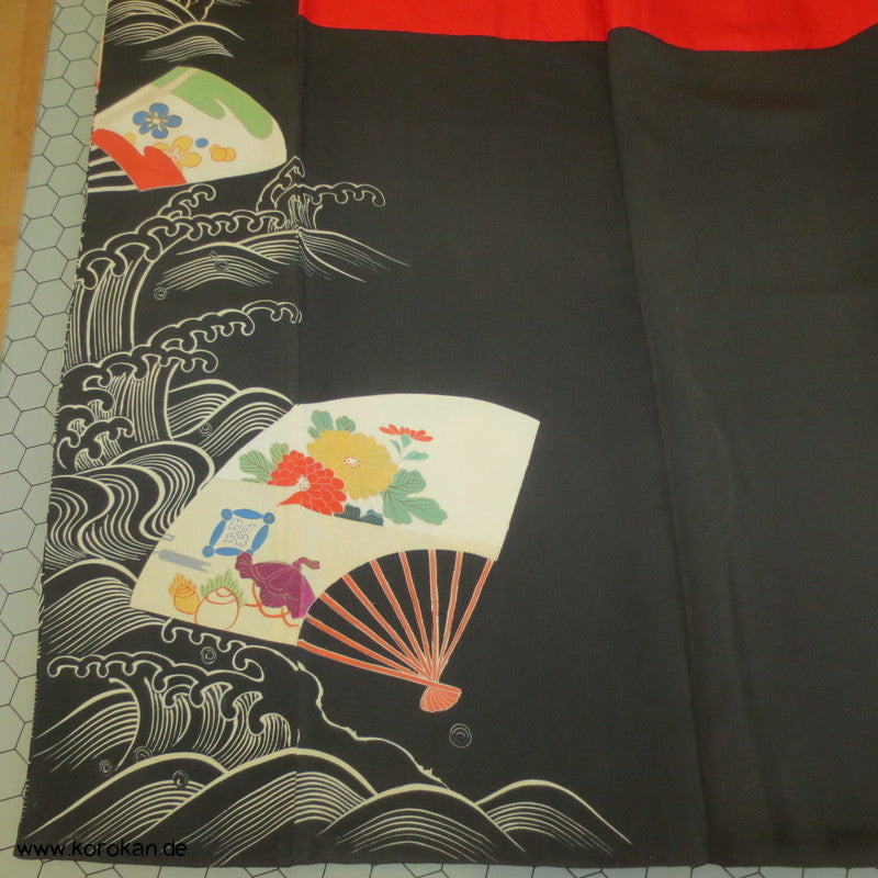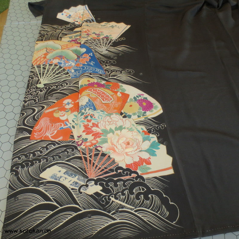 antiker Tomesode formeller Kimono aus schwarzem Seiden Crepe, bemalt mit symmetrischen Fächermustern innen und aussen, teilbestickt, 5 Mon, oberes Futter rote Seide, Hakkake unteres Futter Oberstoff mit Motiven.