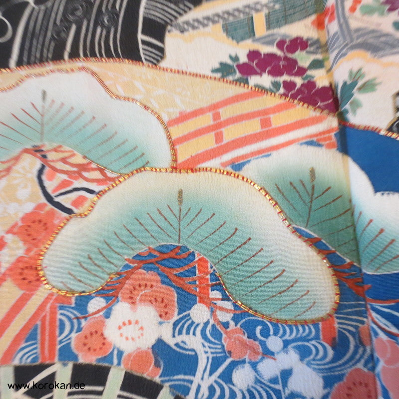 Fächermuster Tomesode / schwarzer Chu Furisode, rotes Futter