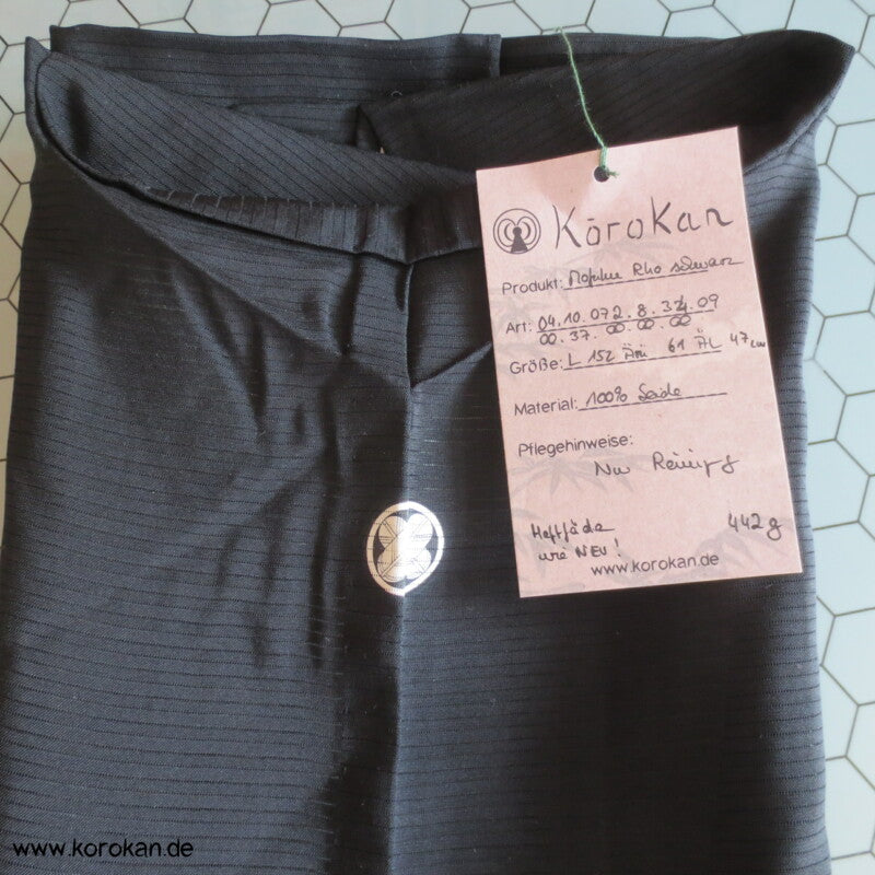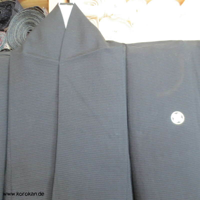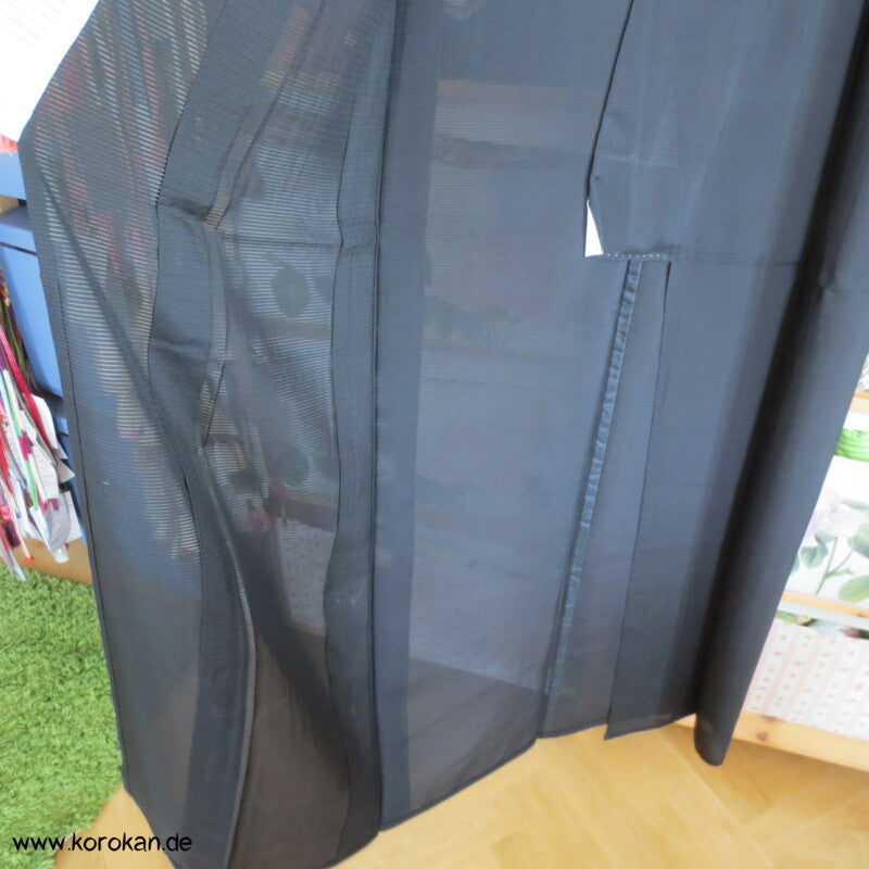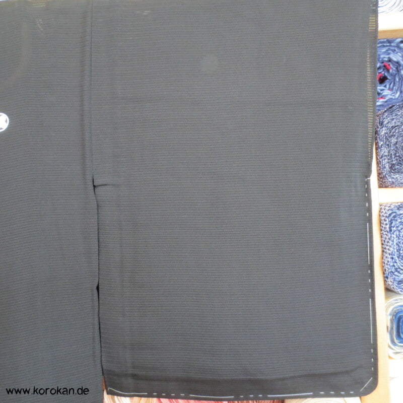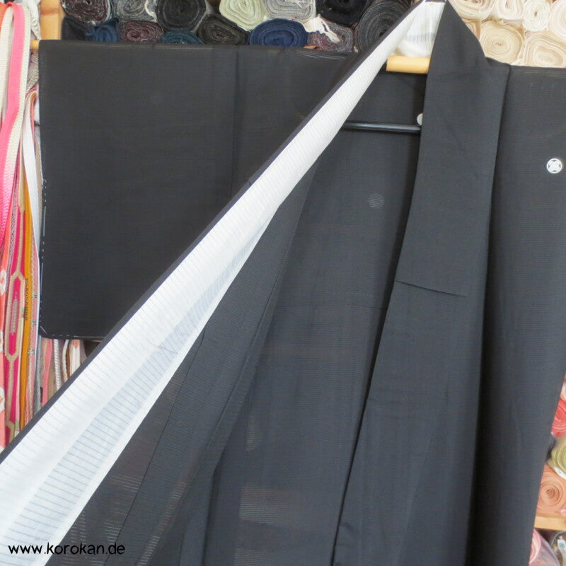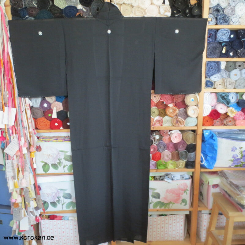 formeller Vintage, unbenutzter Mofuku 5 Mon schwarzer Kimono für offizielle Anlässe und Trauerfeiern im Sommer aus Rho gewebter Seide.