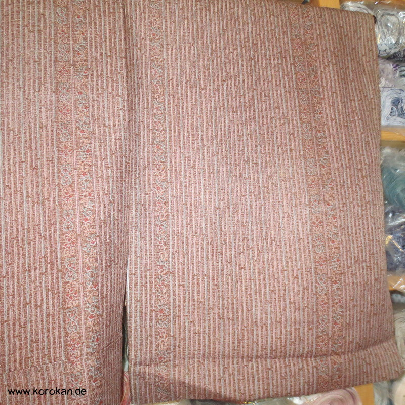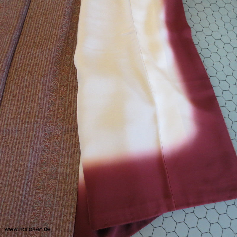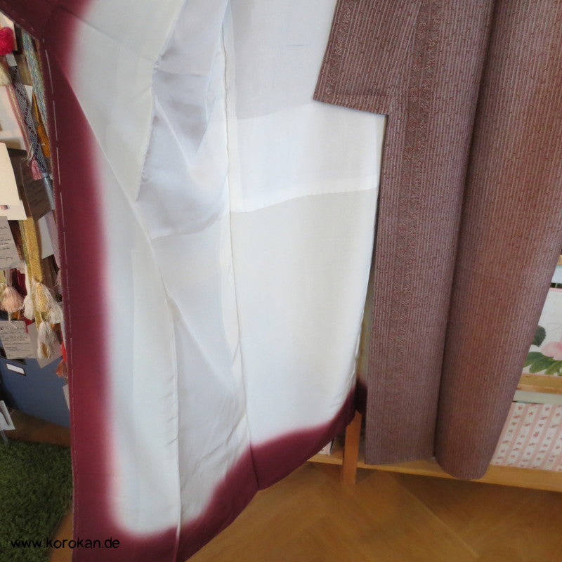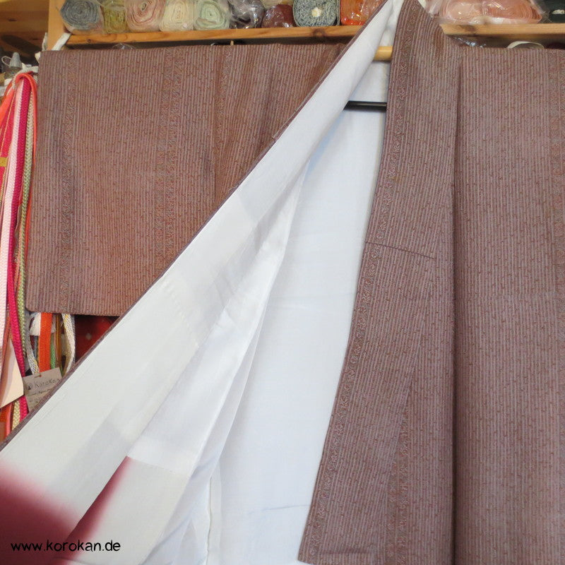 Vintage Komon Kimono Arabeskenstreifen auf rauem Chirimen Seidencrepe, oberem hellen Seiden Futter und unterem Hakkake Futter Seidencrepe mit aubergine Verlaufsrand.