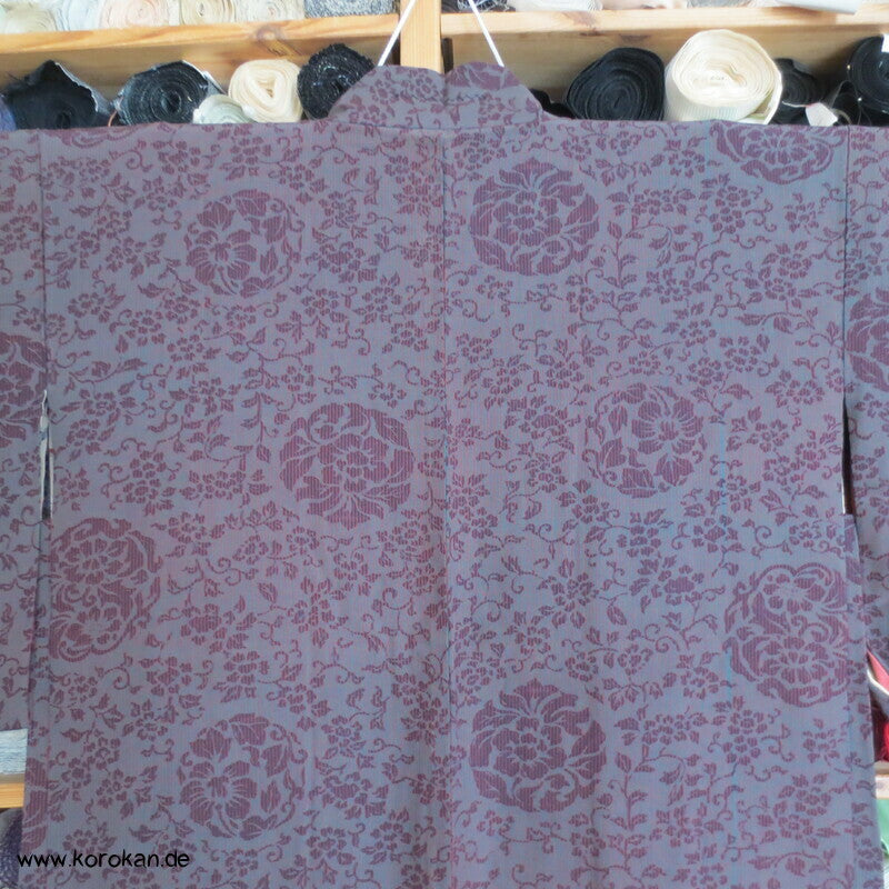 Vintage, eher antike Haori Kimono Jacke feingestreifter Seidencrepe mit auberginefarbenen Arabesken und Blättern, oberem Seidenfutter mit einem wunderschönen Wolken und Blütenzweigen Druck