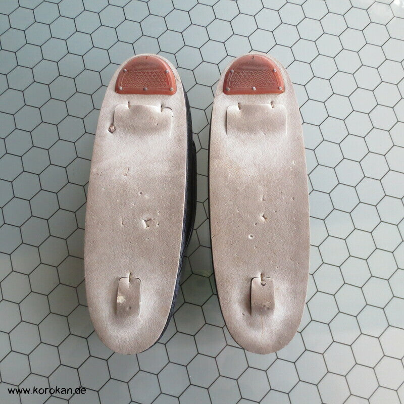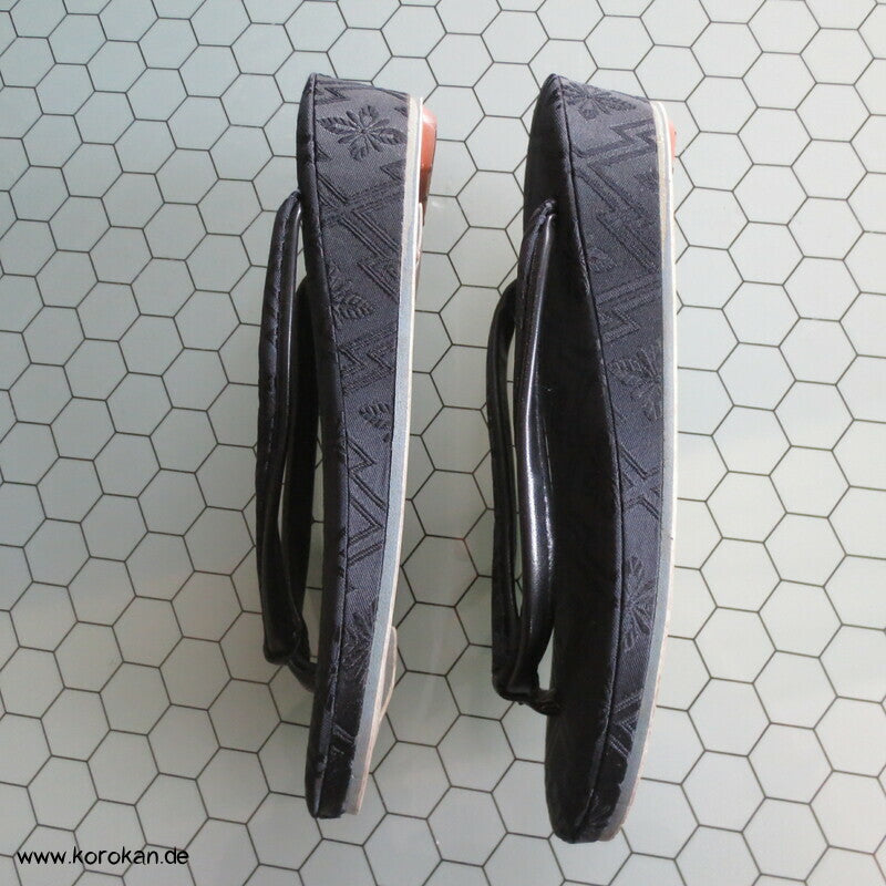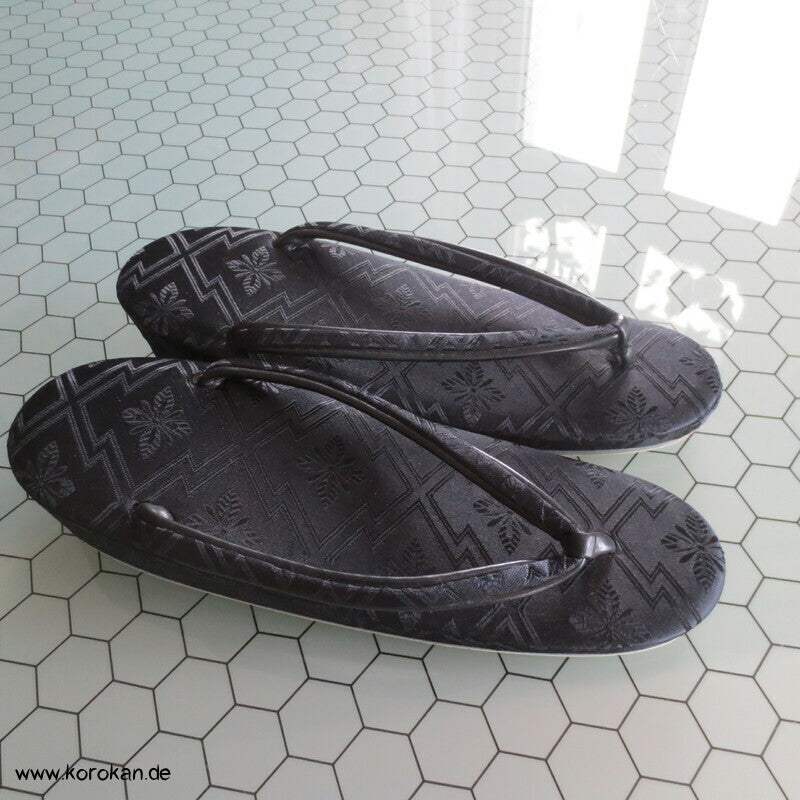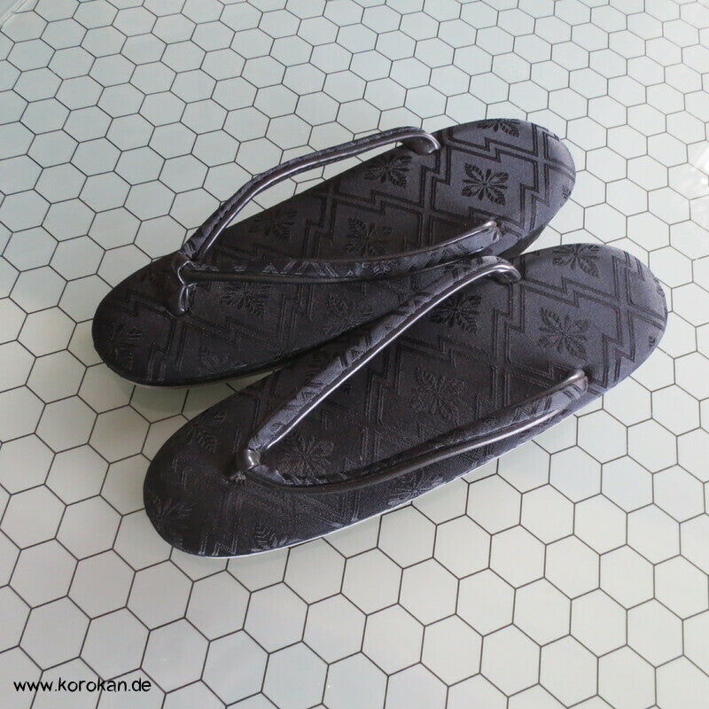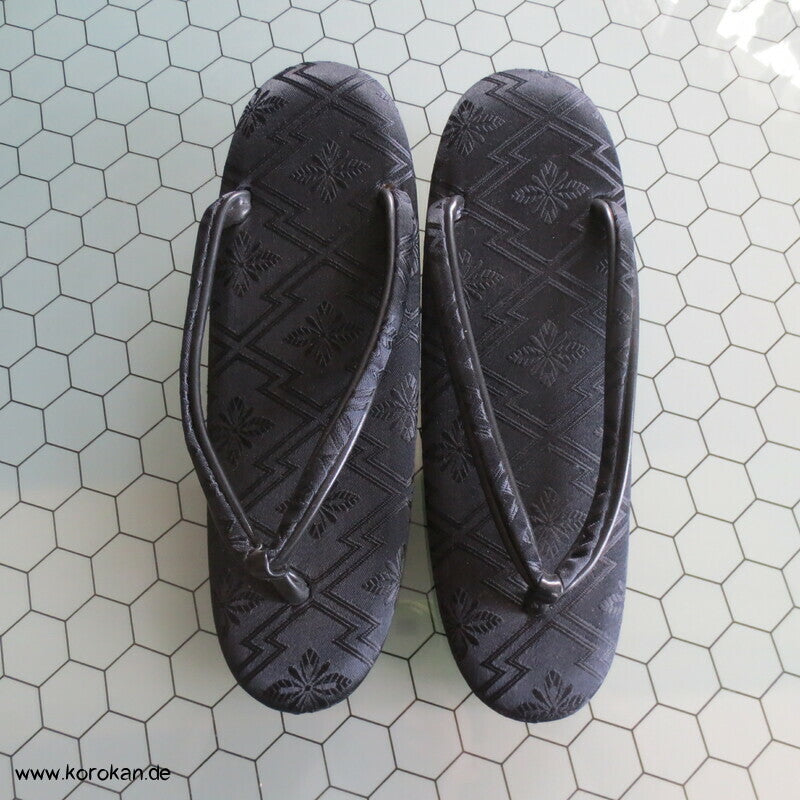 Vintage schwarze Seidendamast Zori mit schwarzen Stoffriemen, für den Trauerkimono, für formelle Auftritte, sollten mit Tabi getragen werden