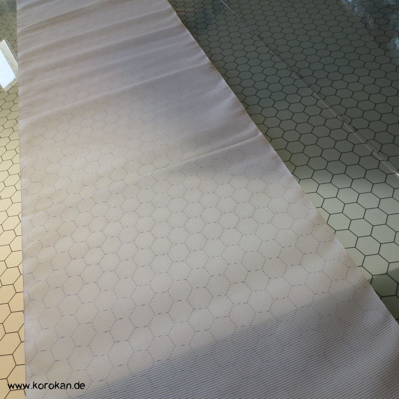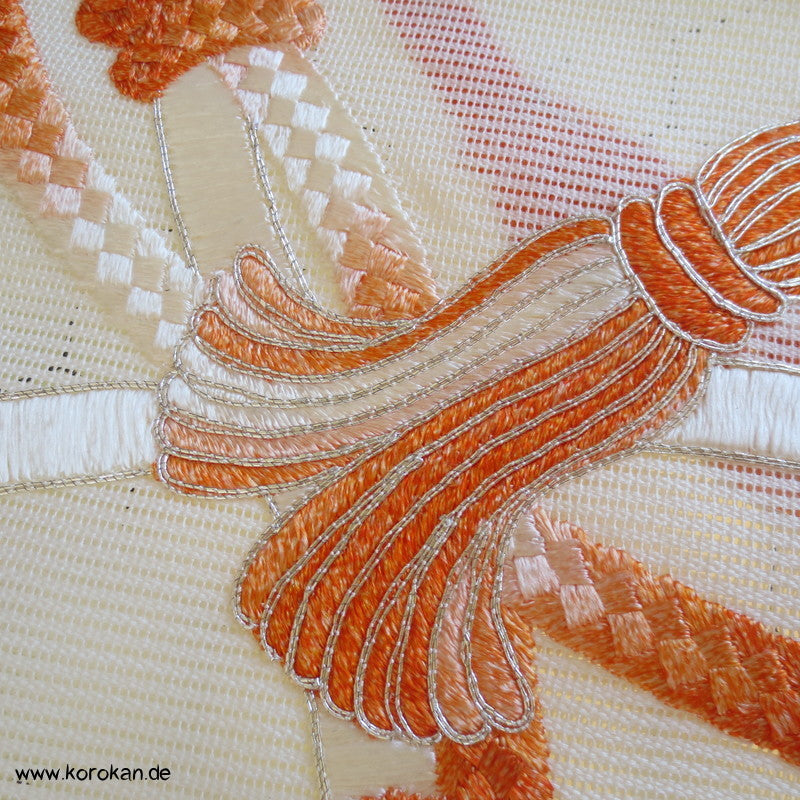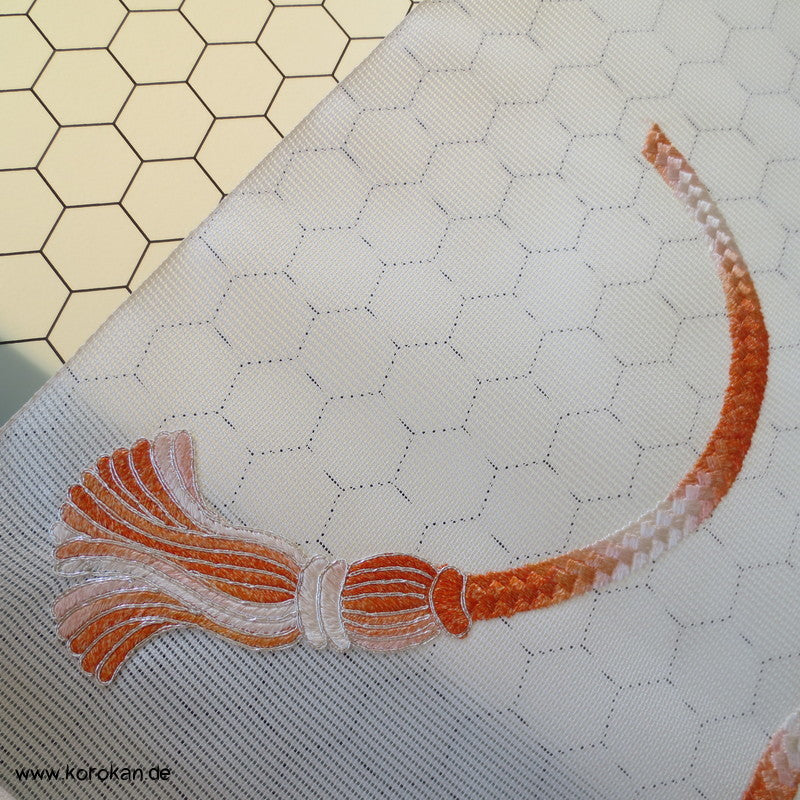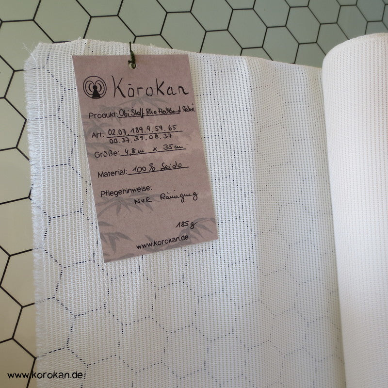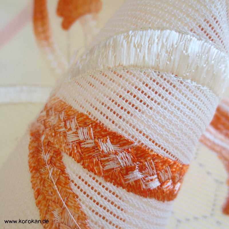 Vintage unbenutzte japanische Seide steifes natur Rho Drehergewebe für einen Obi Kimonogürtel mit handgestickten Flechtbandelementen mit Nishijin Ori Etikett