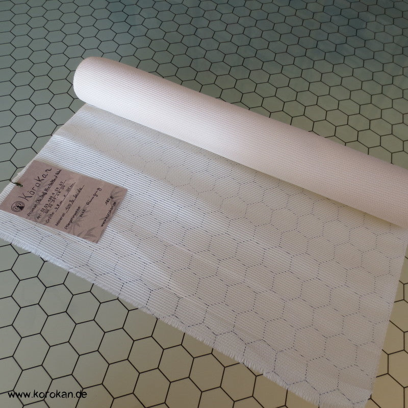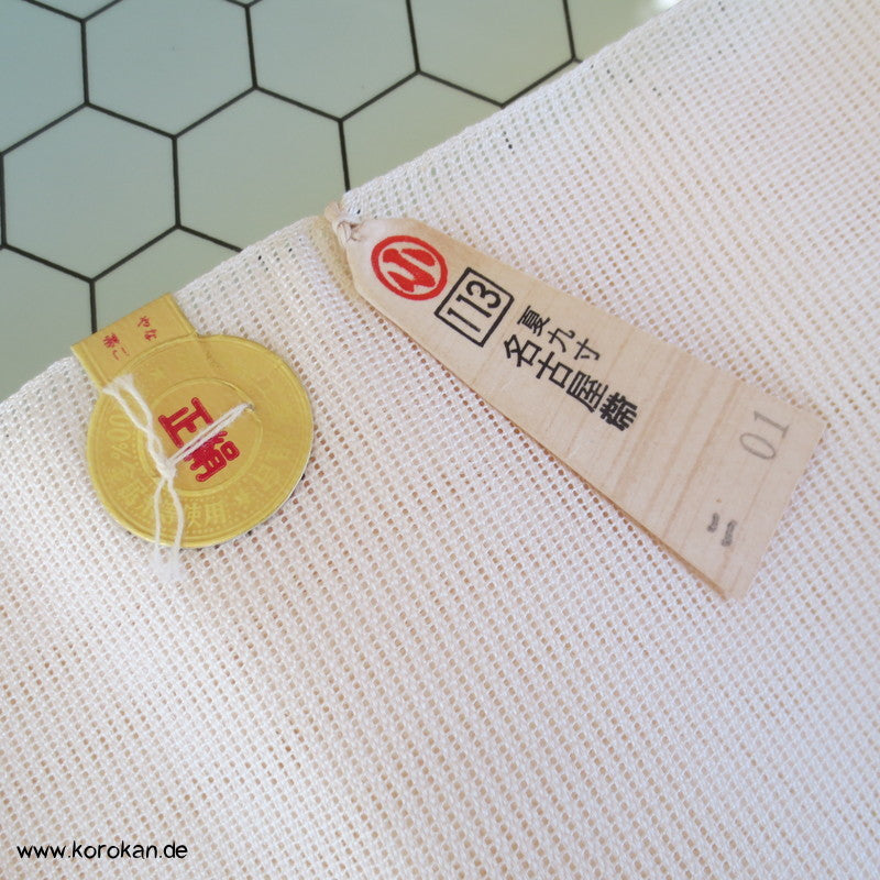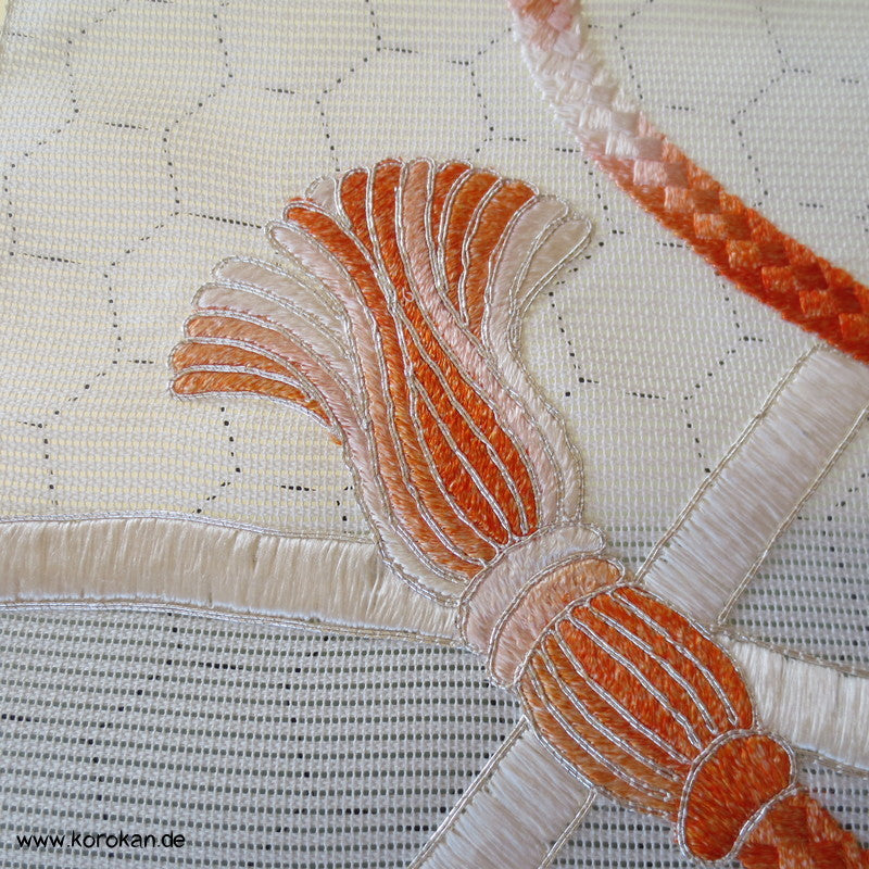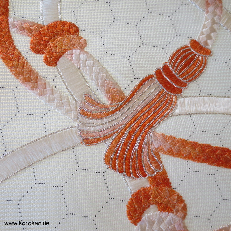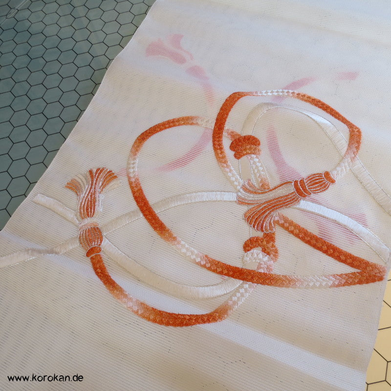 Vintage unbenutzte japanische Seide steifes natur Rho Drehergewebe für einen Obi Kimonogürtel mit handgestickten Flechtbandelementen mit Nishijin Ori Etikett