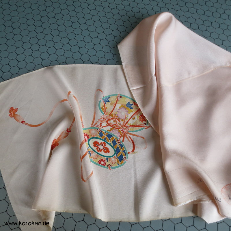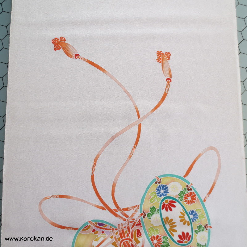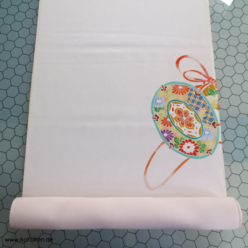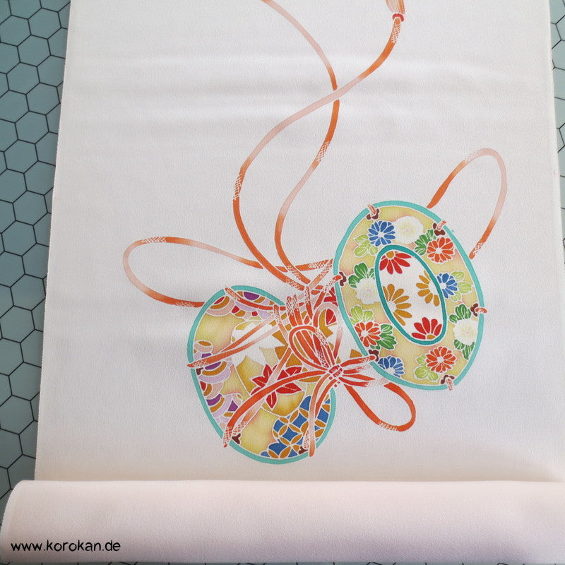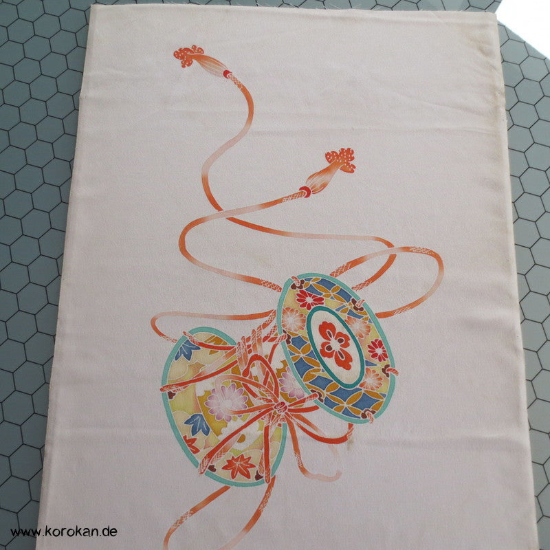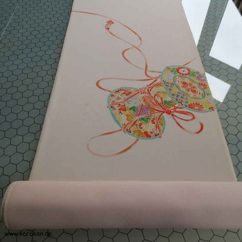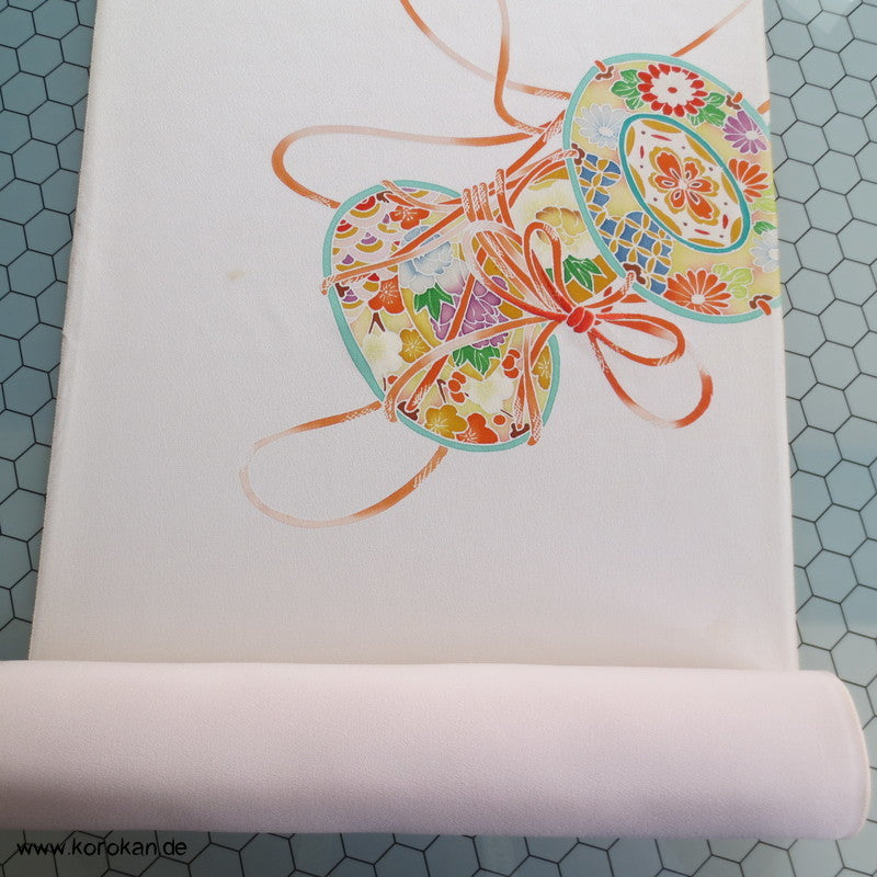 Vintage unbenutzter japanischer Stoffballen Damast Seide bemalt mit Trommeln und Flechtbändern, teilbestickt für einen ganzen Homongi Kimono. Das Muster ist unregelmäßig im Stoff verteilt und wird erst durch das genaue Zusammensetzen der Bahnen ein ganzes Bild.