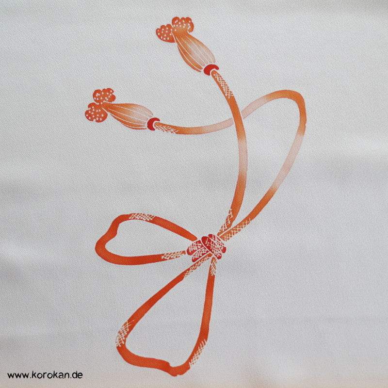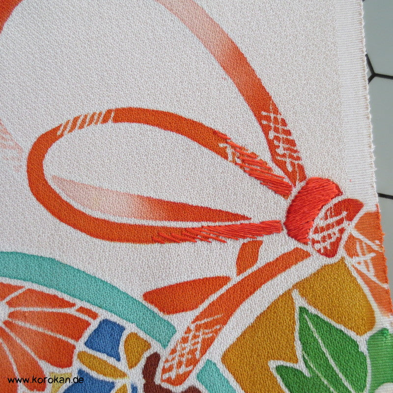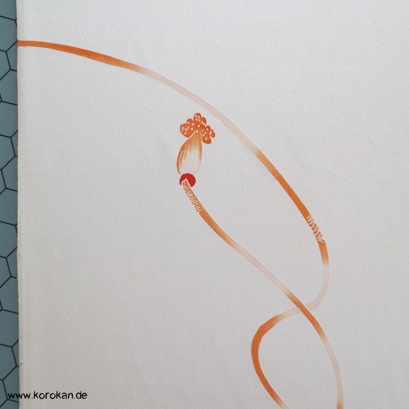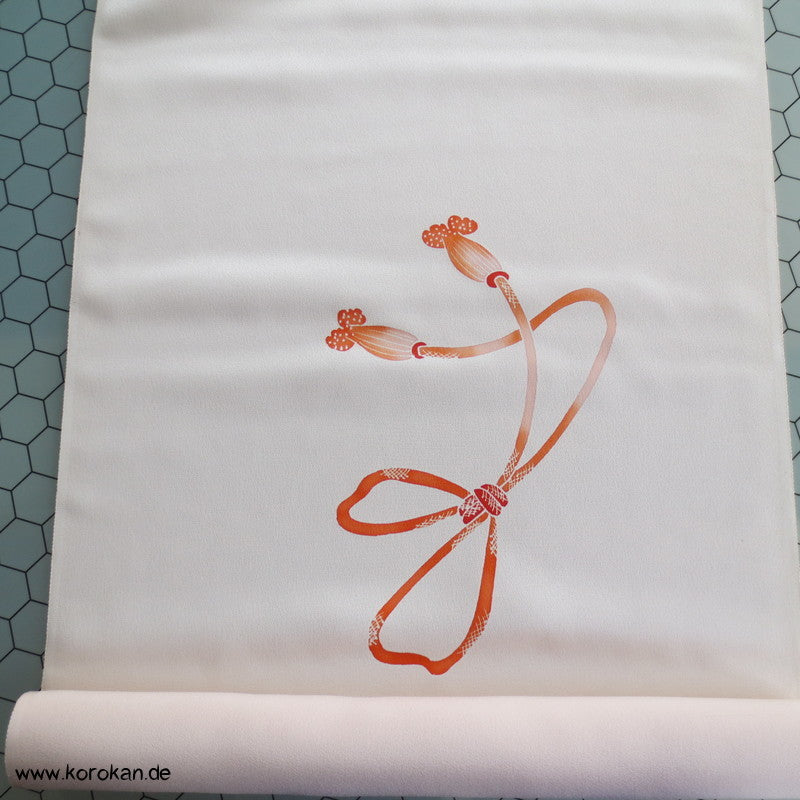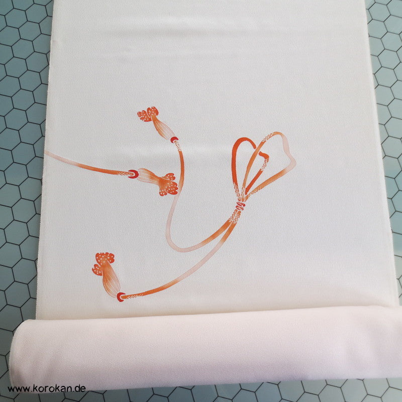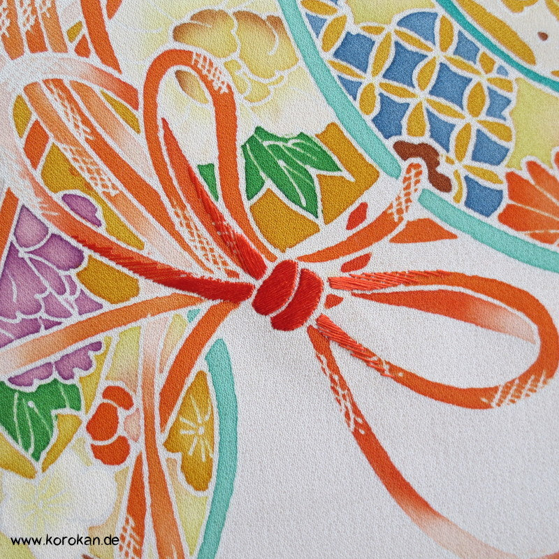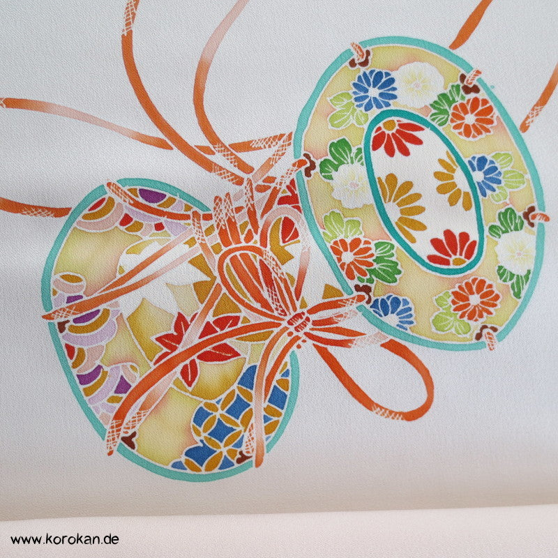 Vintage unbenutzter japanischer Stoffballen Damast Seide bemalt mit Trommeln und Flechtbändern, teilbestickt für einen ganzen Homongi Kimono. Das Muster ist unregelmäßig im Stoff verteilt und wird erst durch das genaue Zusammensetzen der Bahnen ein ganzes Bild.