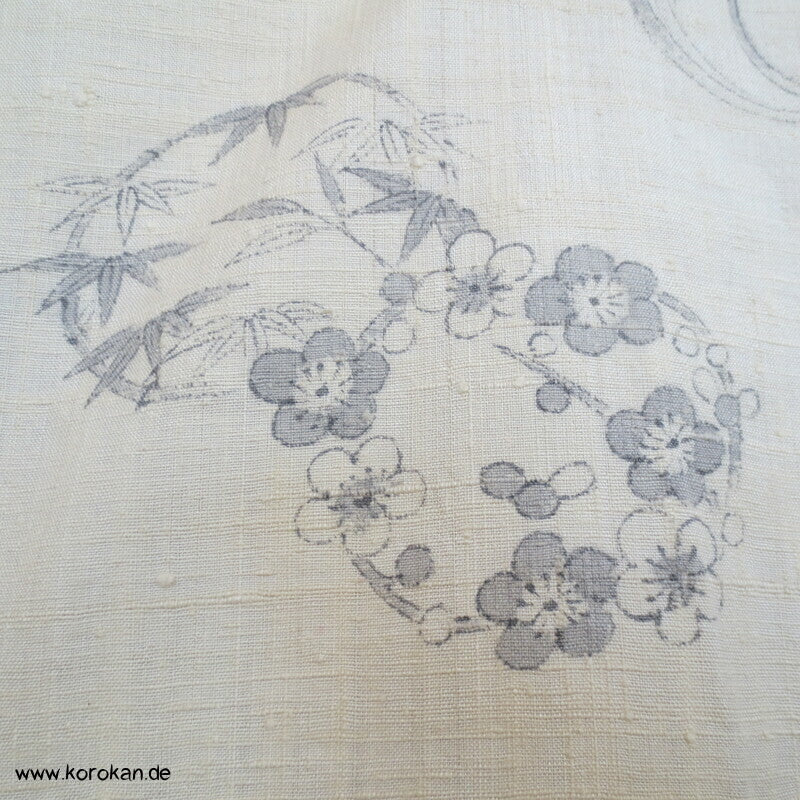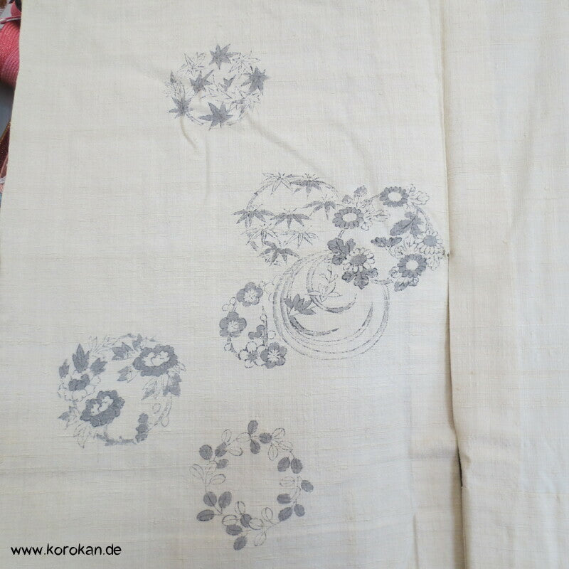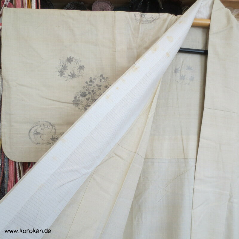 Vintage, eher antiker Hitoe ungefütterter Homongi Kimono aus dickem Tsumugi handgewebten naturfarbenem Seidenstoff mit zarten grauen Blumenkringeln und gesticktem Flechtband mit Gold, für den Sommer oder als Negligée