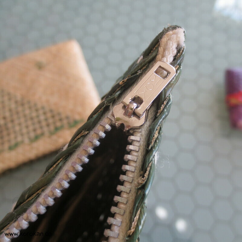 Vintage, wie unbenutzte handgeflochtene Bast / Bambustaschen - eine große mit grünlichen und eine kleine mit violett rotem eingeflochtenem Muster, beide haben eine zusätzliche geflochtene Innentasche, die große auch noch einen Reissverschluss.
