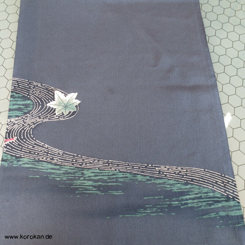 Vintage Crepe Seide Araihari eines aufgetrennten Homongi Kimonos, Ahornblätter über Flusswelle auf indigograuer Seide.