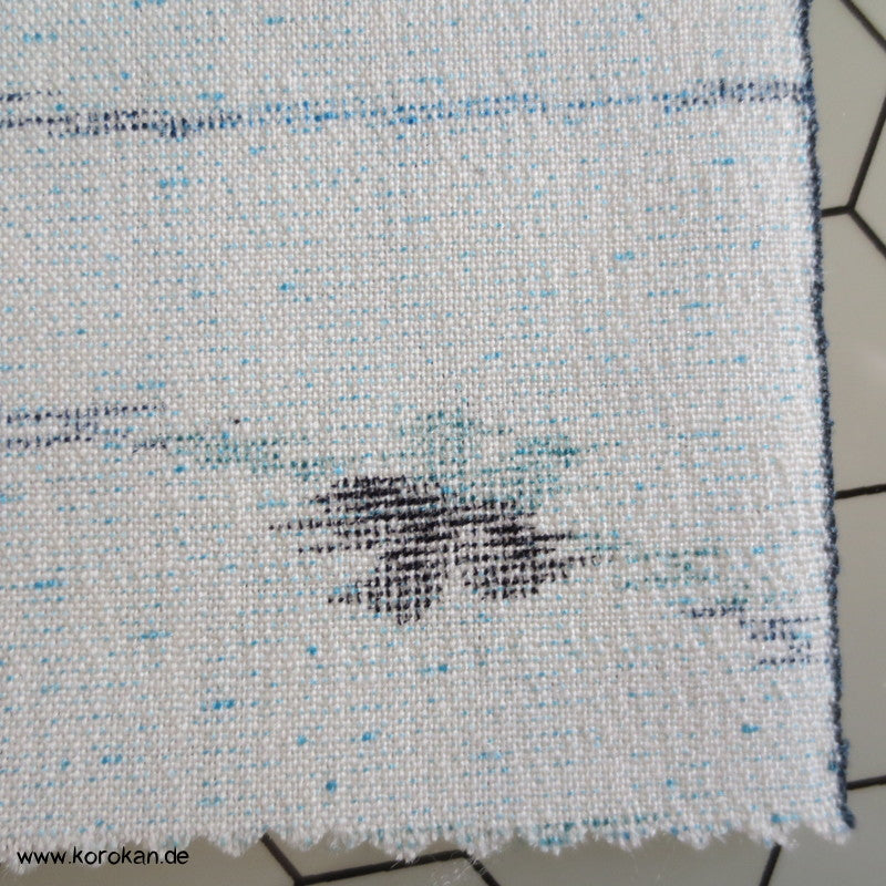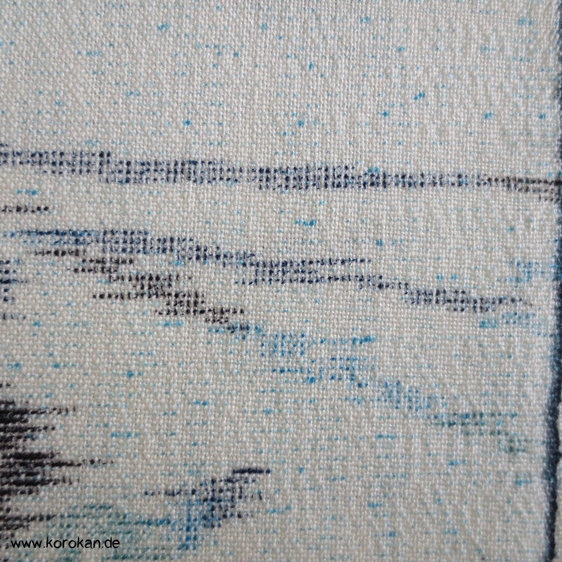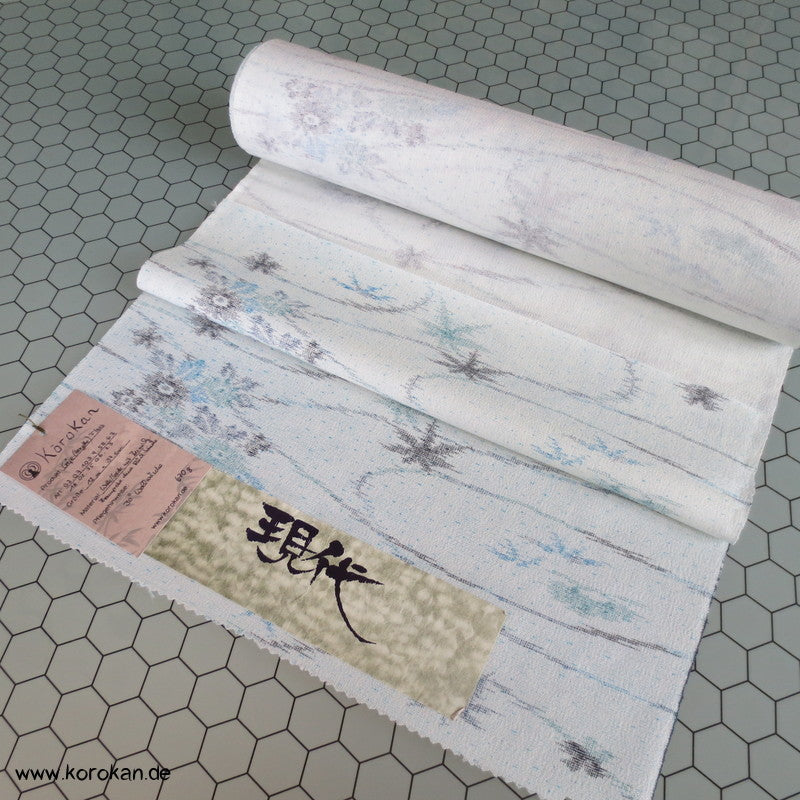 Vintage unbenutzte Stoffrolle Kimono Tanmono Crepe Georgette, leicht kreppig mit einem Flusswellen und Blüten und Blätter Kasuri Druck in blau und grau
