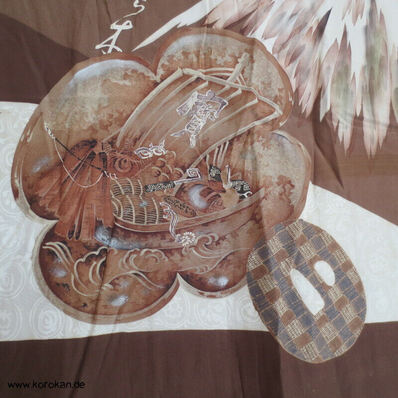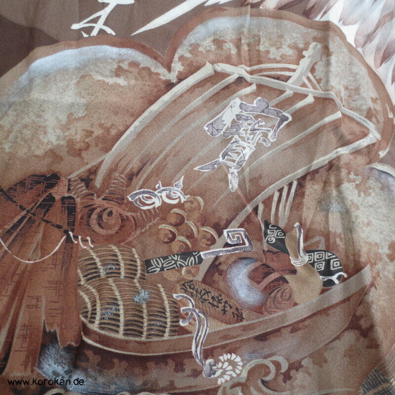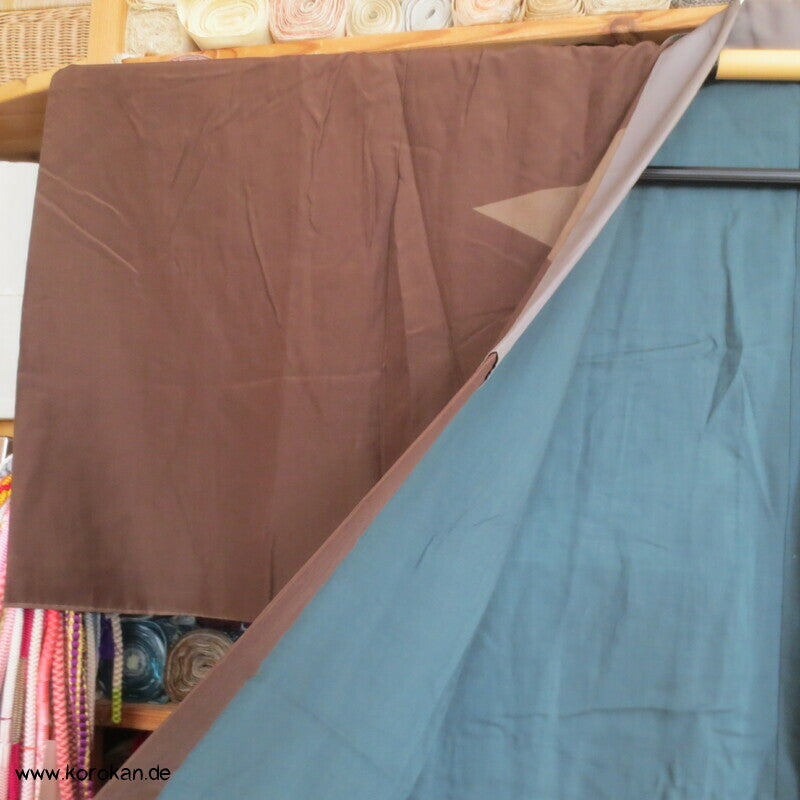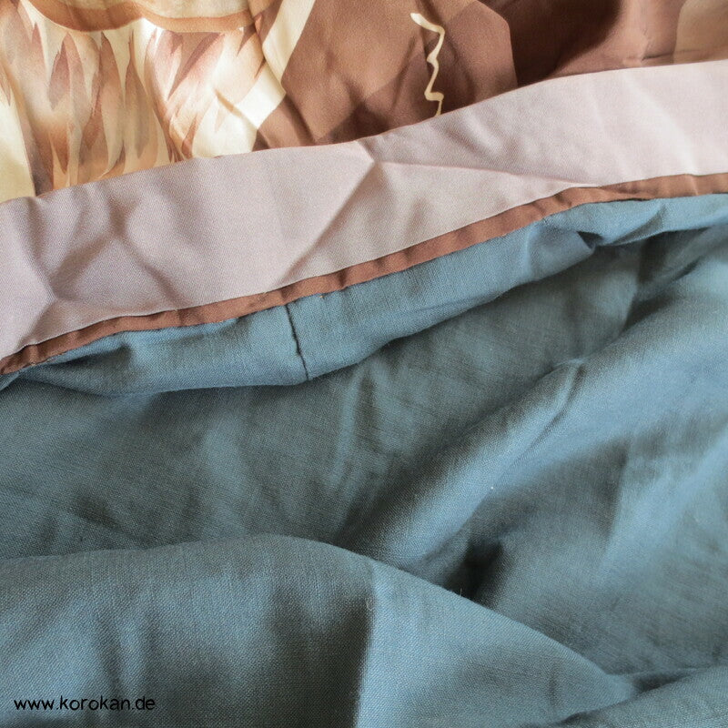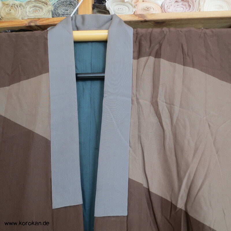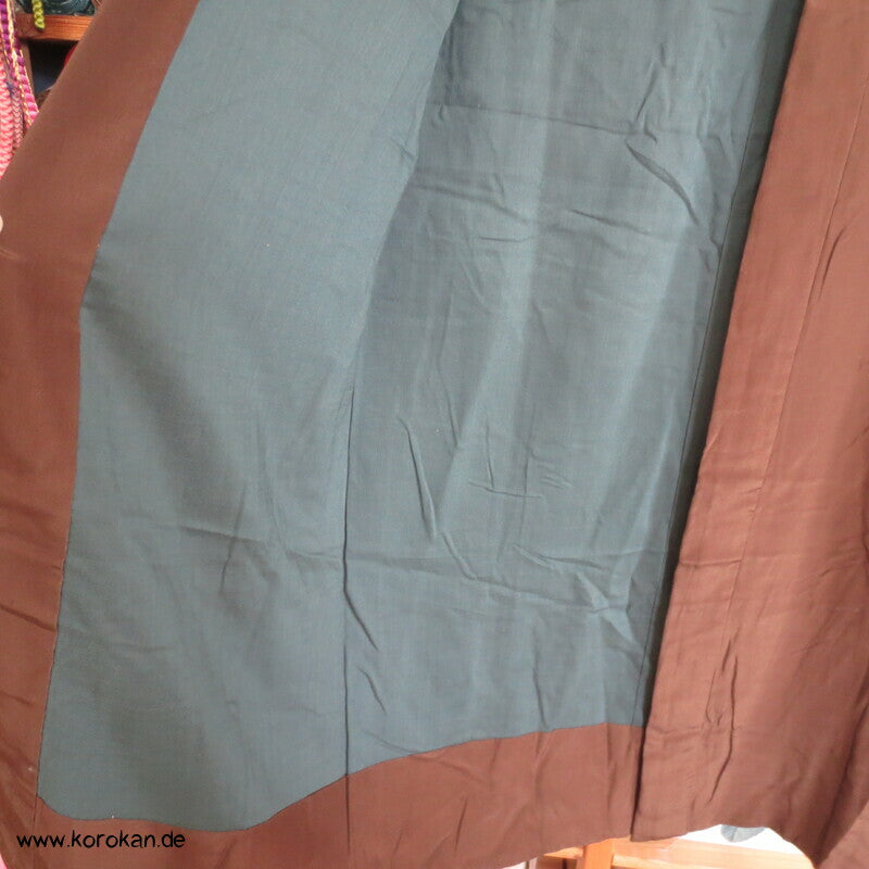 Vintage Männer Juban Unter Kimono, allover Motiv mit Schatzboot vor Fuji San, voll gefüttert mit grünblaugrauer Wolle und einem graubeigen Seiden Ripskragen.