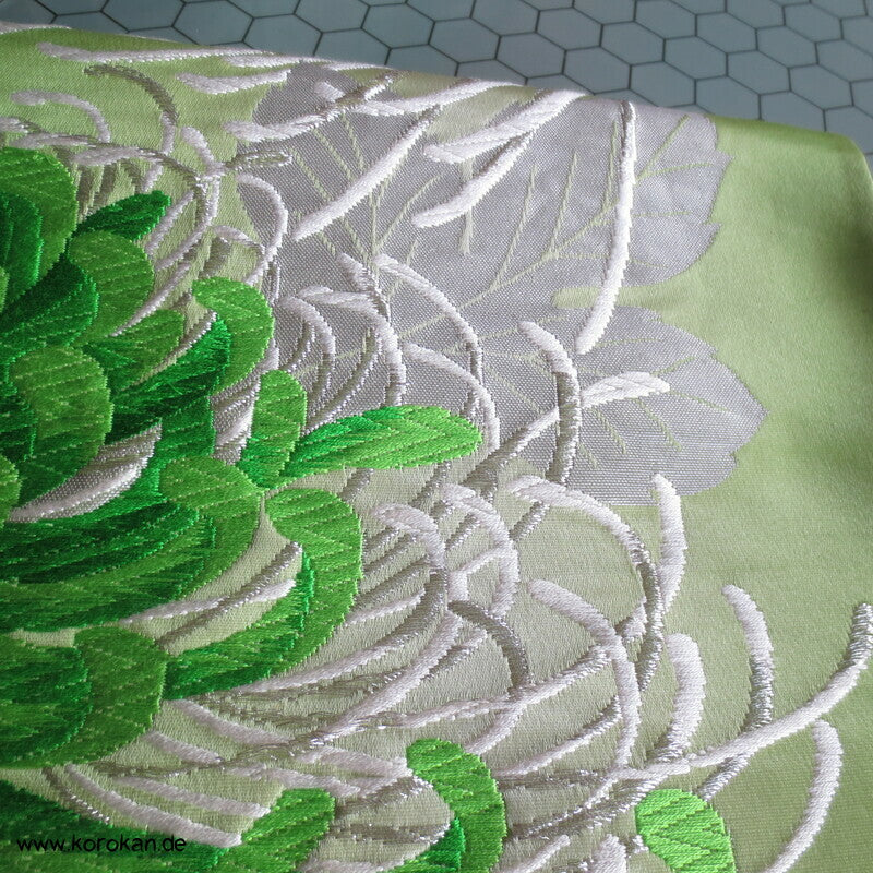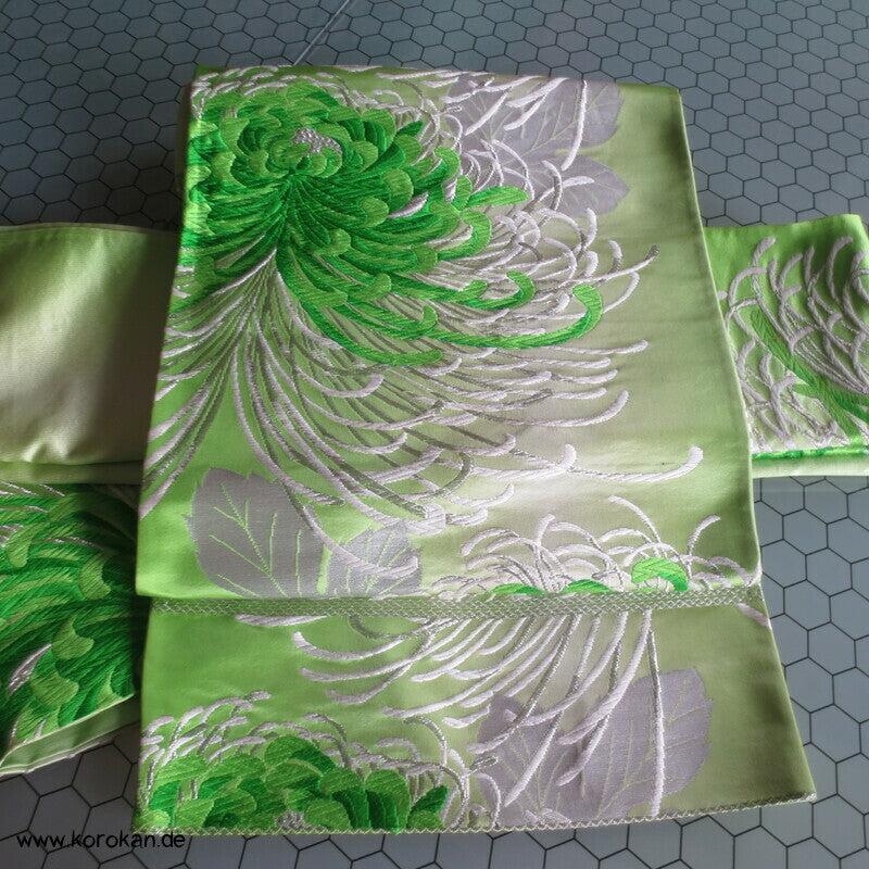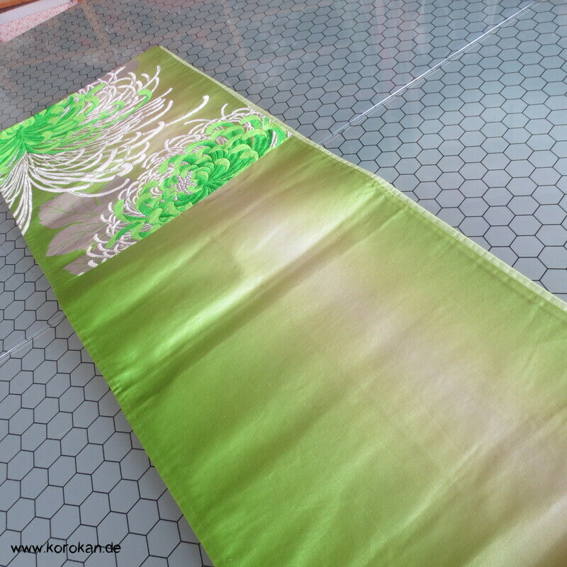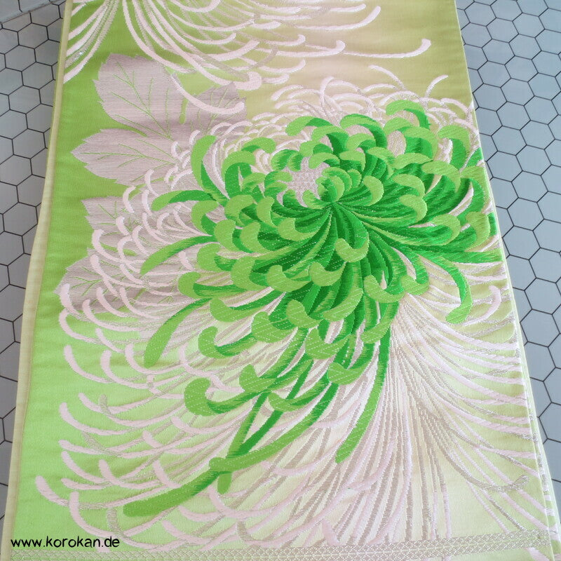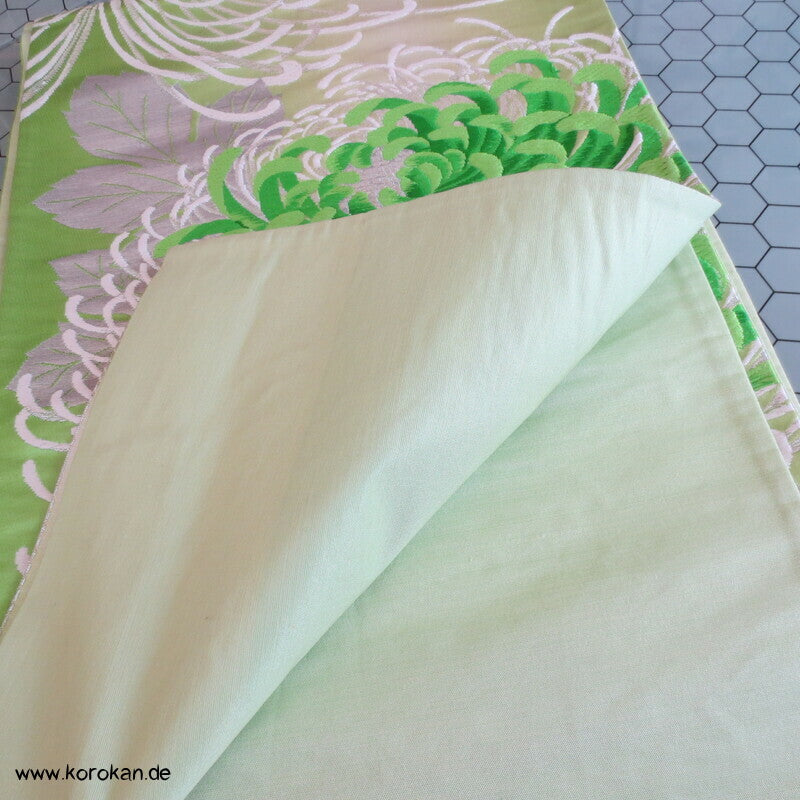 Vintage Fukuro Obi für Kimono Seidenbrokat Rangiku Crazy Chrysanthemen in grün mit Farbverlauf im Hintergrund