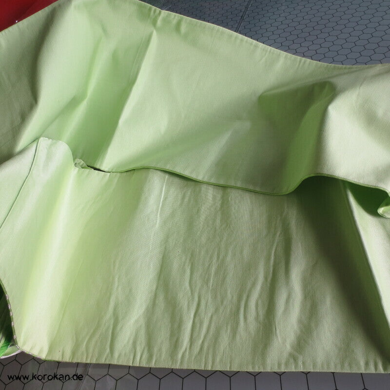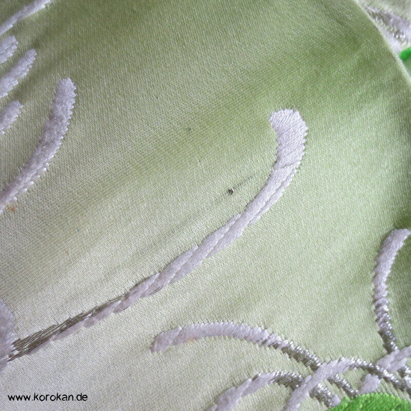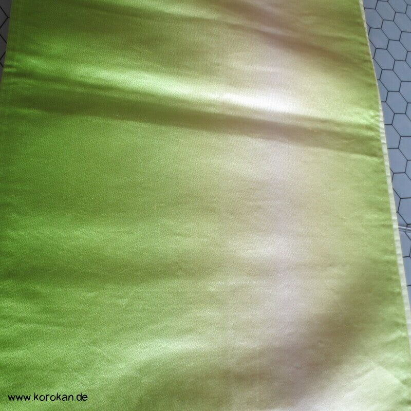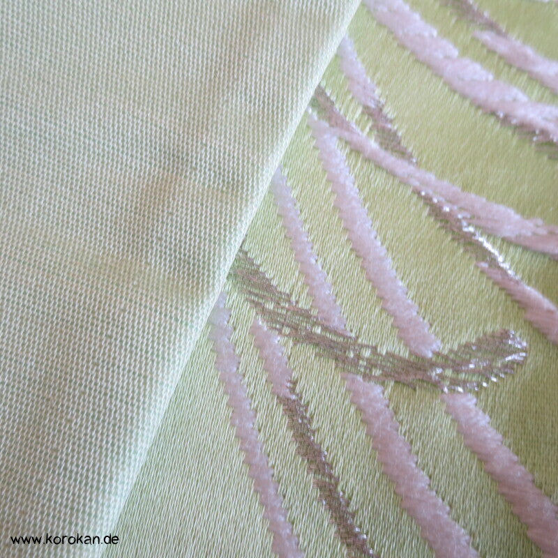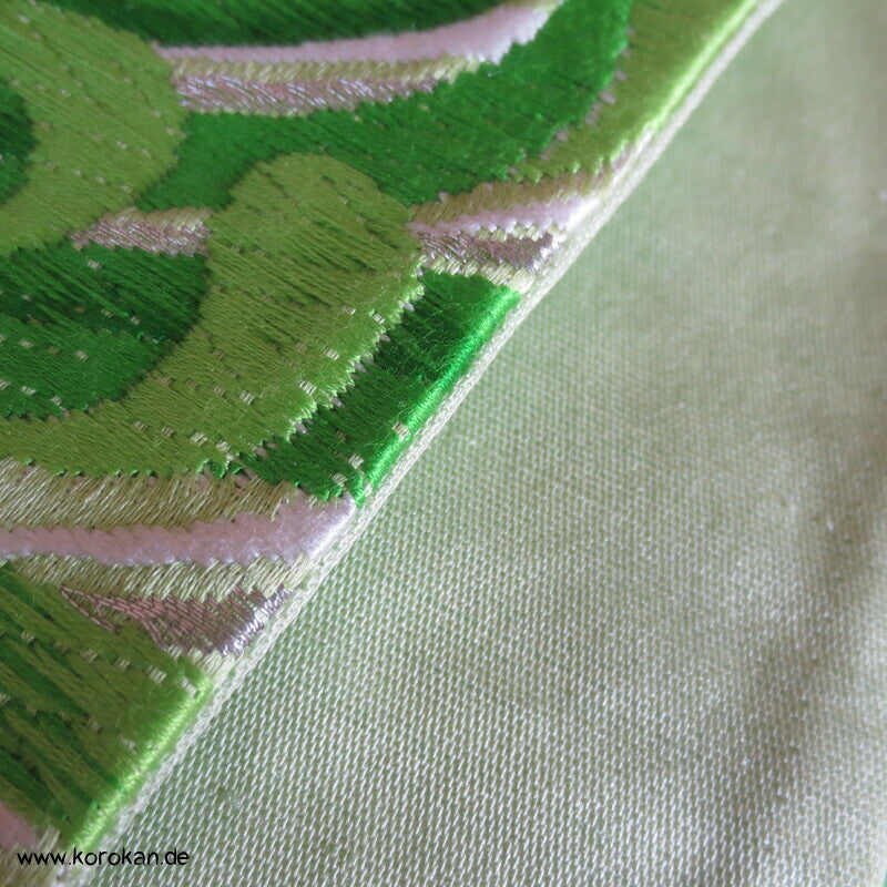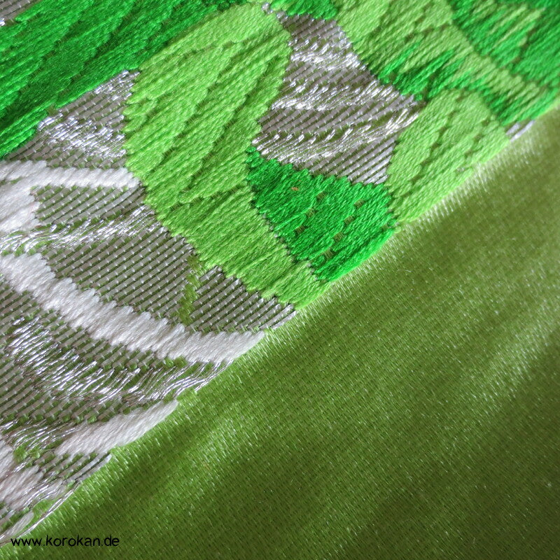 Vintage Fukuro Obi für Kimono Seidenbrokat Rangiku Crazy Chrysanthemen in grün mit Farbverlauf im Hintergrund