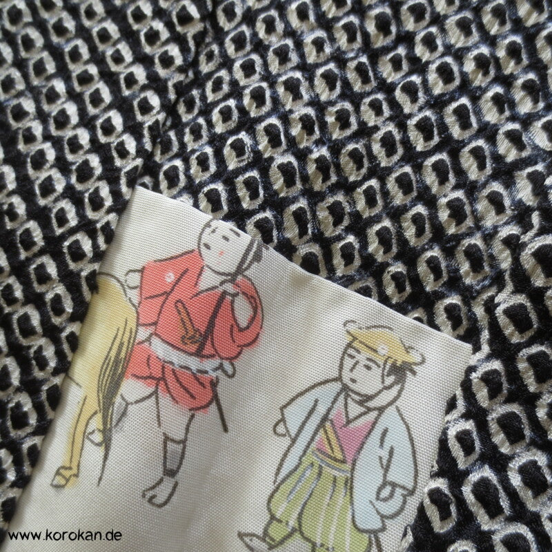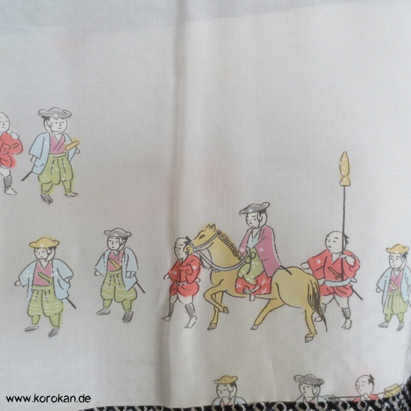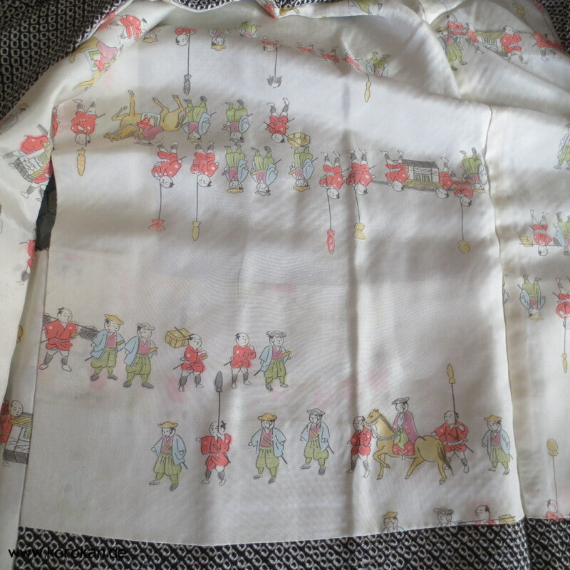 Vintage Haori Kimono Jacke Full Shibori Fächer auf Seidendamast, oberem Futter mit Daimyo Prozession Druck auf heller Seide