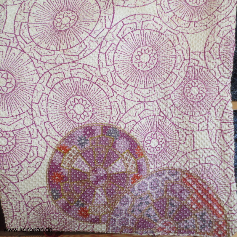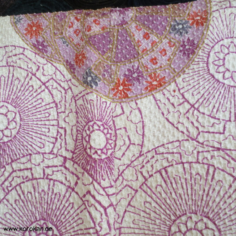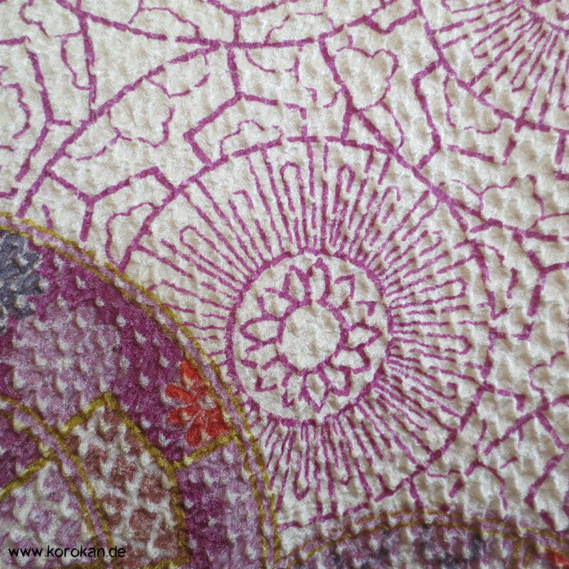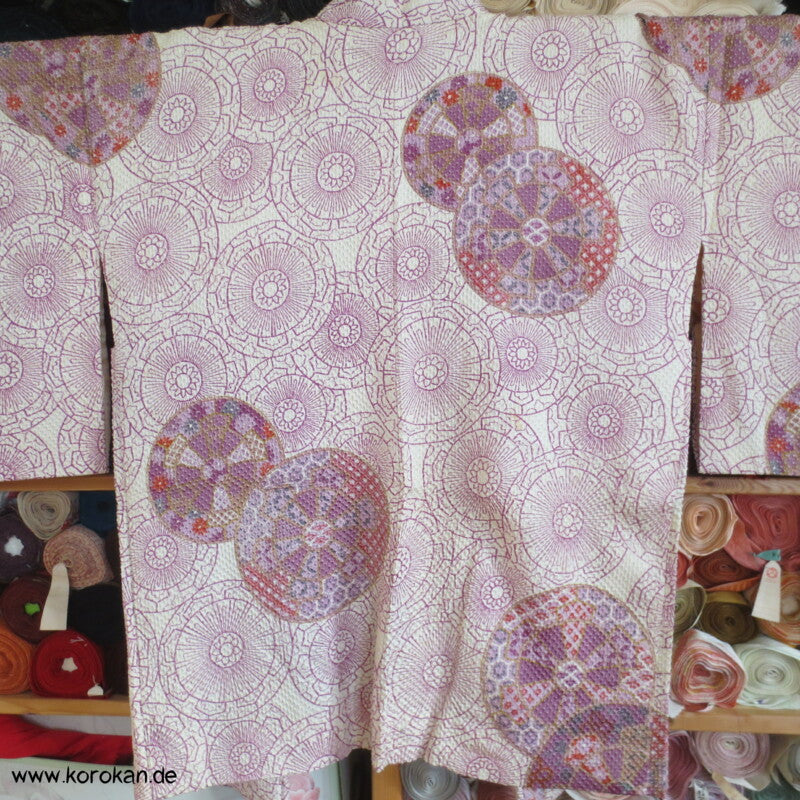 japanische Vintage Haori Kimono Jacke Shibori geprägter Seidendamast mit einem Genji Guruma Druck, oberem Futter mit Blütenddruck auf heller Seide, mit durchbrochen geflochtenem Himo