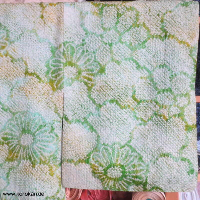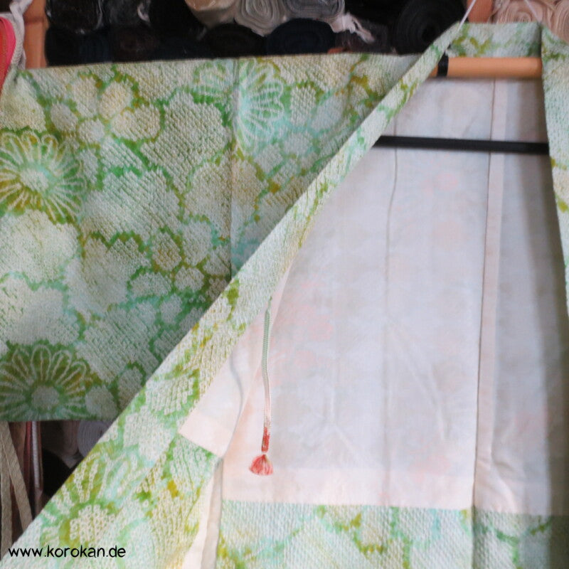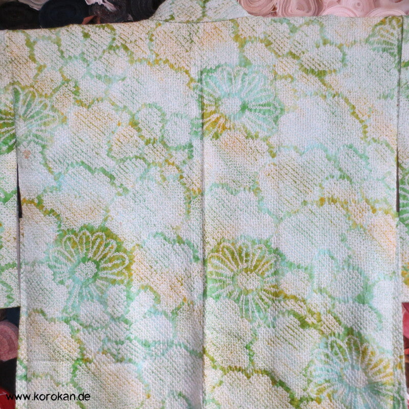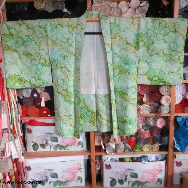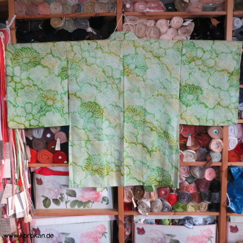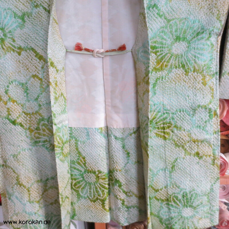 Full Shibori hellgrüne Blüten Seidendamast Haori Kimonojacke mit Himo