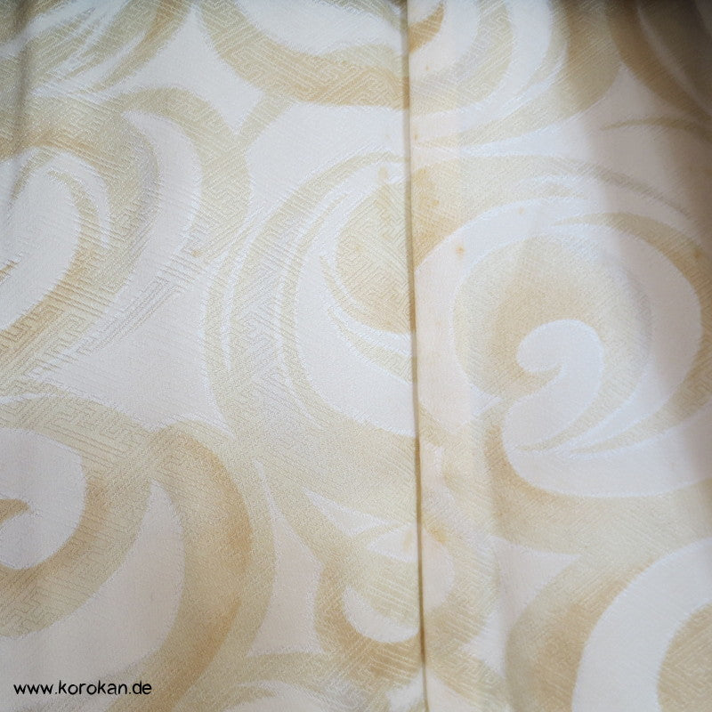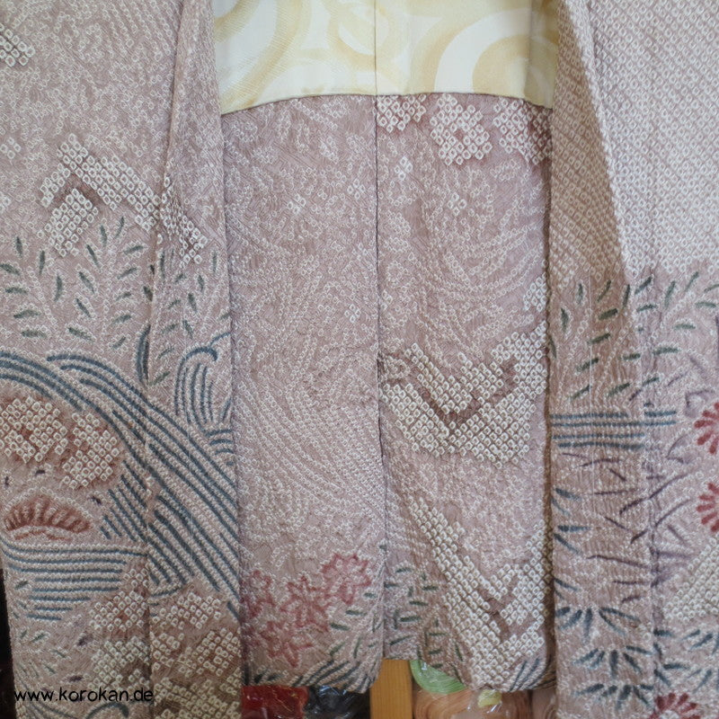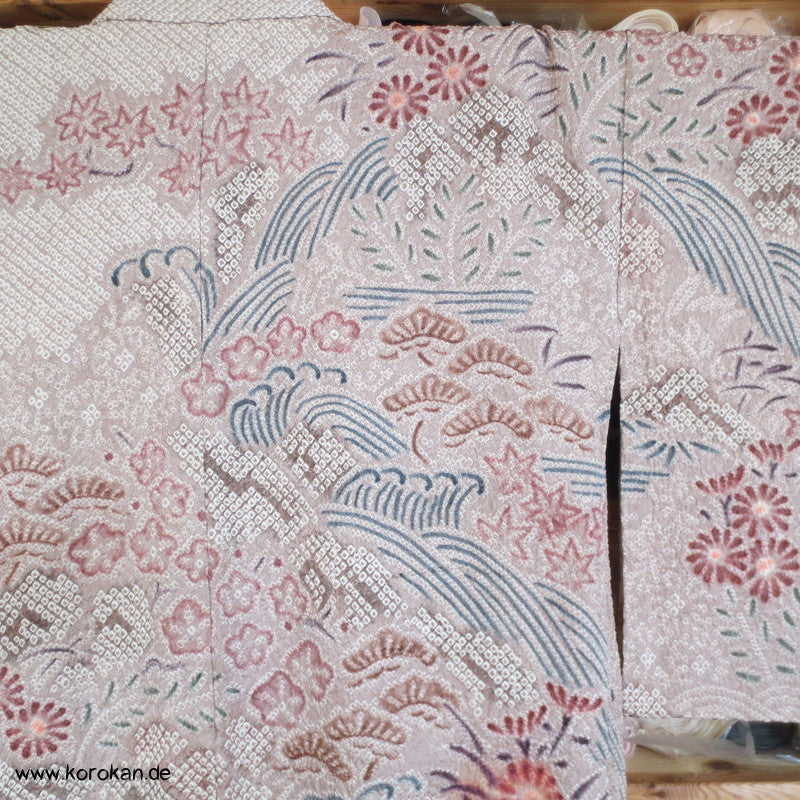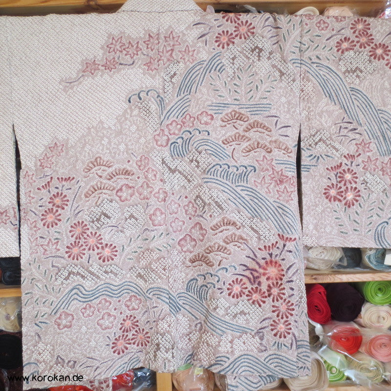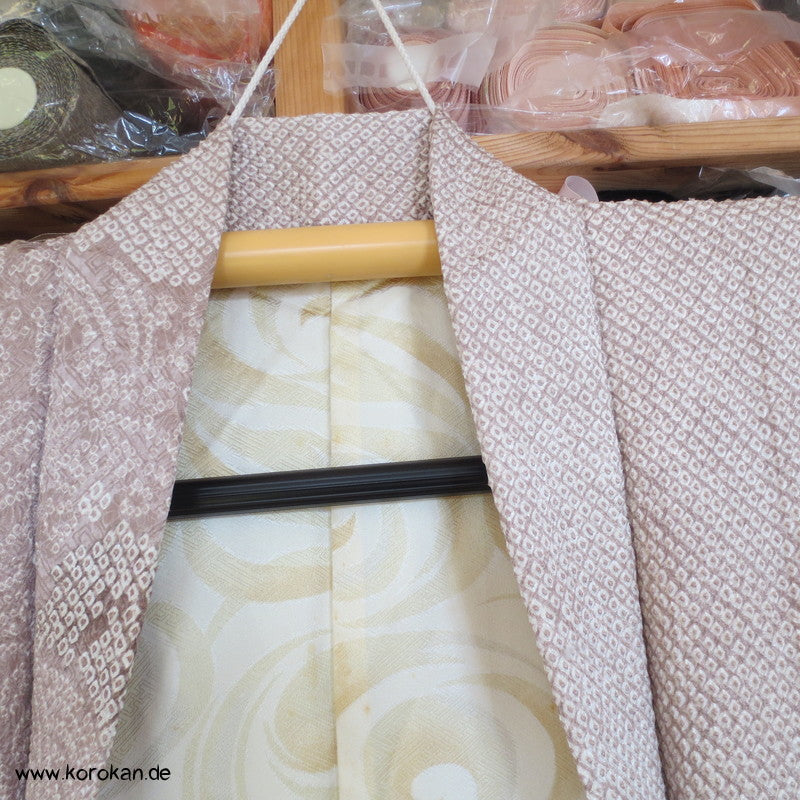 Vintage Haori Kimono Jacke Full Shibori Wasserfall mit Blumen Seidendamast, oberem Futter mit Kringeldruck auf heller Seide