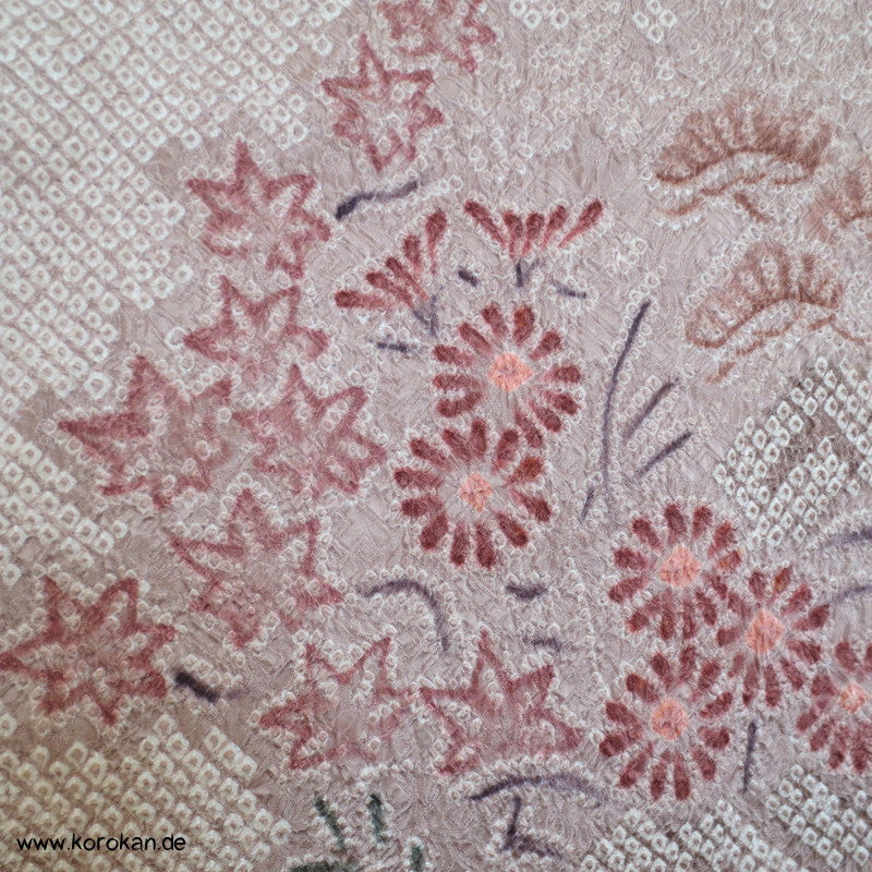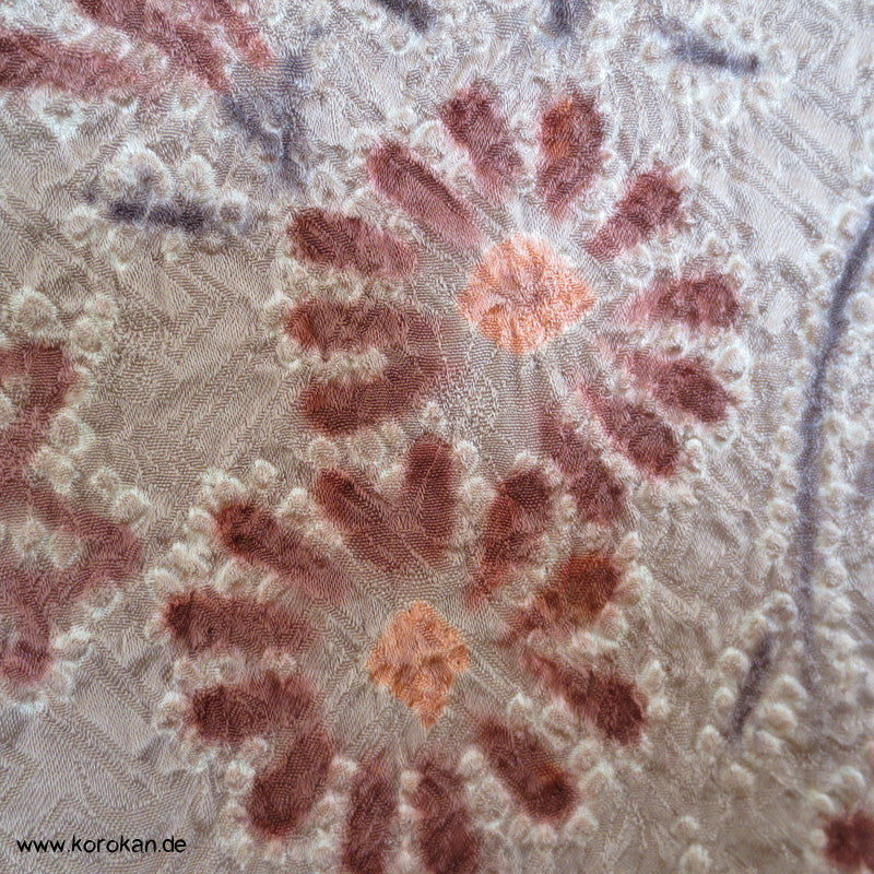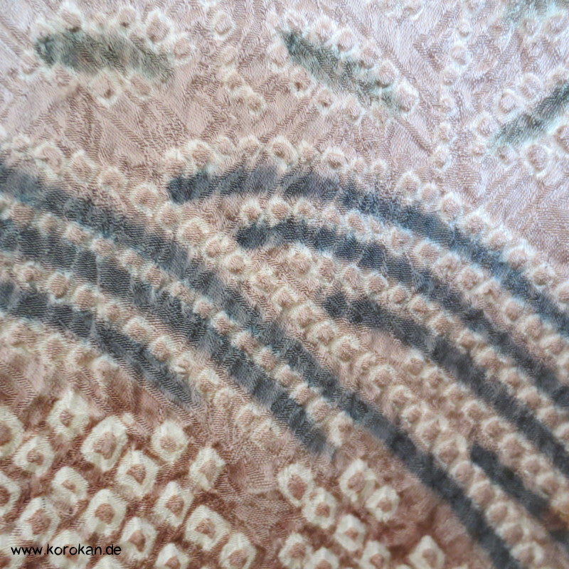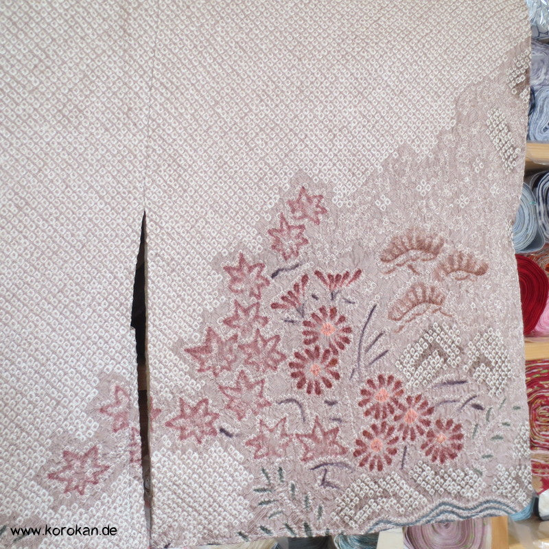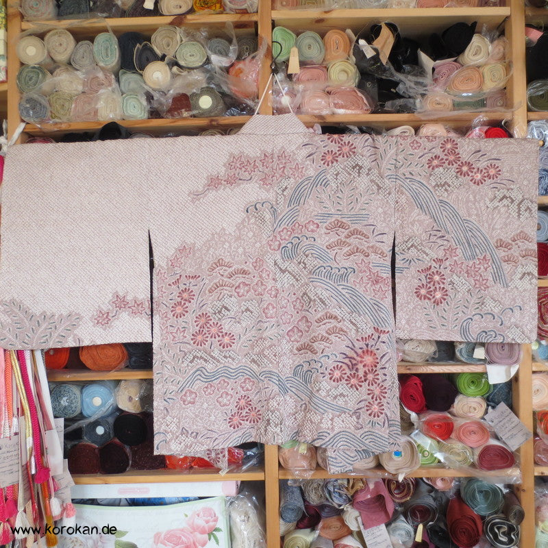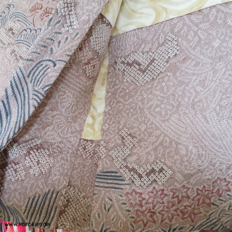 Vintage Haori Kimono Jacke Full Shibori Wasserfall mit Blumen Seidendamast, oberem Futter mit Kringeldruck auf heller Seide