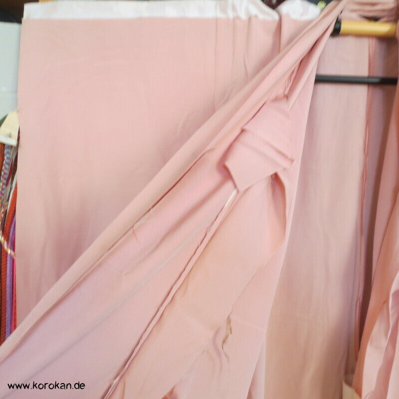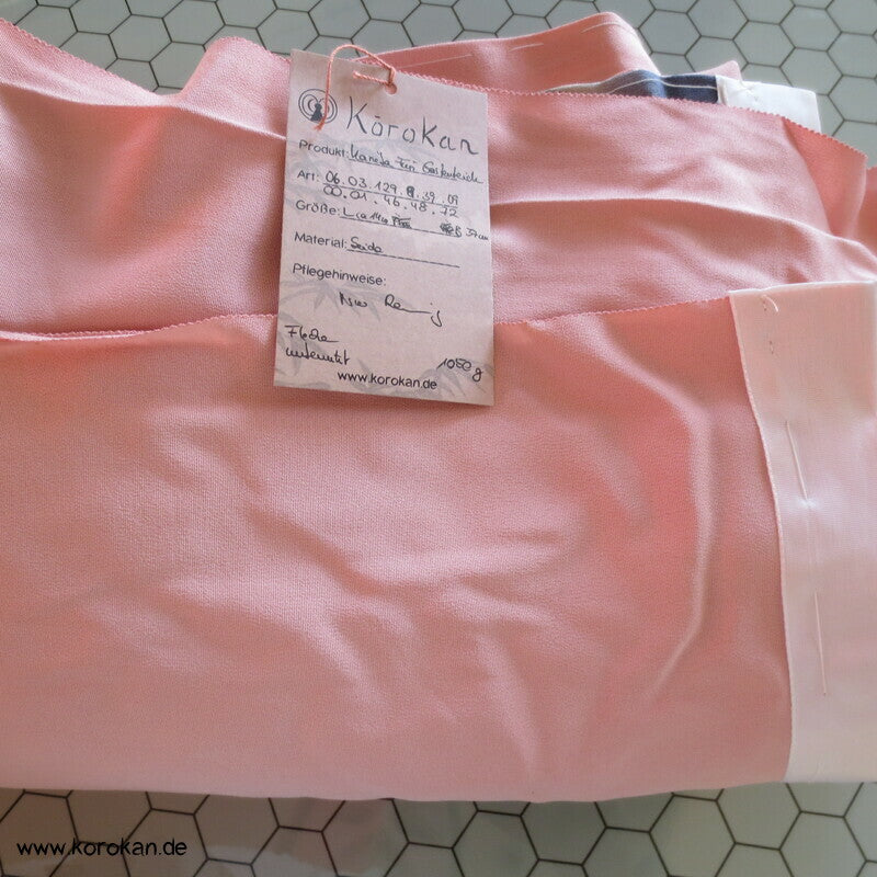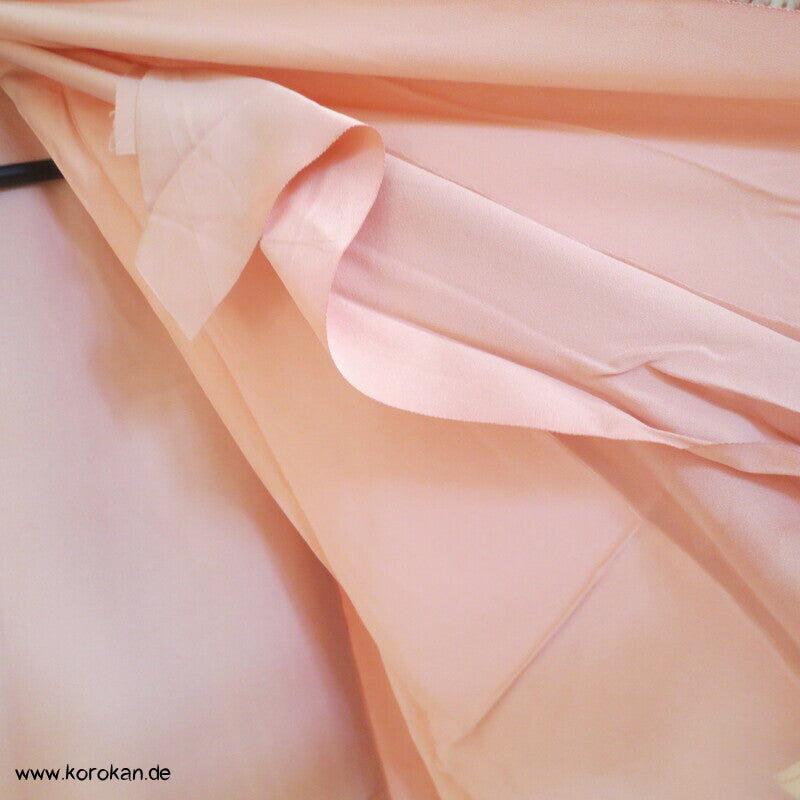 Vintage unbenutzter Karieba Homongi Kimono, feine zartrosa Crepeseide mit einem Blumenzweigemuster in pastelligen Tönen. Zugeschnitten, geheftet, nicht genäht, neuer Stoff aber mit einem Wasserfleck im Motiv - nicht mehr unbedingt für einen Kimono zu verwenden