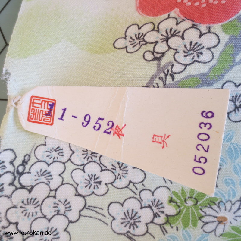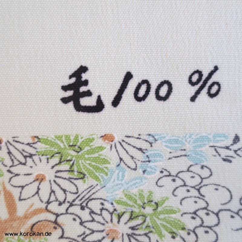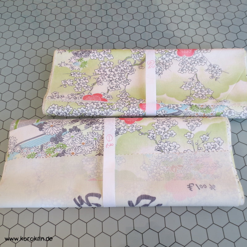 japanische Vintage unbenutzter Stoffrest Kimono Wolle natur mit Booten zwischen Blüten am Fluss Motiven