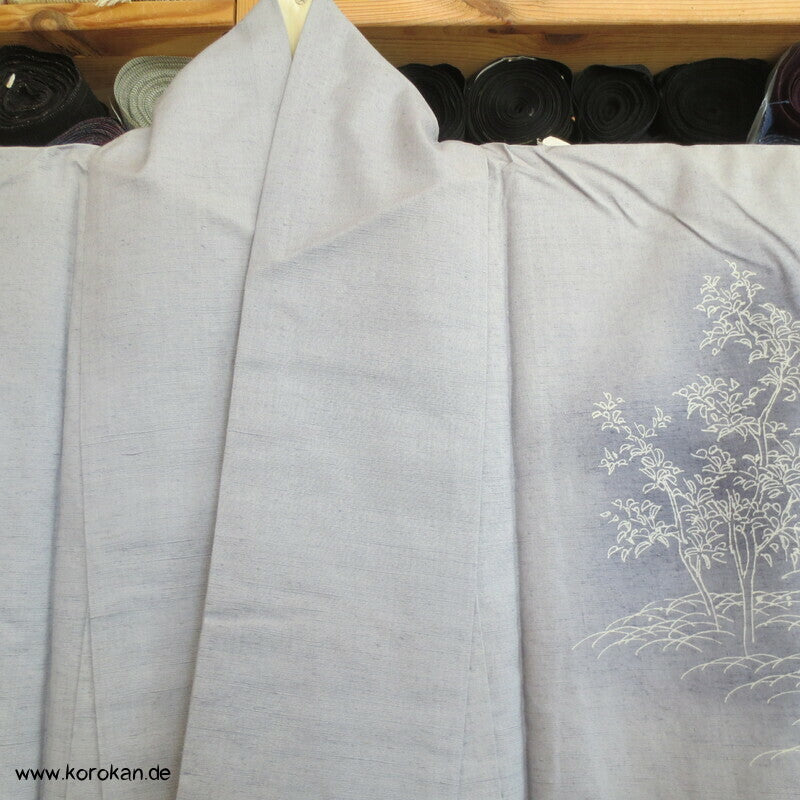 Vintage Tsumugi Seiden Tsukesage Kimono mit getrennten Gartenszenen auf blaugrau, oberes Futter helle Seide, unteres Hakkake Futter mauve Honan Seide