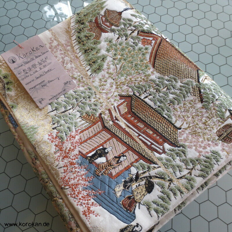Vintage Fukuro Obi mit ganzer Dorfszenerie aus alten Heian Zeiten, sehr detailliert