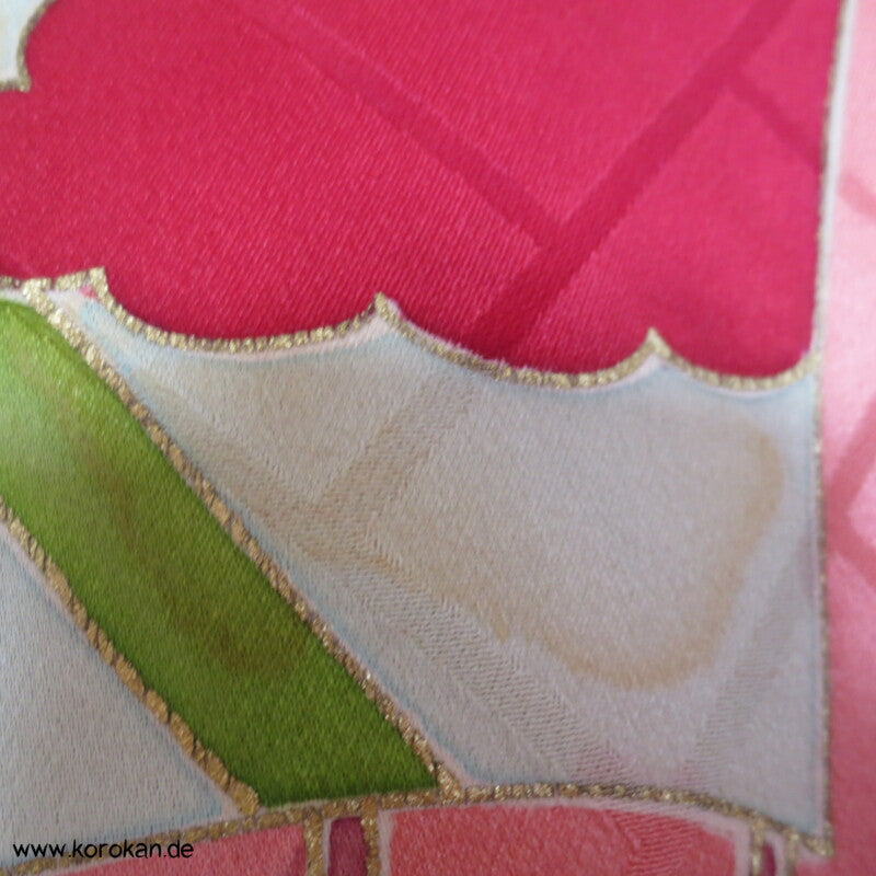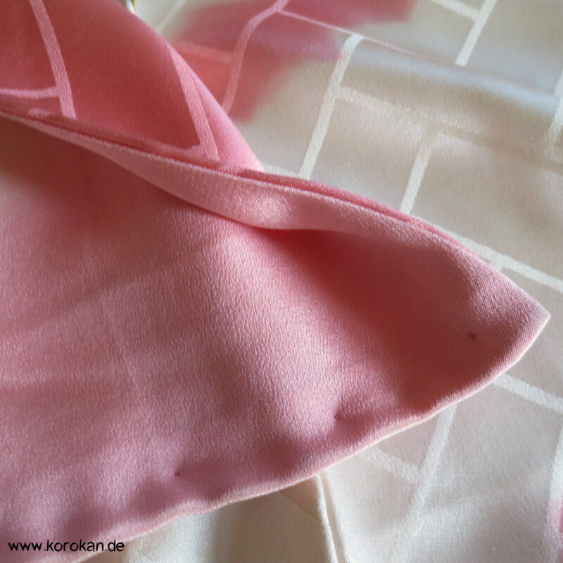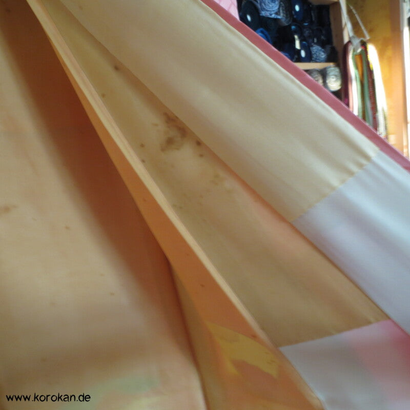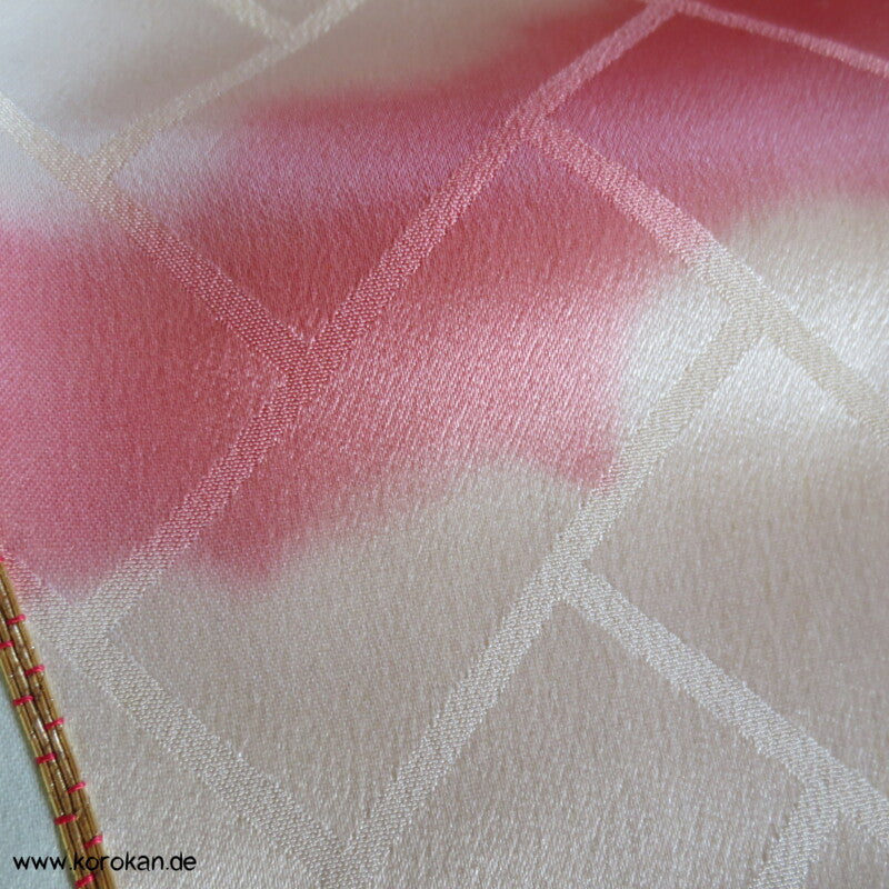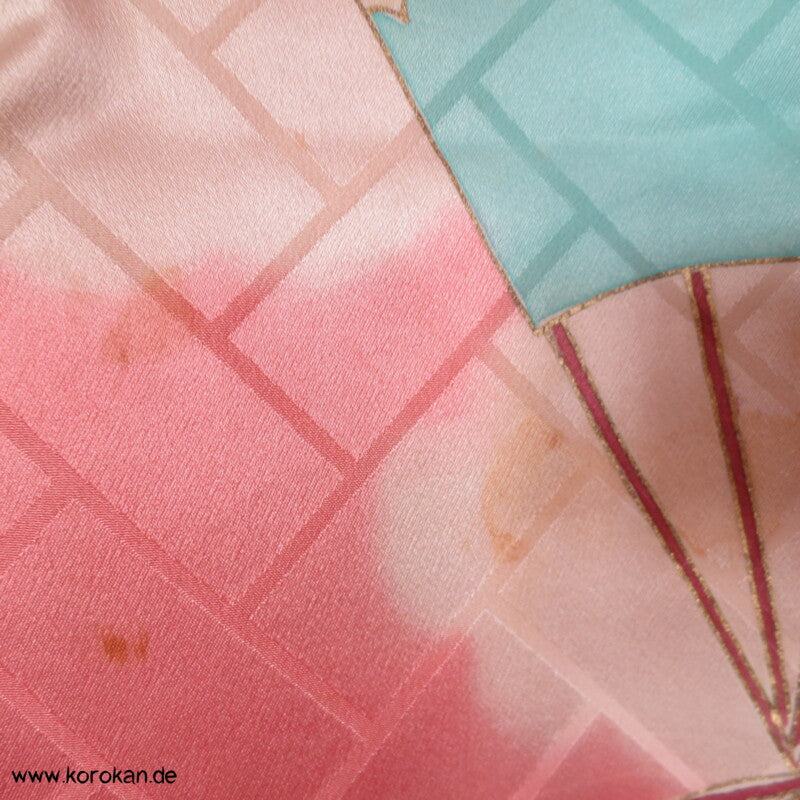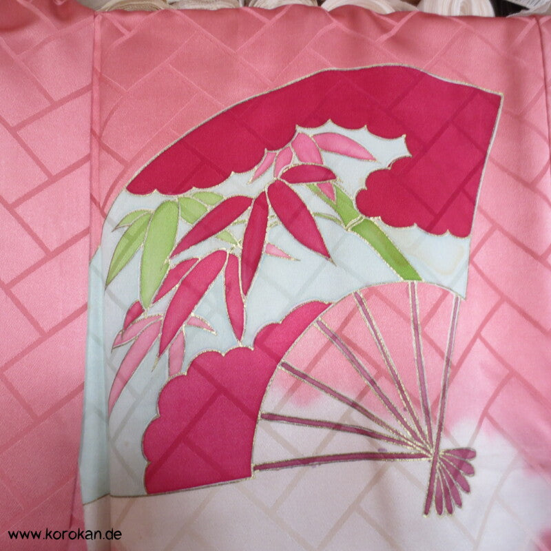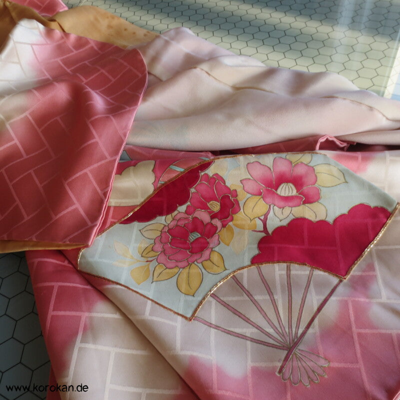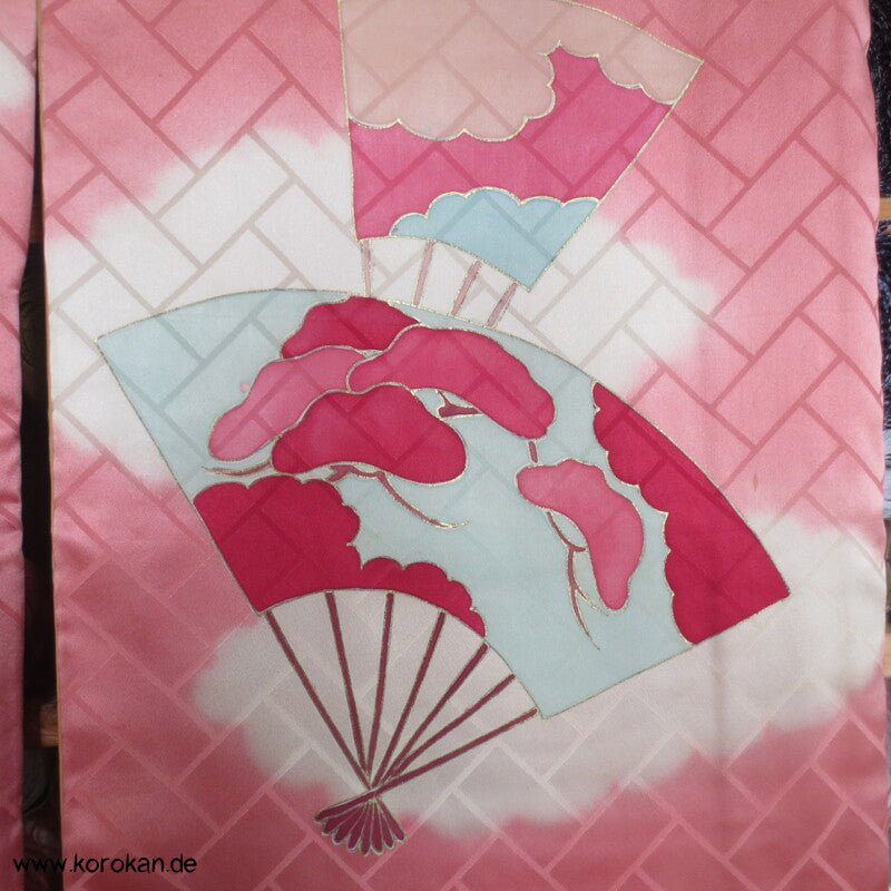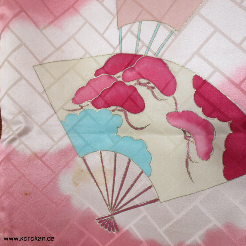 Vintage Furisode Higaki Seidendamast mit großen Fächer mit Motiven, oberes Futter helle Seide, unteres Hakkake aus Seidencrepe mit rosa Bokashi Verlaufsrand.