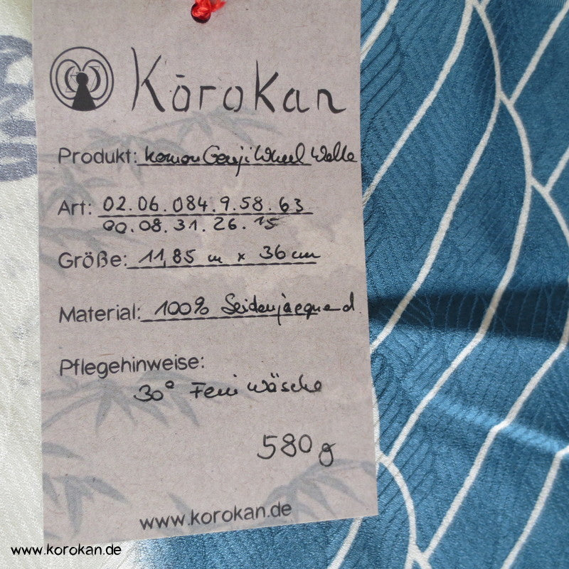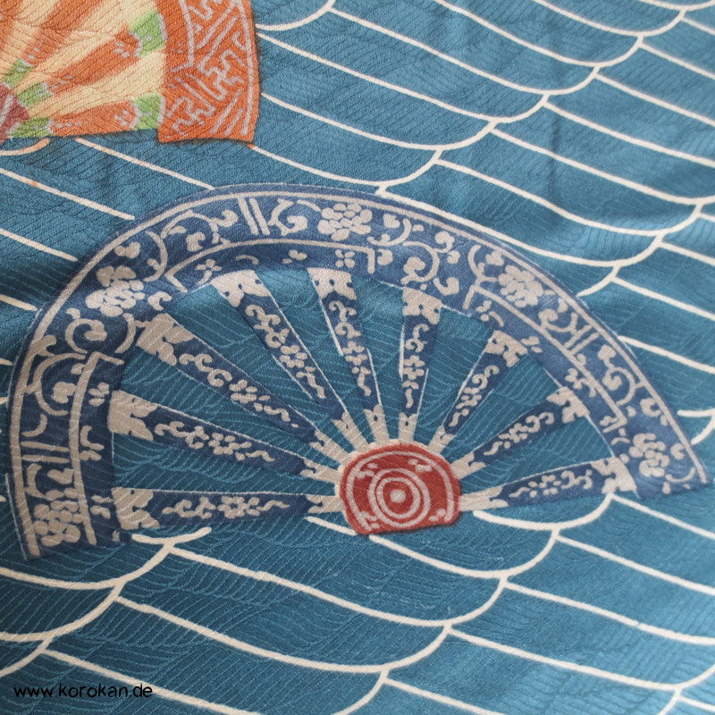 Vintage unbenutzte Wellen Damast Seide mit Genji Guruma Rädern in Wellendruck Stoffrolle = Tanmono mit Stempeln.