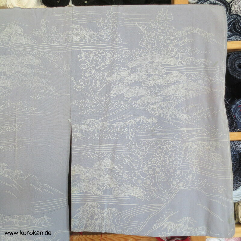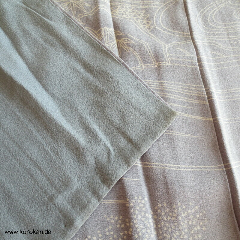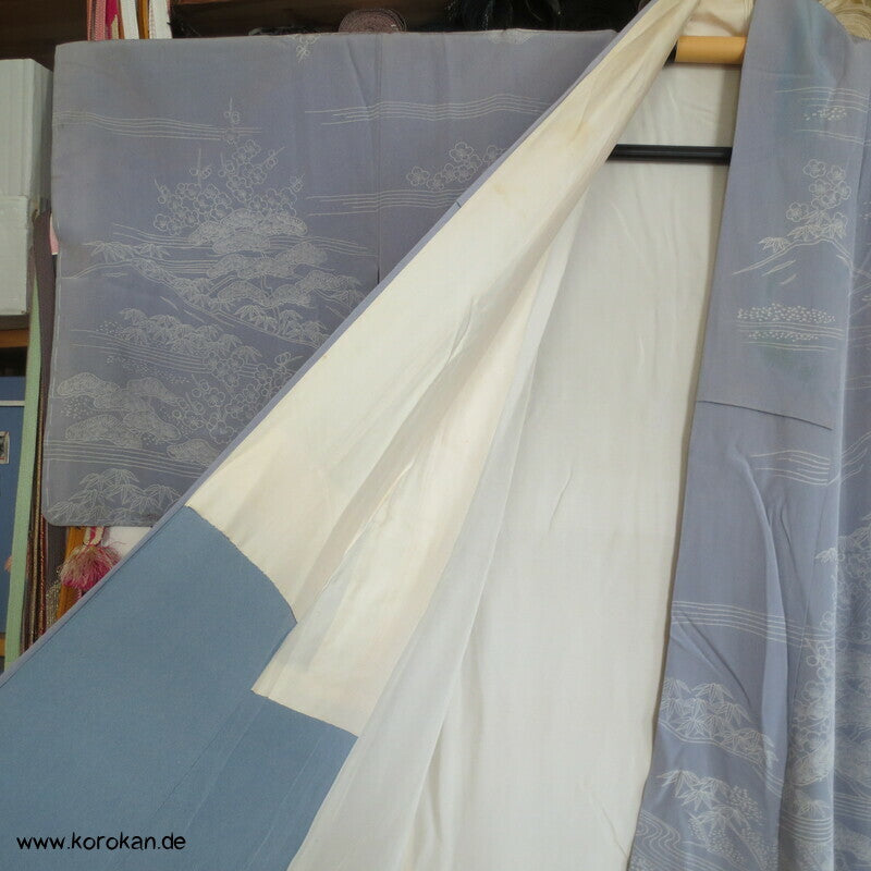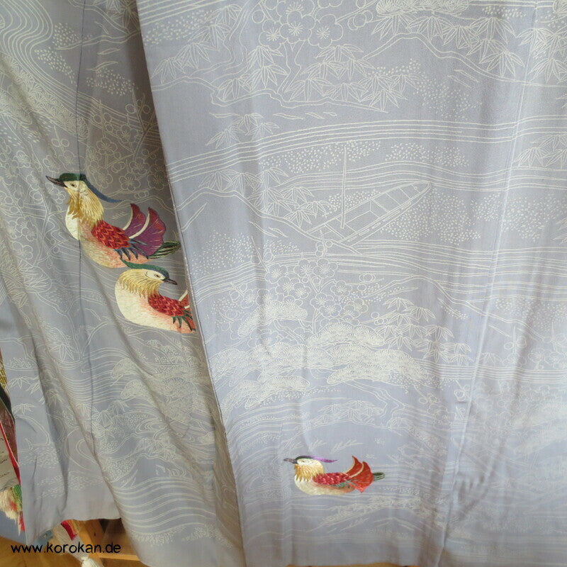 Vintage Homongi Kimono Seidencrepe, bestickt mit Mandarinenten auf blaugrau Farbverlauf, feinem oberen Seidenfutter und unterem Hakkake mit hellbleu Verlaufsrand Seidenfutter.