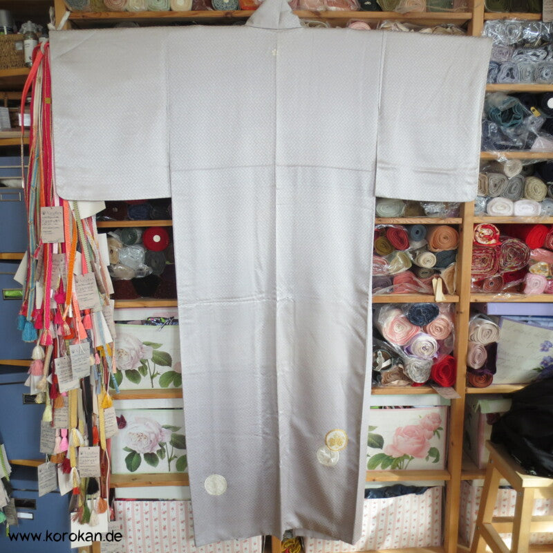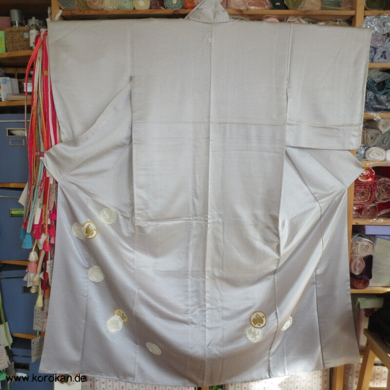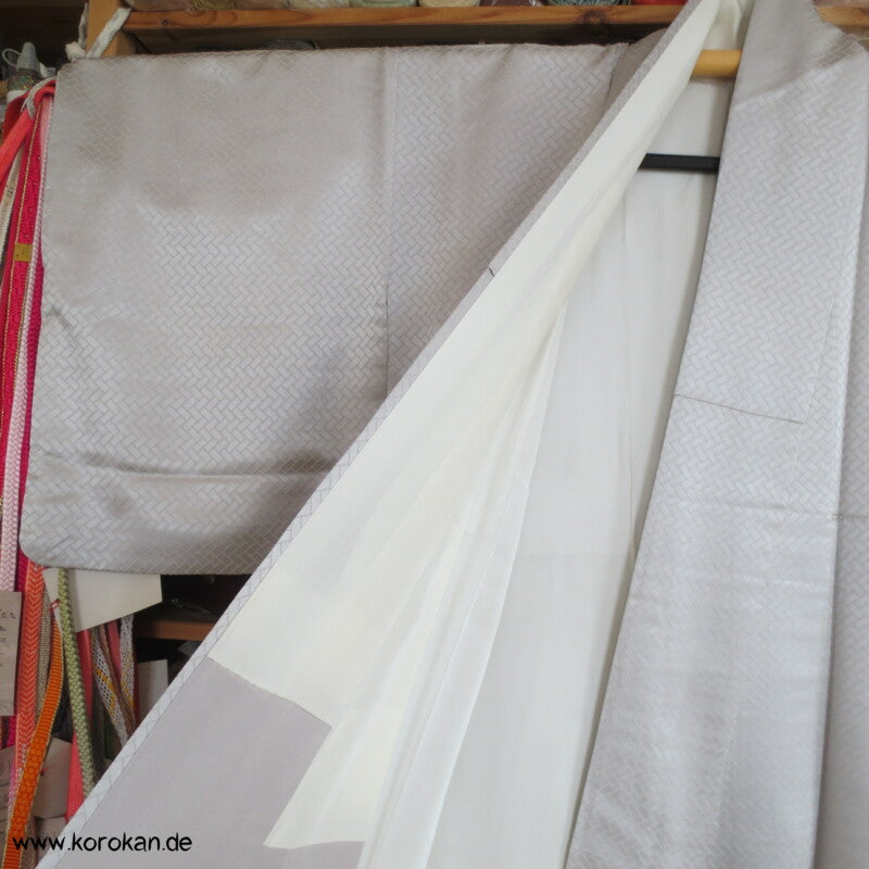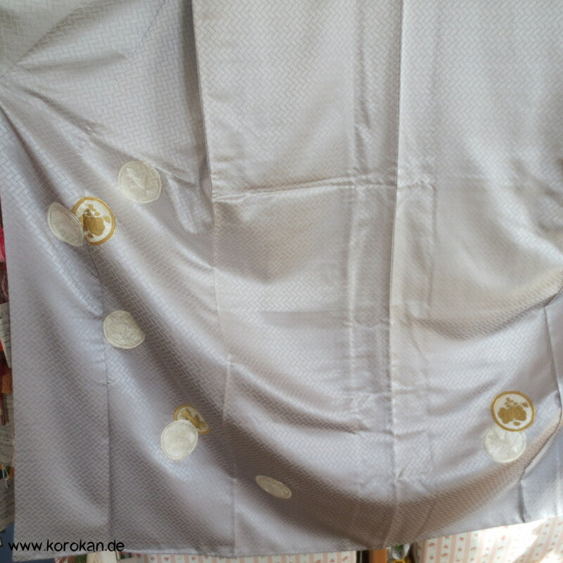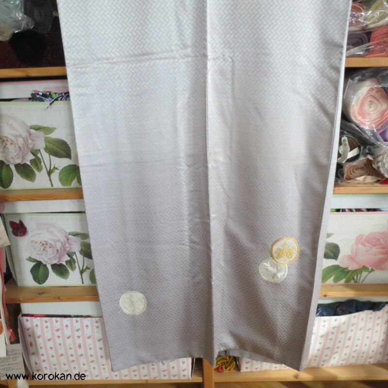 Vintage Homongi Kimono Higaki Seidendamast , teilbestickt mit Mon, oberem hellen Seiden Futter und unterem Hakkake Futter Seidencrepe grau.