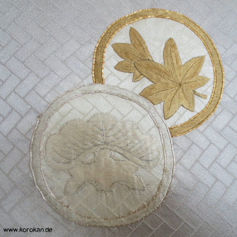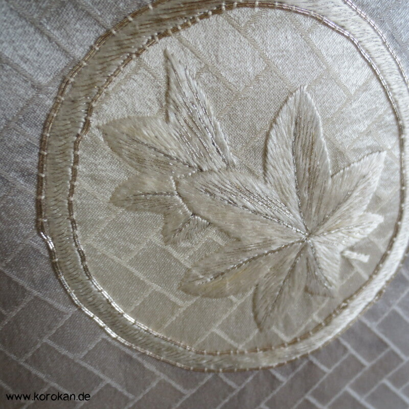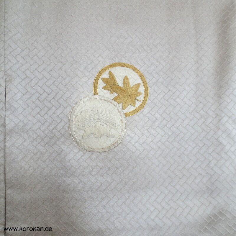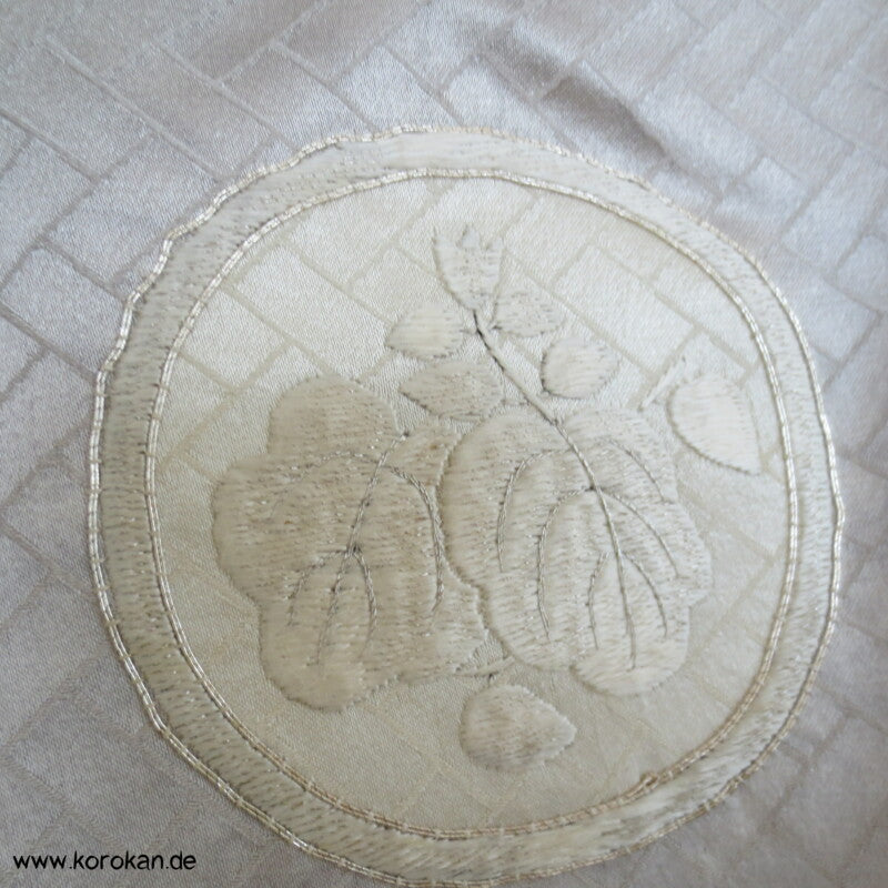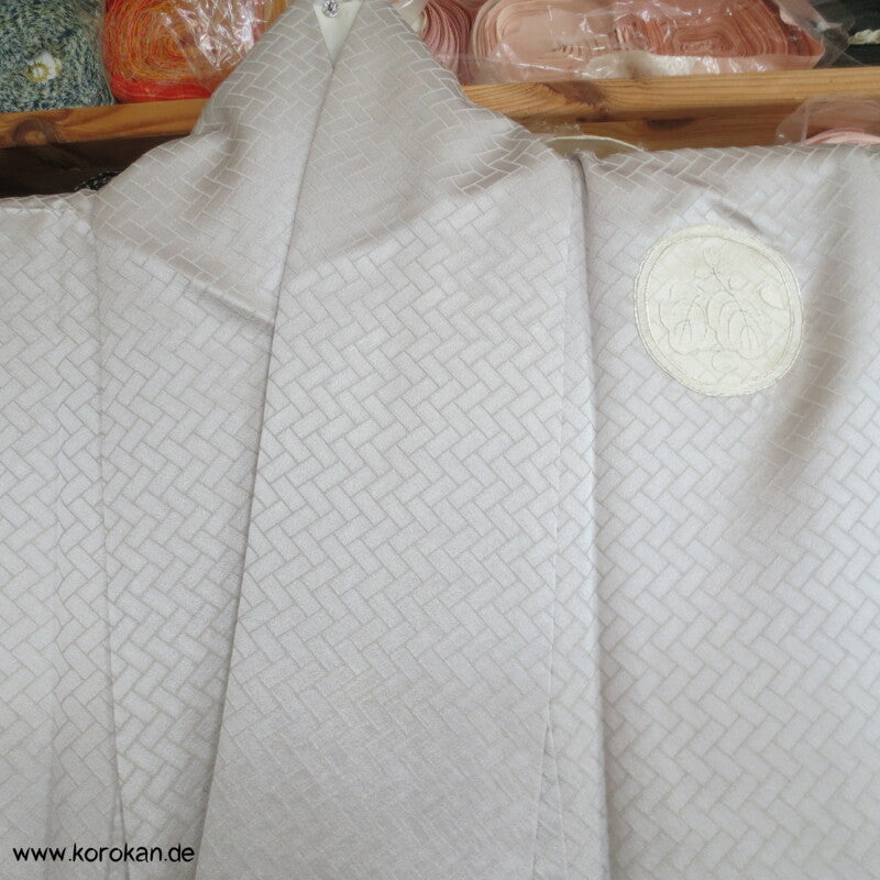 Vintage Homongi Kimono Higaki Seidendamast , teilbestickt mit Mon, oberem hellen Seiden Futter und unterem Hakkake Futter Seidencrepe grau.