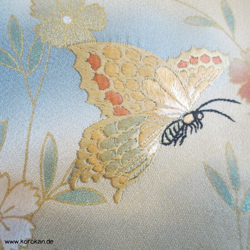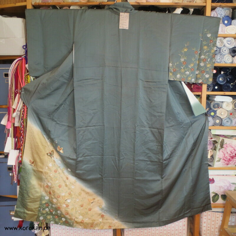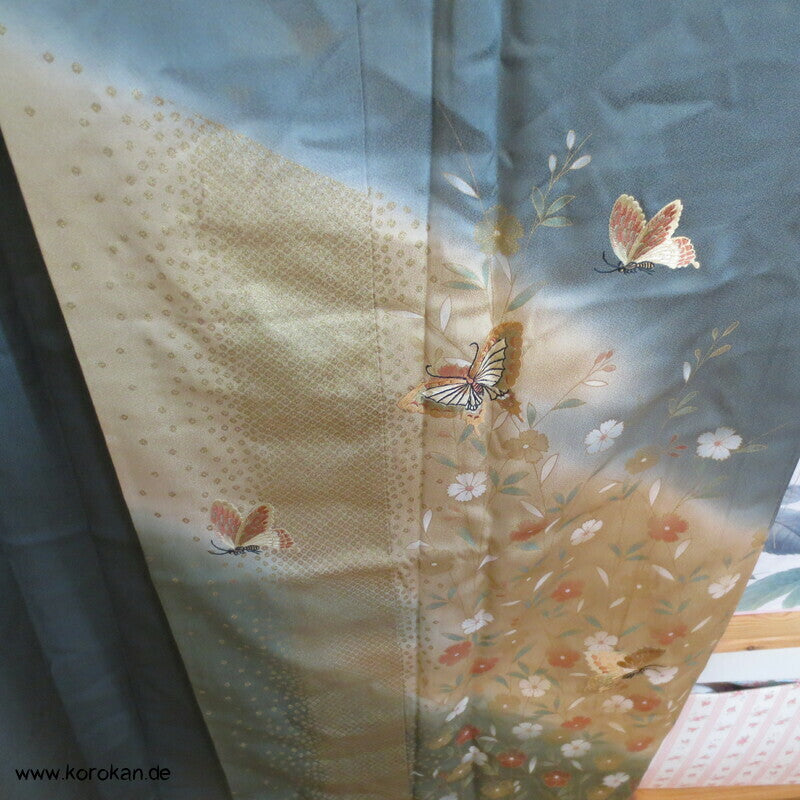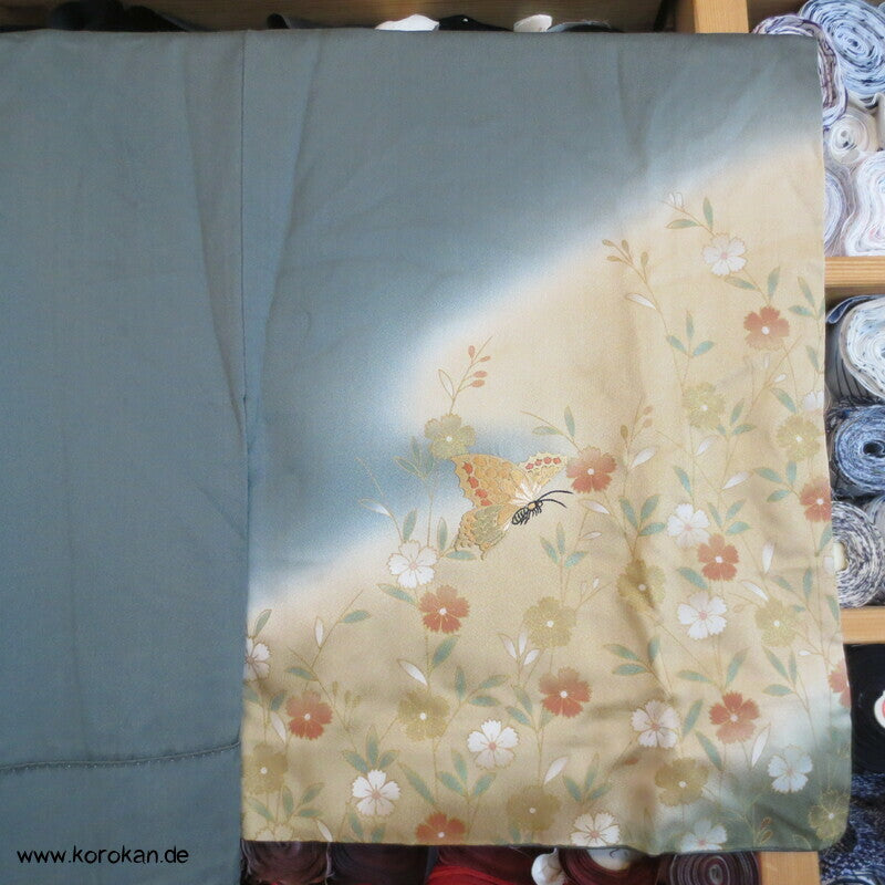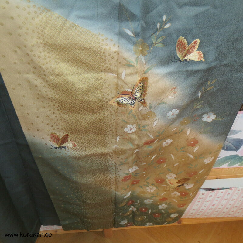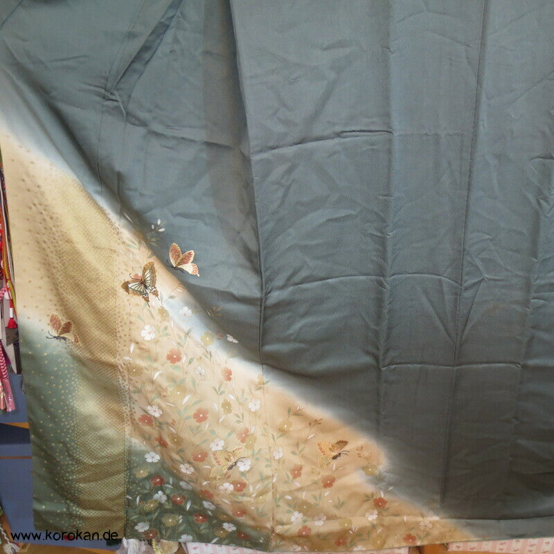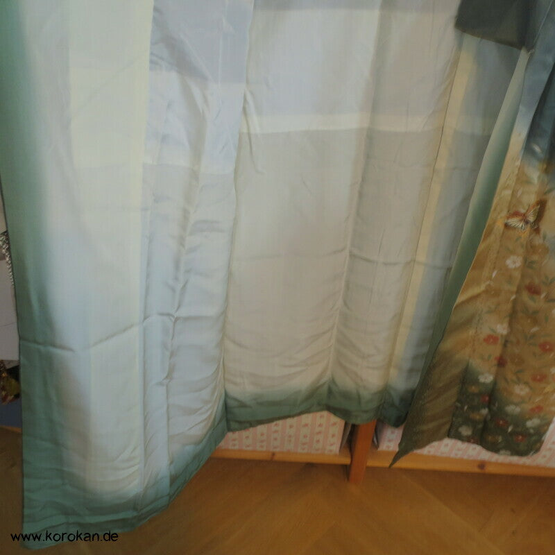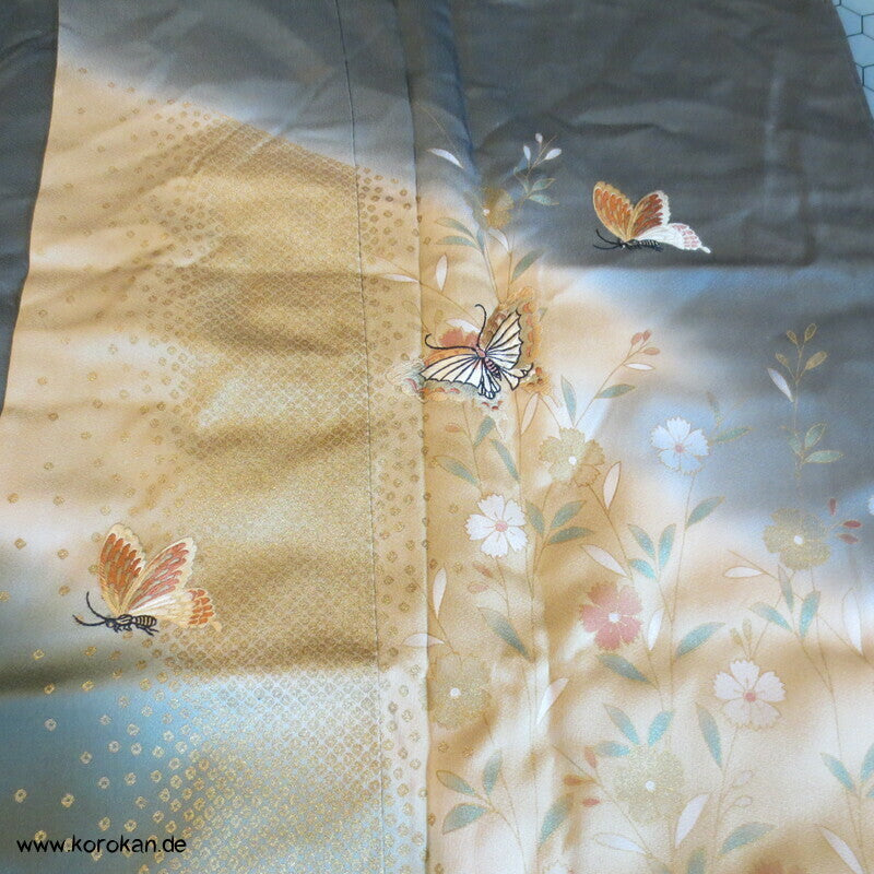 Vintage Homongi Kimono aus grauem Seidendamast mit Stickerei Schmetterlingen in einem Farbschwung, feinem oberen hellen Seidenfutter und unterem Hakkake Seidenfutter mit moosgrünem Bokashi Verlaufsrand.