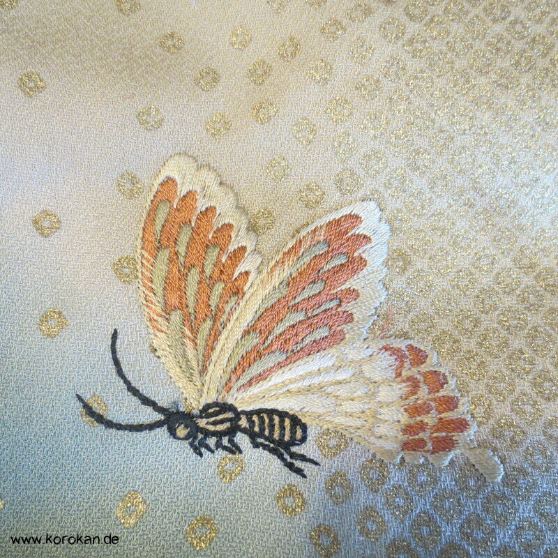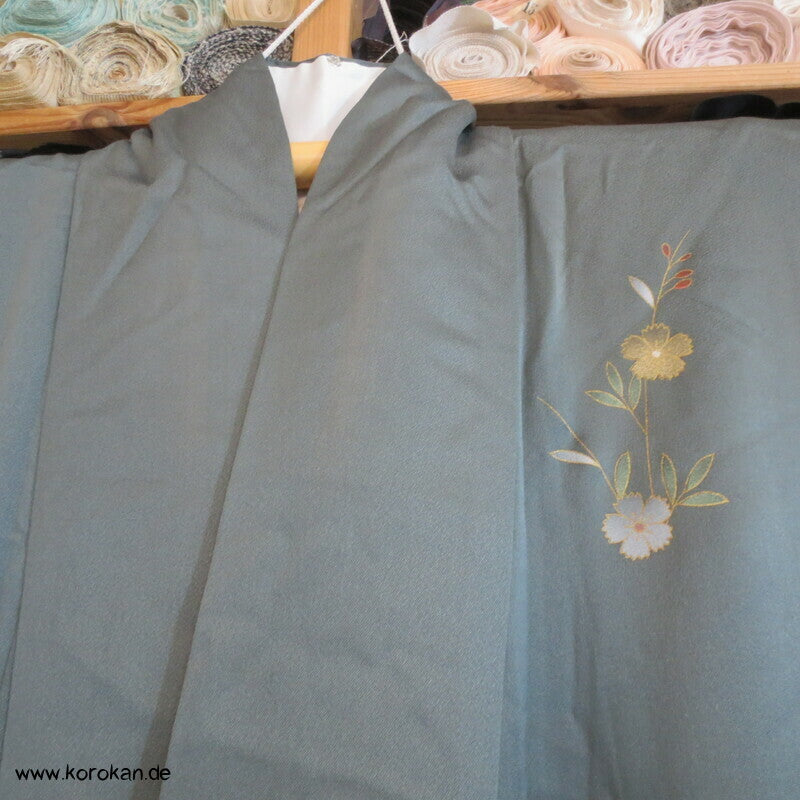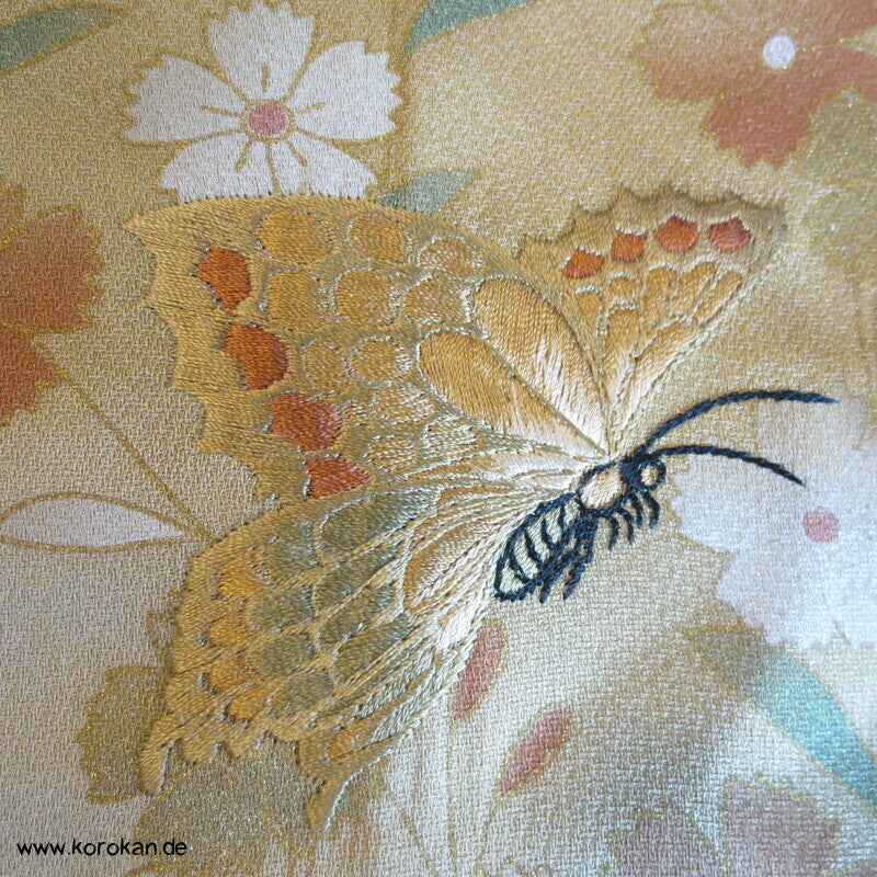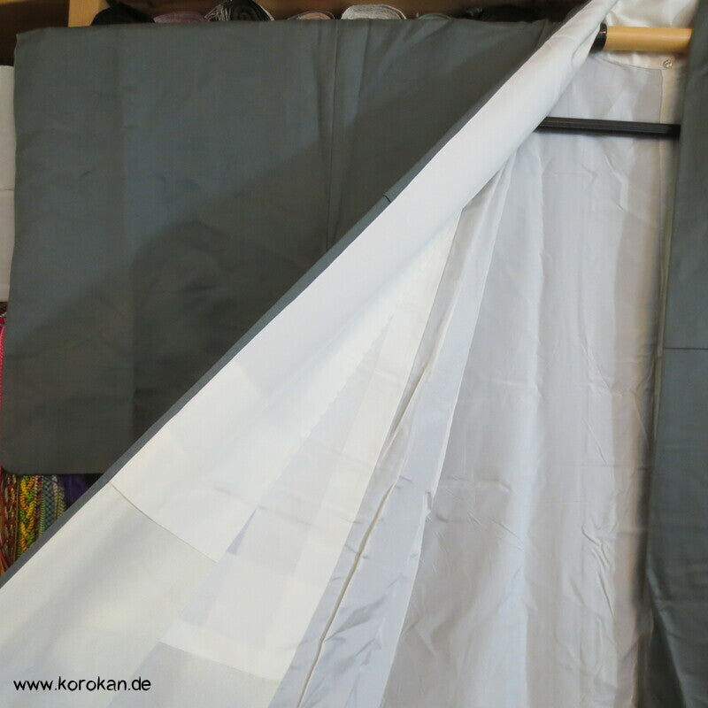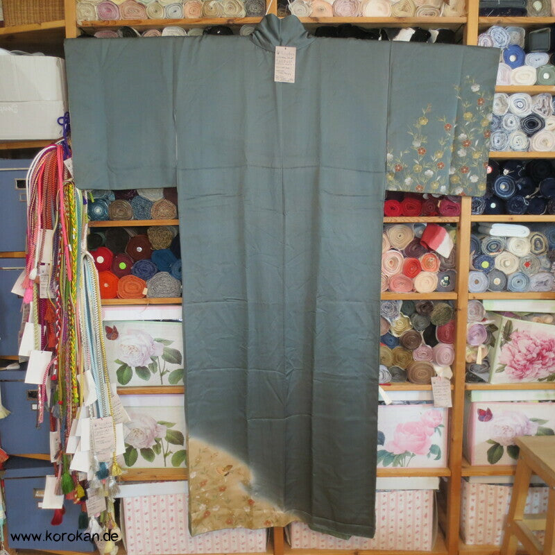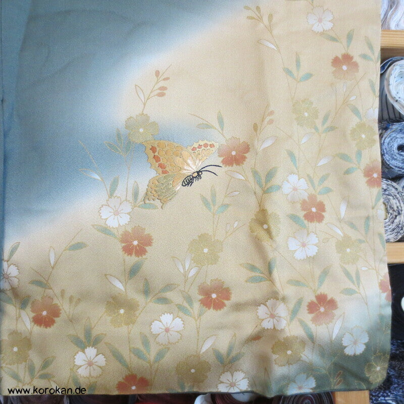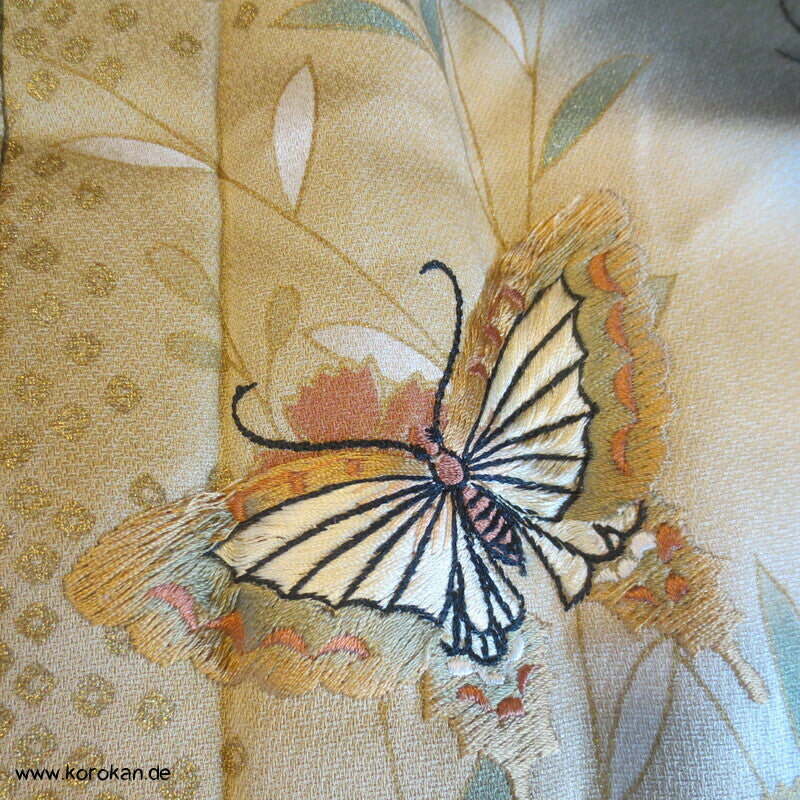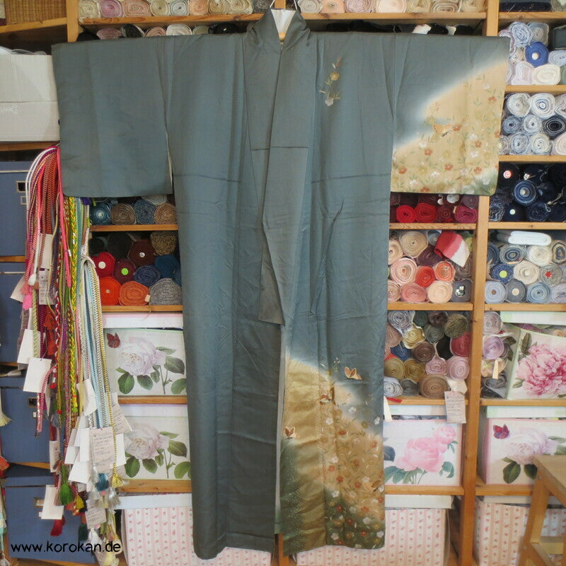 Vintage Homongi Kimono aus grauem Seidendamast mit Stickerei Schmetterlingen in einem Farbschwung, feinem oberen hellen Seidenfutter und unterem Hakkake Seidenfutter mit moosgrünem Bokashi Verlaufsrand.