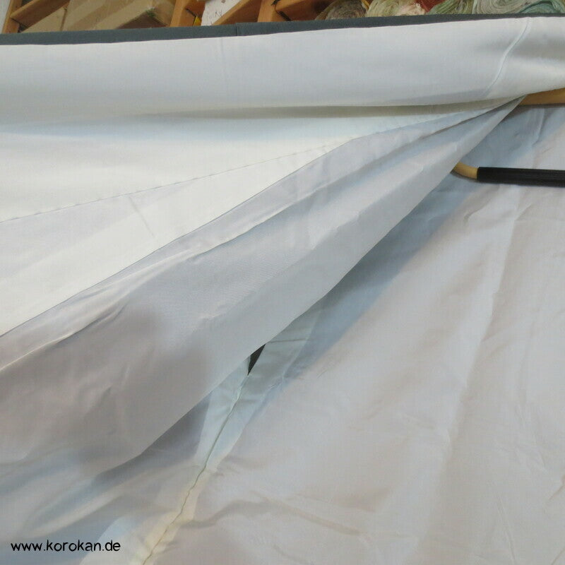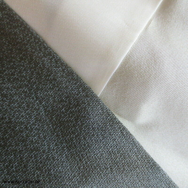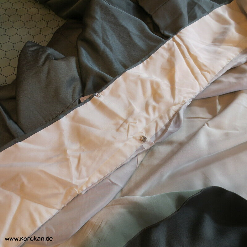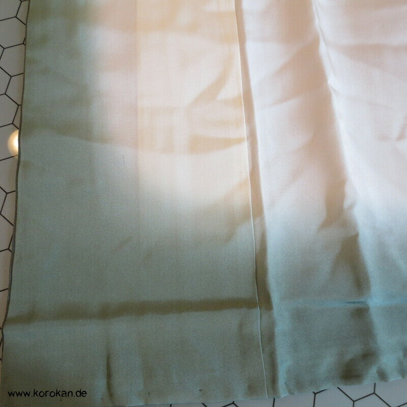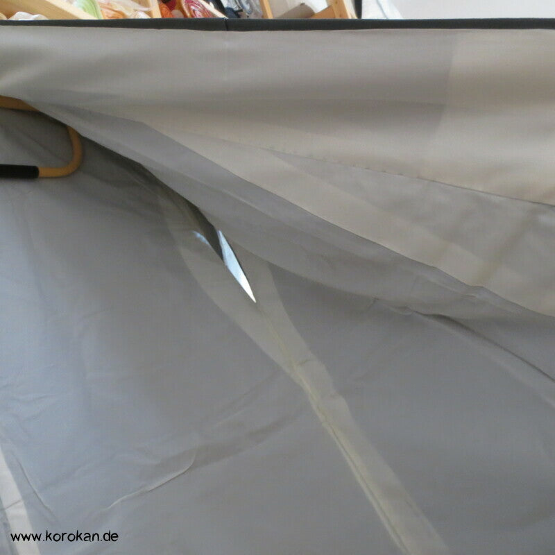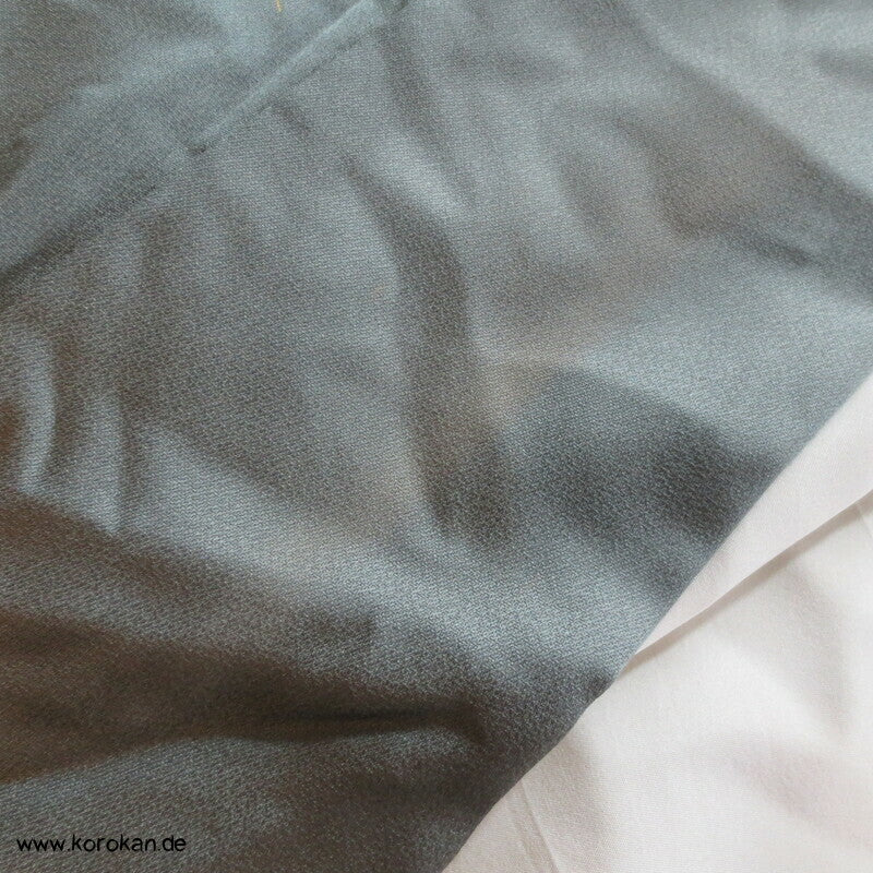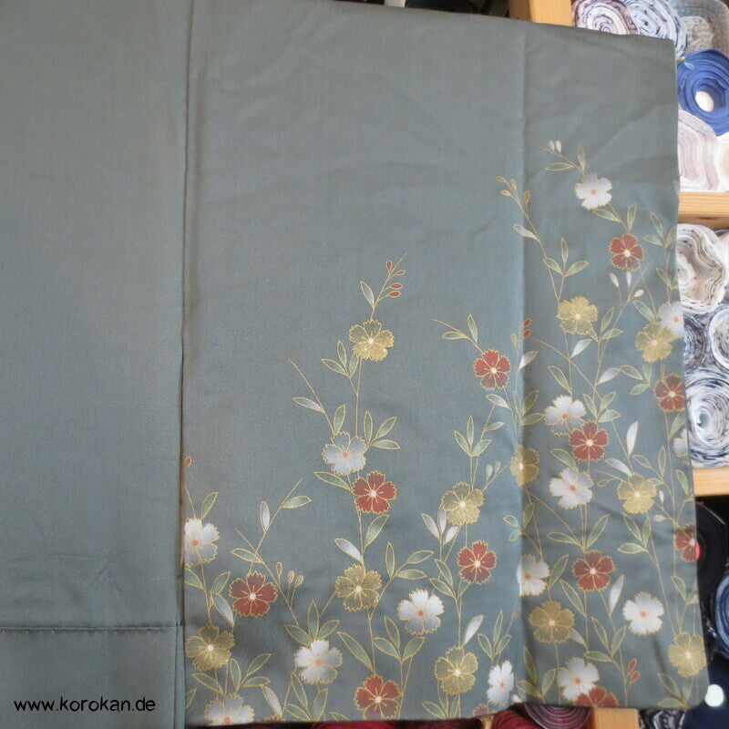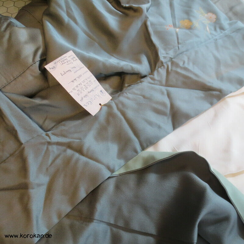 Vintage Homongi Kimono aus grauem Seidendamast mit Stickerei Schmetterlingen in einem Farbschwung, feinem oberen hellen Seidenfutter und unterem Hakkake Seidenfutter mit moosgrünem Bokashi Verlaufsrand.